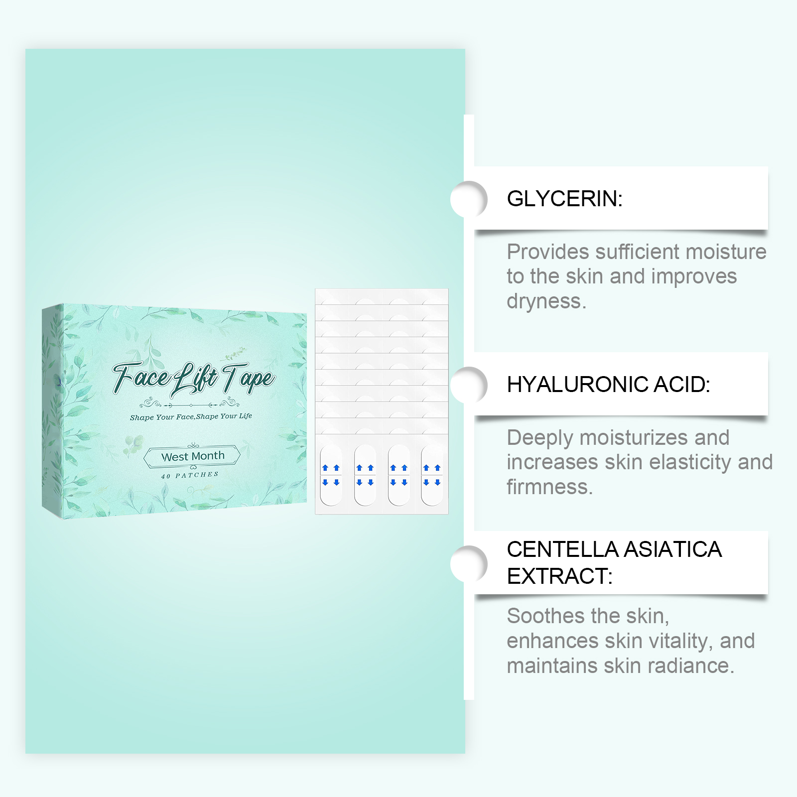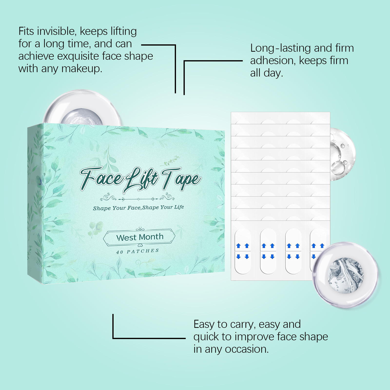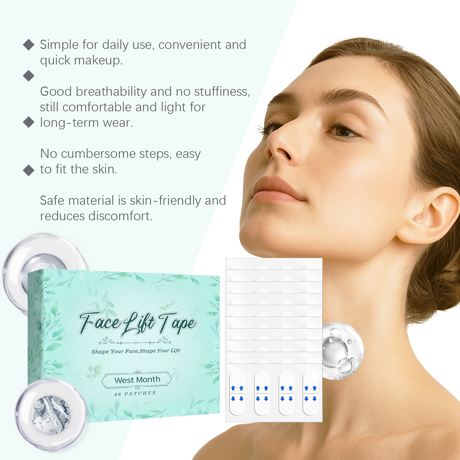 我们的面部隐形提拉贴,由甘油、羟乙基纤维素精心调配而成。专为有效收紧双下巴,显著提升脸颊,塑造纤细迷人的V形轮廓设计。使用方法极为便捷:清洁你的脸并保持干燥。将产品涂抹在需要提升的面部区域,并轻轻按压以确保其附着。并且可以与皮肤完美融合,不留痕迹,化妆后无感觉,全天持久隐形效果。快速改善面部轮廓显著收紧皮肤,改善面部形状,展现年轻状态。