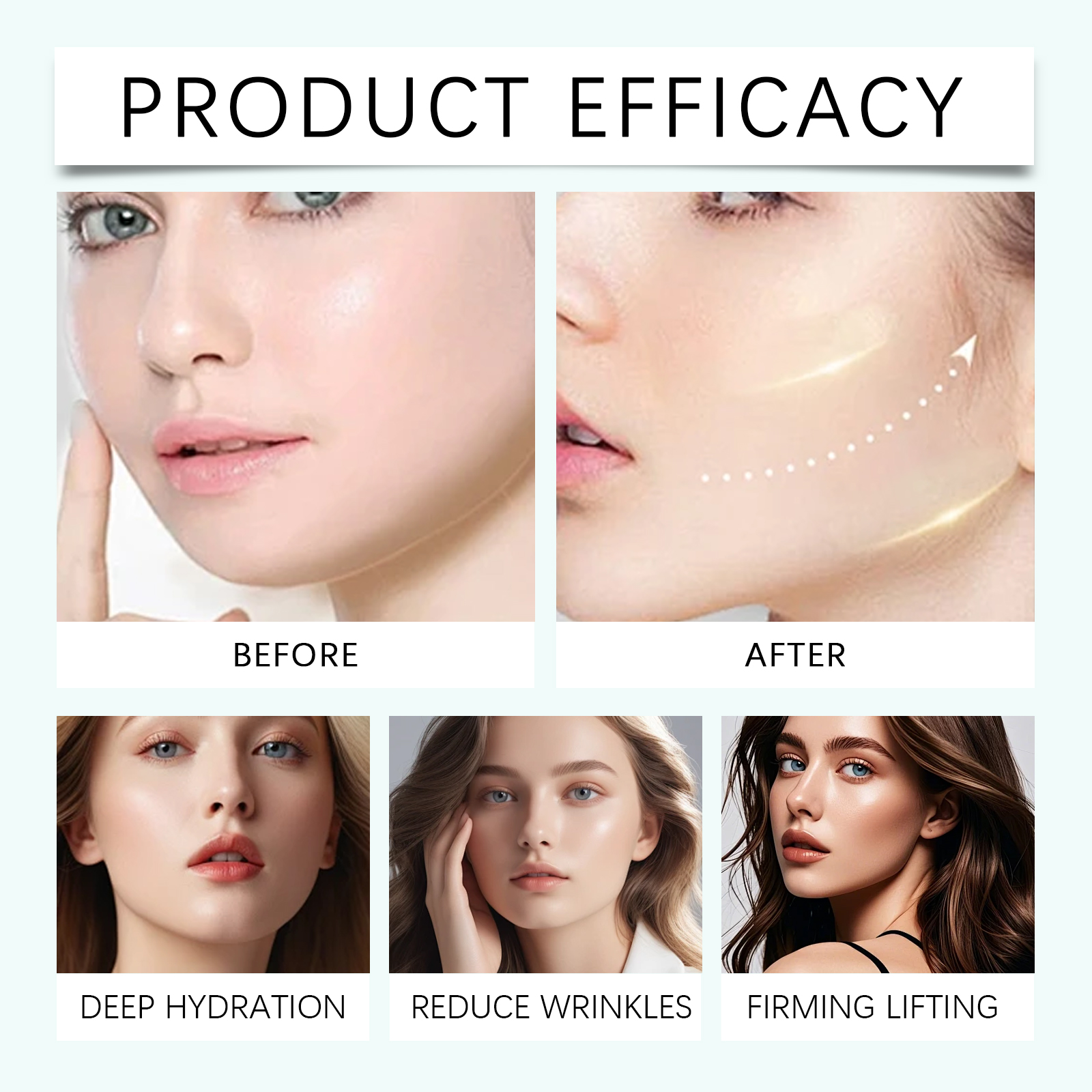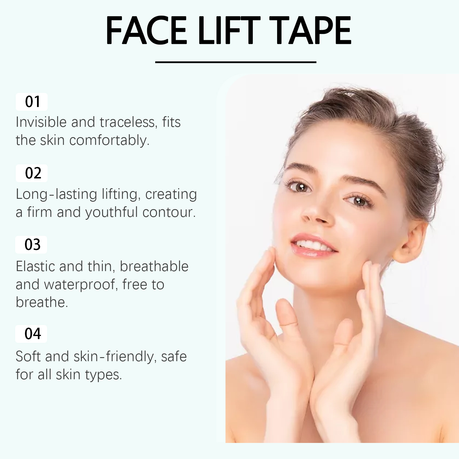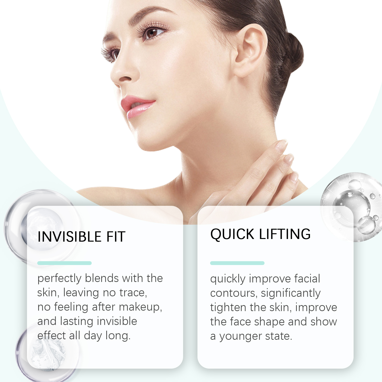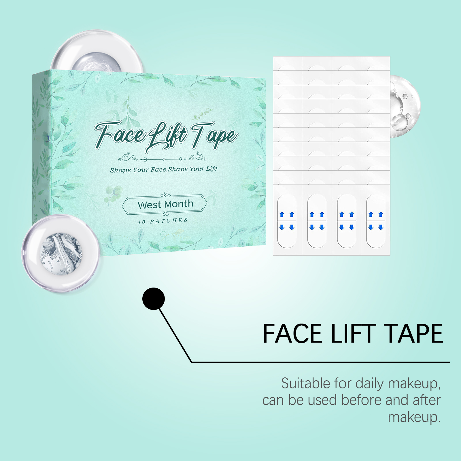 我们的面部隐形提拉贴,由甘油、羟乙基纤维素精心调配而成。专为有效收紧双下巴,显著提升脸颊,塑造纤细迷人的V形轮廓设计。使用方法极为便捷:清洁你的脸并保持干燥。将产品涂抹在需要提升的面部区域,并轻轻按压以确保其附着。并且可以与皮肤完美融合,不留痕迹,化妆后无感觉,全天持久隐形效果。快速改善面部轮廓显著收紧皮肤,改善面部形状,展现年轻状态。