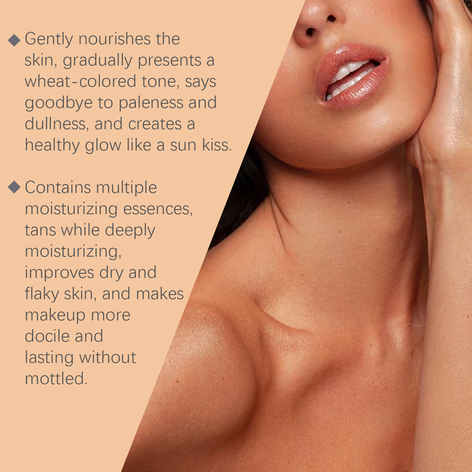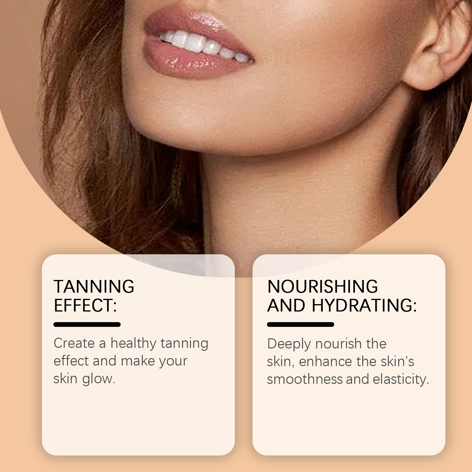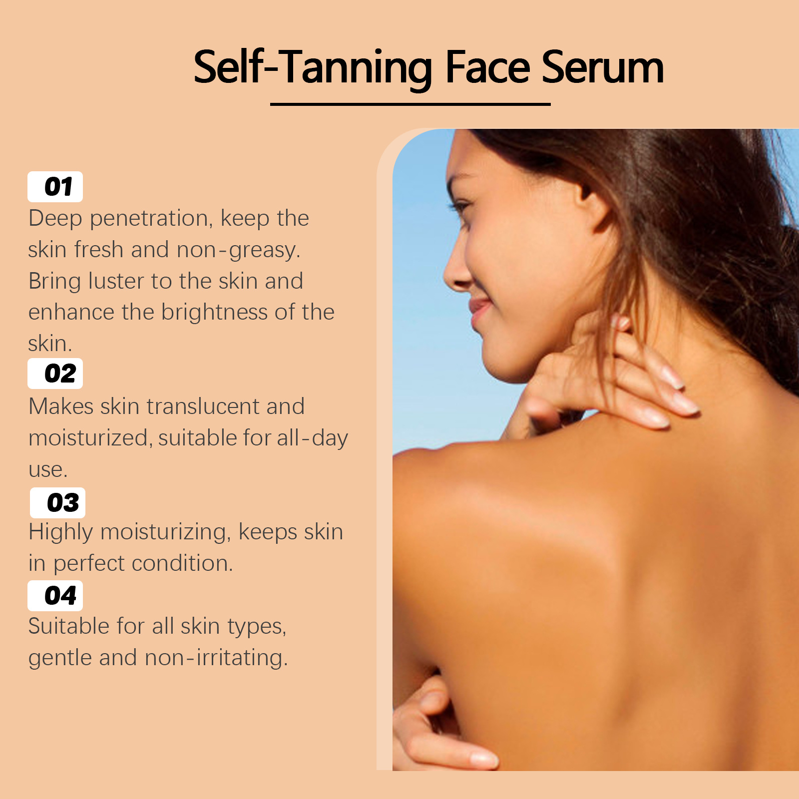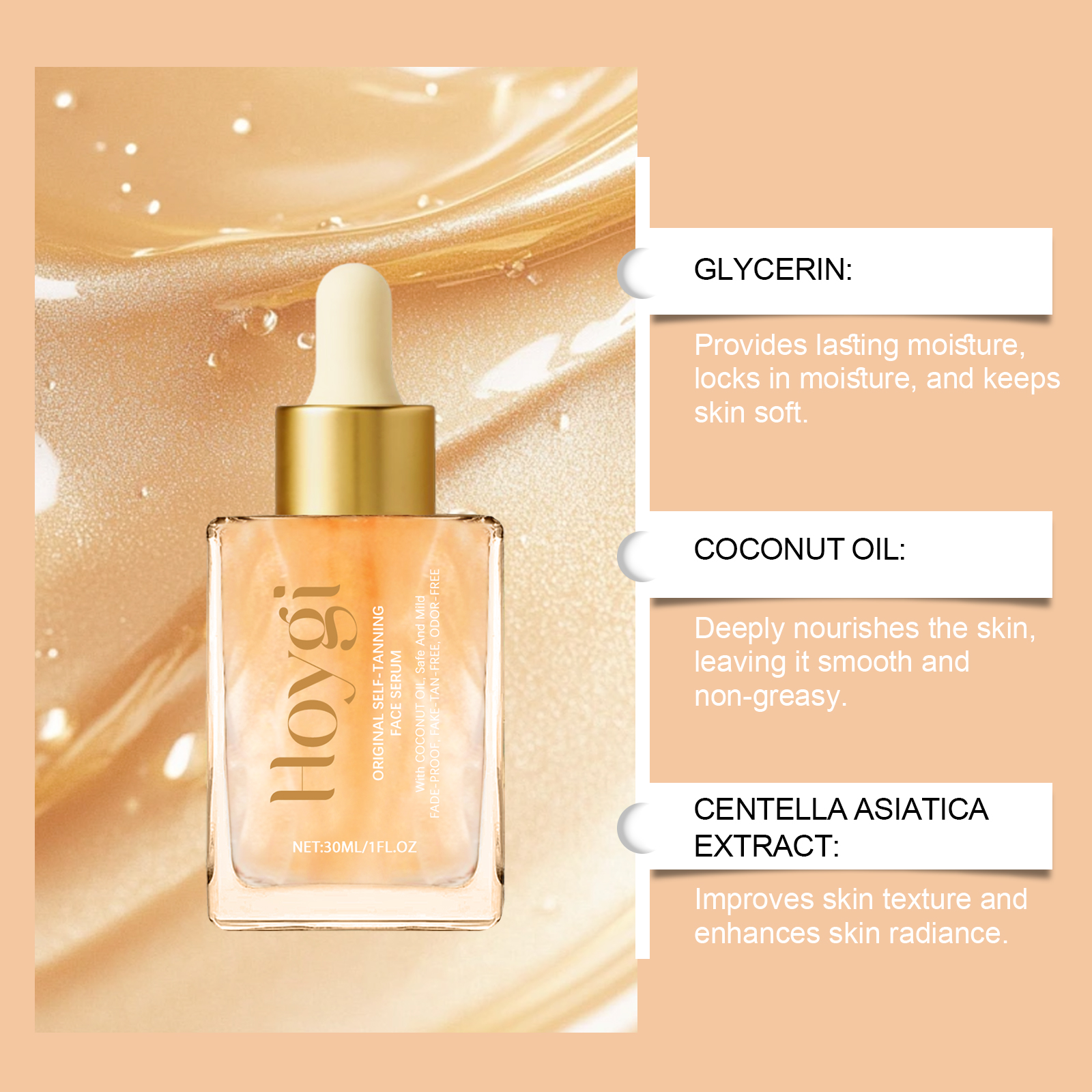 我们的助黑精华液,由椰子油、积雪草提取物精心调配而成。专为创造健康的晒黑效果,让你的皮肤焕发光彩设计。使用方法极为便捷:清洁你的脸部并保持干燥。将适量本品均匀涂抹于面部。轻轻按摩直至吸收。并且可以深层滋养肌肤,增强肌肤的平滑度和弹性。