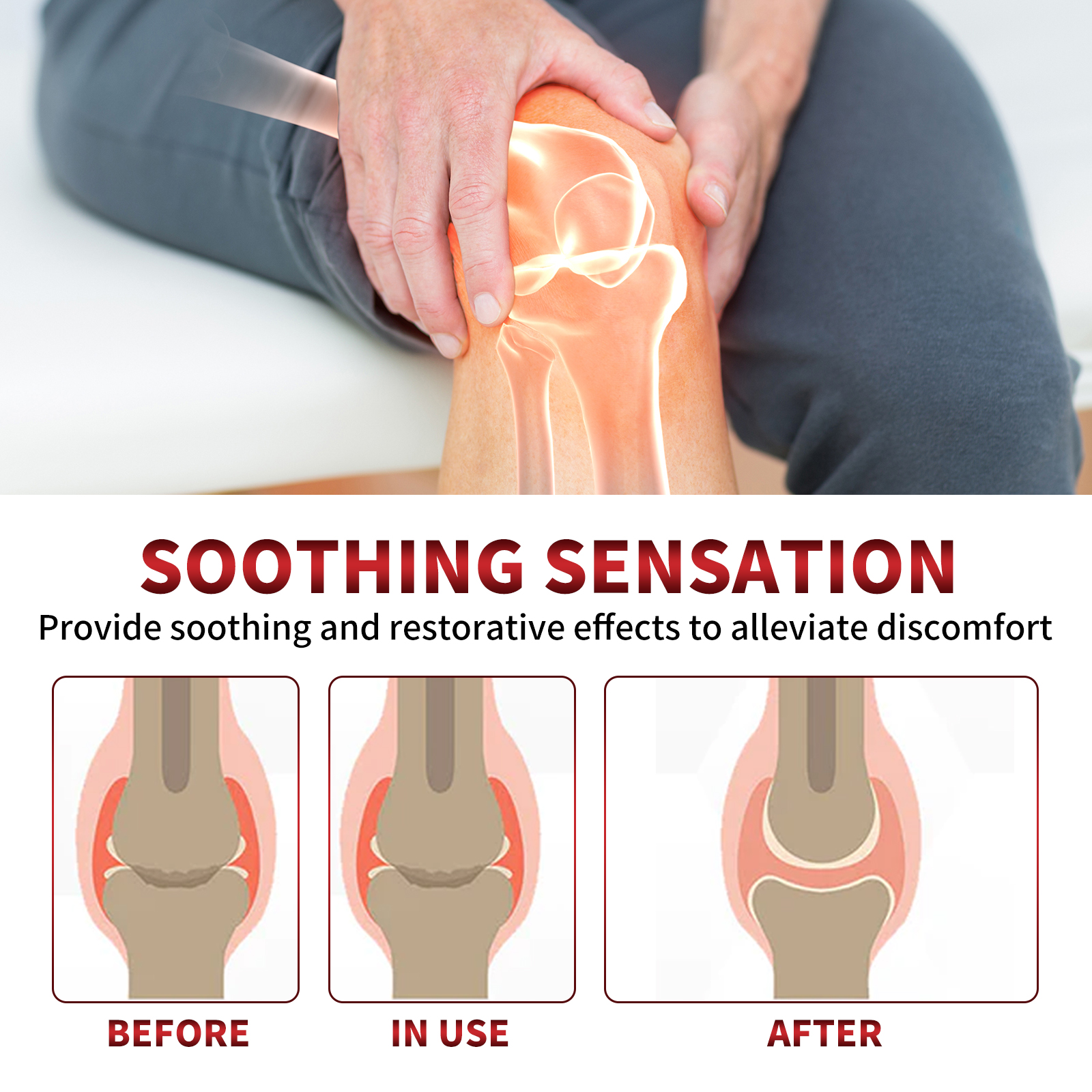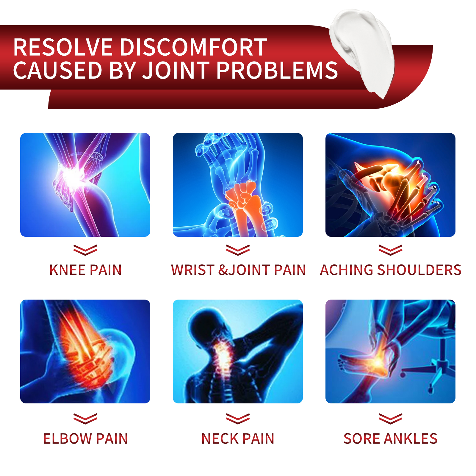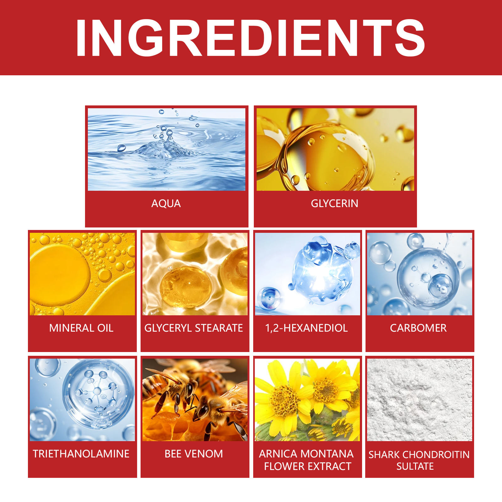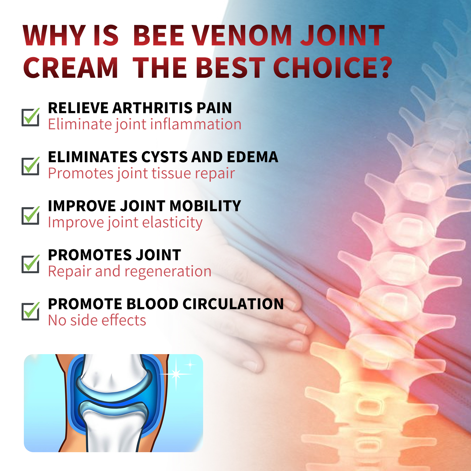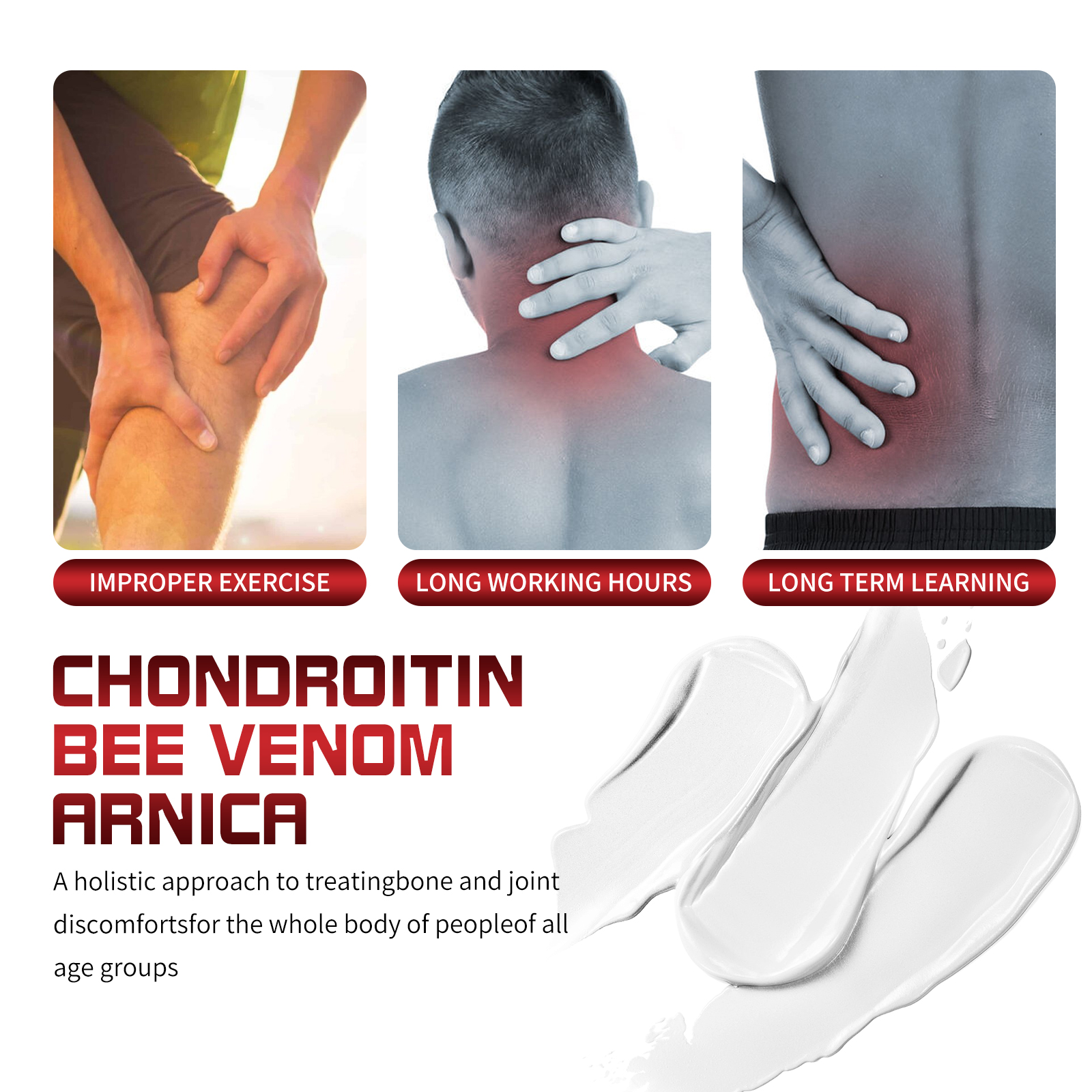 我们的蜂毒关节护理霜含有卡波姆、三乙醇胺、蜂毒。它可以深入关节组织,为关节提供营养和保护,促进关节健康;缓解骨骼和关节疼痛,消除炎症,促进关节组织修复。它的使用方法很简单:洗净皮肤表面,取适量产品涂于关节处,轻轻按摩,等待15分钟直至完全吸收。可以缓解关节疼痛,消除关节炎,消除囊肿和水肿,促进关节组织修复,改善关节灵活度,促进血液循环。