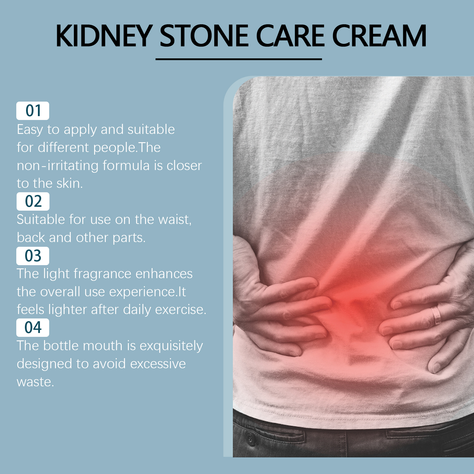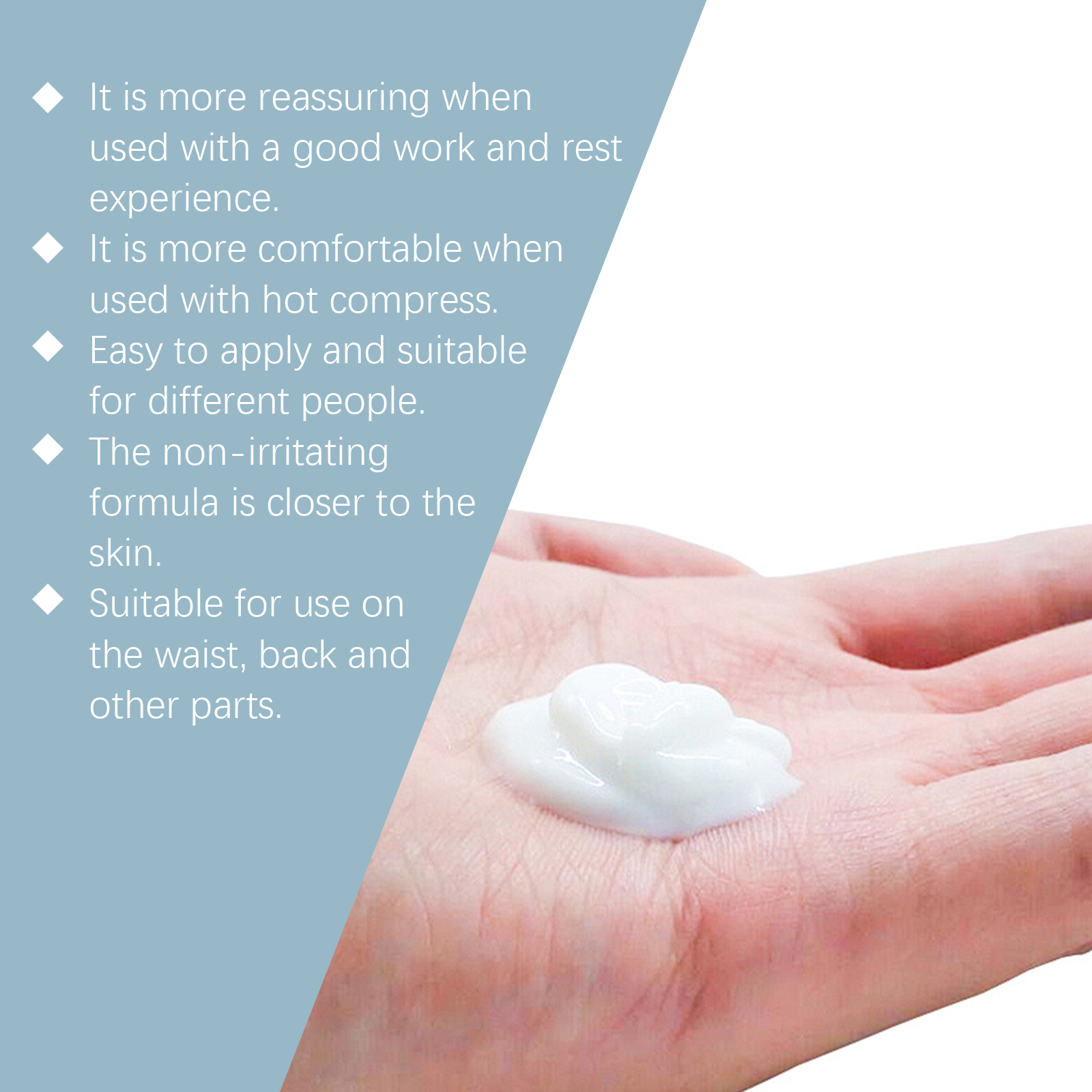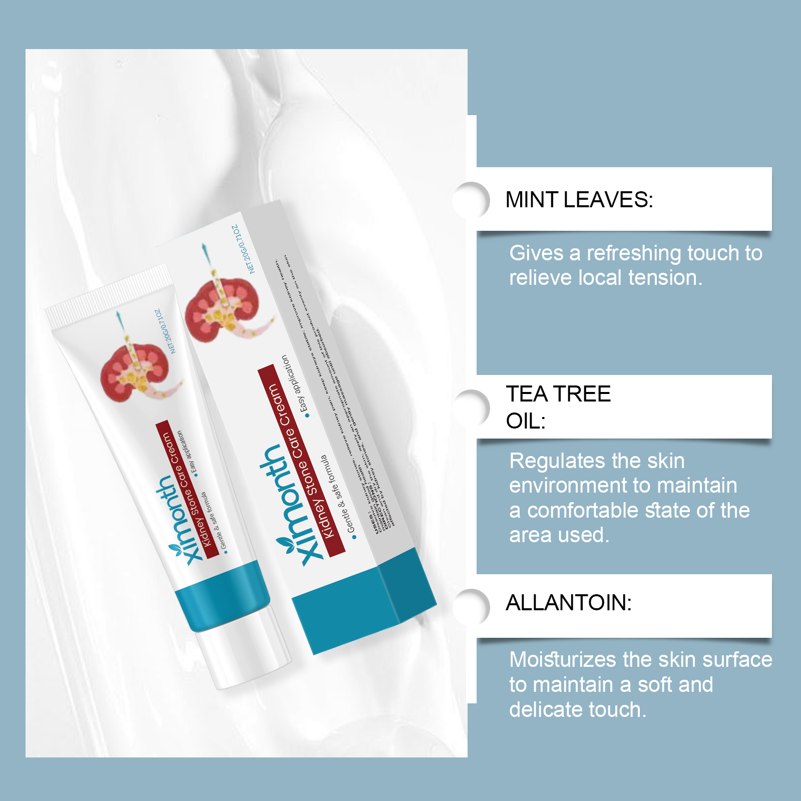我们的身体舒缓膏,由甘油、矿油、甘油硬脂酸酯精心调配而成。专为缓解紧张和放松不适部位,轻松享受日常护理设计。使用方法极为便捷:清洁并擦干皮肤,将适量的本品均匀涂抹在受肾结石影响的皮肤上,轻轻按摩直到吸收。并且可以随时随地使用,无需工具,使用后清新舒适,提升使用体验。