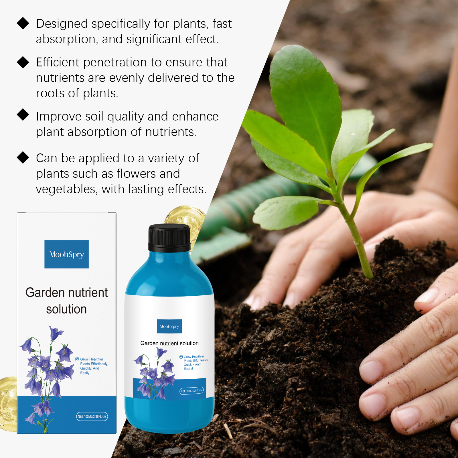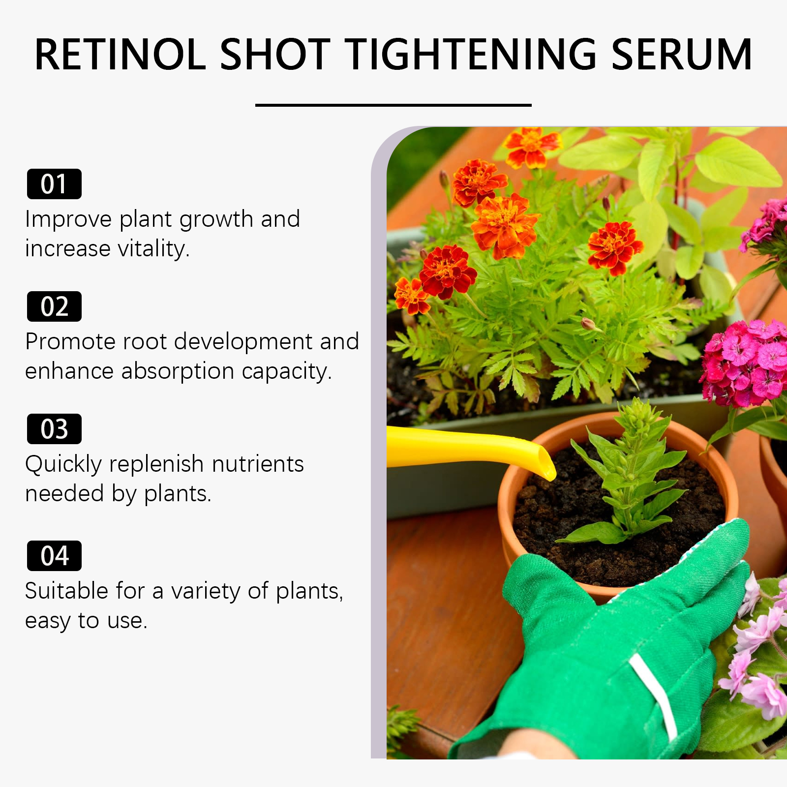 我们的花卉浓缩营养液,由甘油、泛醇、PCA 钠精心调配而成。专为有效改善植物健康,促进快速生长设计。使用方法极为便捷:拧开瓶盖,轻轻挤压瓶子,然后将液体均匀地滴在植物周围的盆土表面。浇水直到盆土完全湿润。使用时请戴手套,避免接触皮肤。并且可以改善根系发育,增强植物吸水能力。