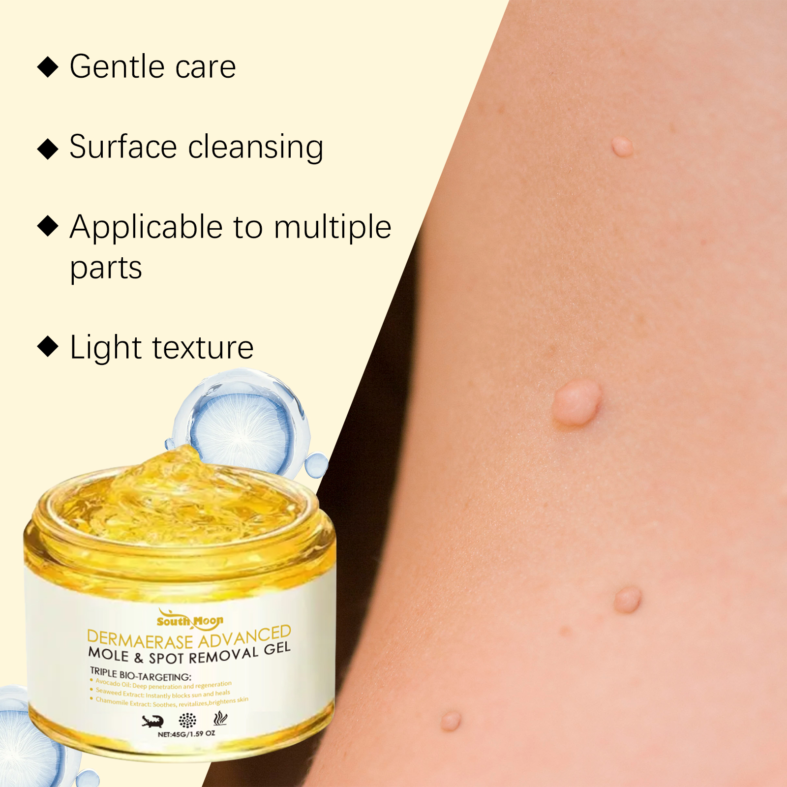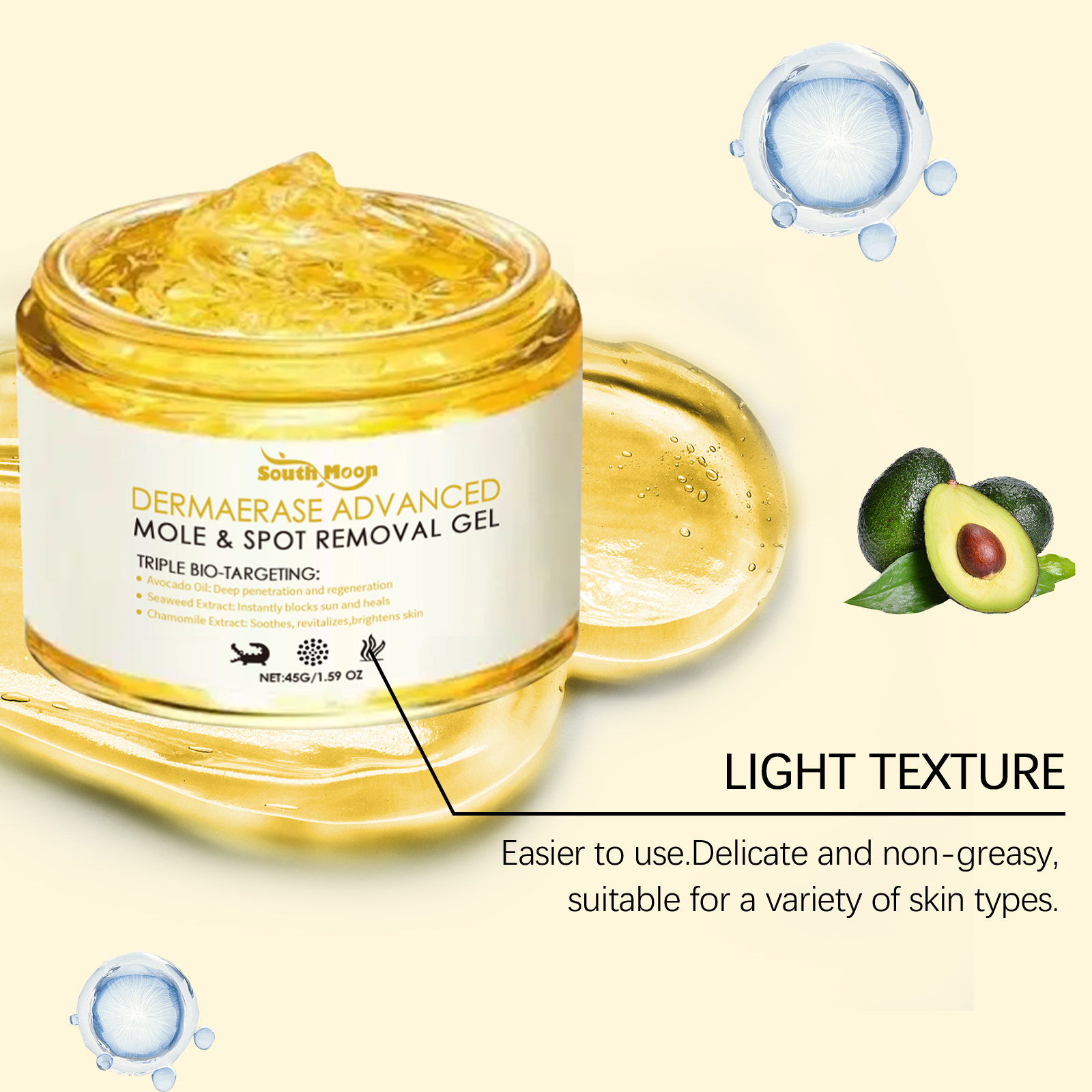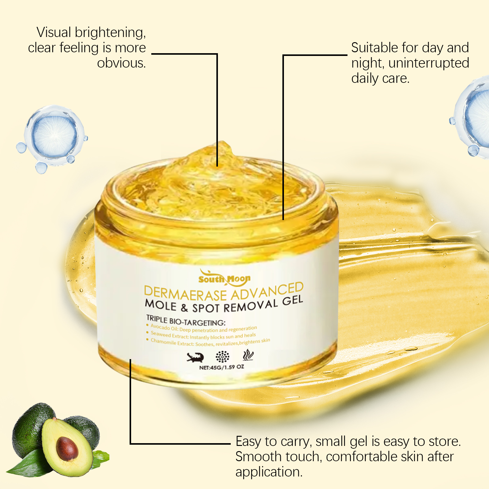 我们的皮肤护理凝胶,由鳄梨油、海藻提取物、洋甘菊精心调配而成。专为滋润角质层,保持皮肤柔软光滑,调节皮肤表面的油和水,呈现清爽的外观设计。使用方法极为便捷:清洁并擦干你的皮肤,将适量本品均匀涂抹于有痣、黑斑和其他问题的受影响区域。轻轻按摩直至吸收。并且它可以更舒适地贴合皮肤,改善外观,使其更清晰。满足各种使用需求。良好的延展性,轻量应用和快速吸收。