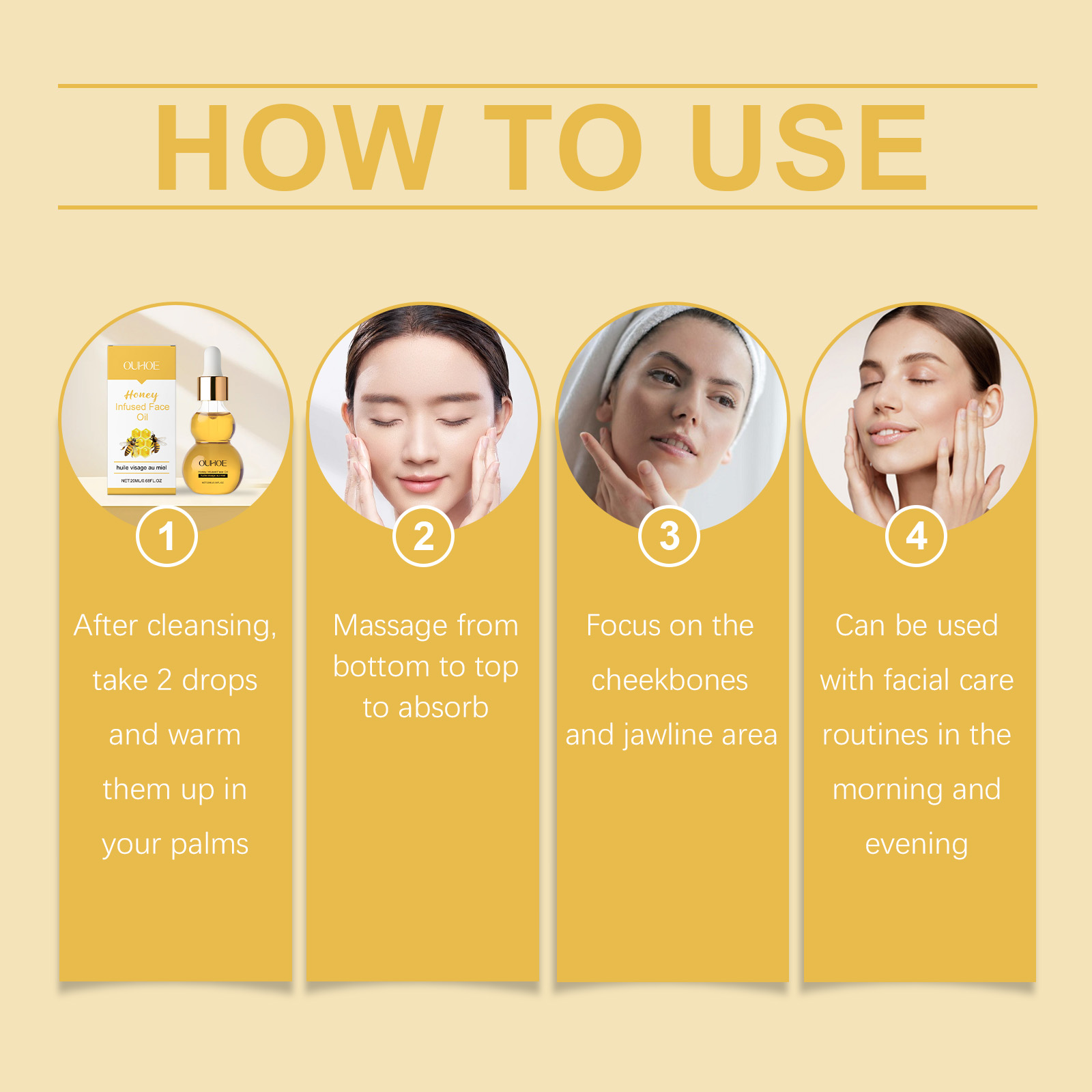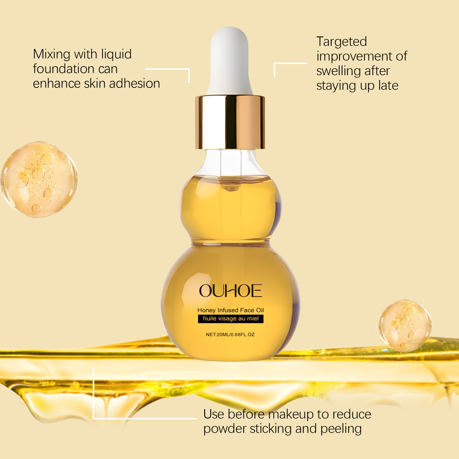 我们的蜂蜜精华油,由氢化蓖麻油、生育酚、蜂蜜精心调配而成。专为改善下颌线的紧致和平滑设计。使用方法极为便捷:清洁后,取2滴并温暖在手掌中,从下到上按摩以吸收,专注于颧骨和下颌区域,可以在早晚的护肤程序中使用。并且轻薄质地,避免痘痘和粘腻感。