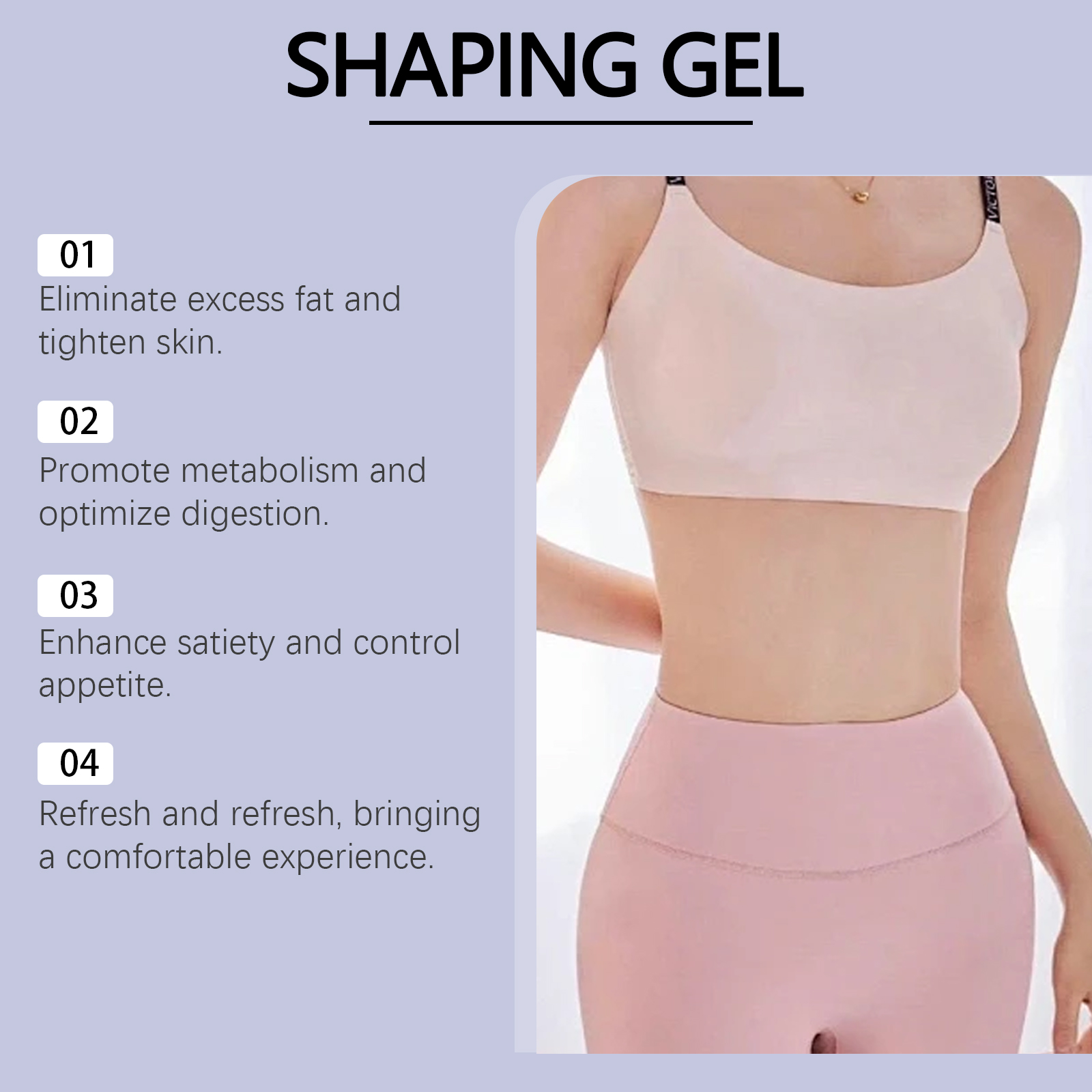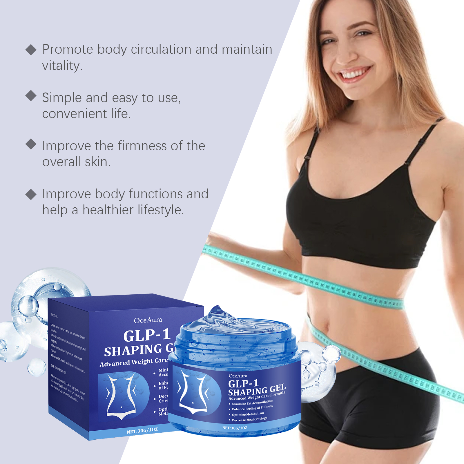 我们的身体护理凝胶,由薄荷叶、乙酰基六肽-8、透明质酸精心调配而成。专为促进脂肪分解,消除多余脂肪,塑造流线型身材设计。使用方法极为便捷:清洁身体并保持干燥,将适量的本品均匀涂抹于身体上,轻轻按摩直至吸收。并且可以增强身体代谢,帮助燃烧卡路里。