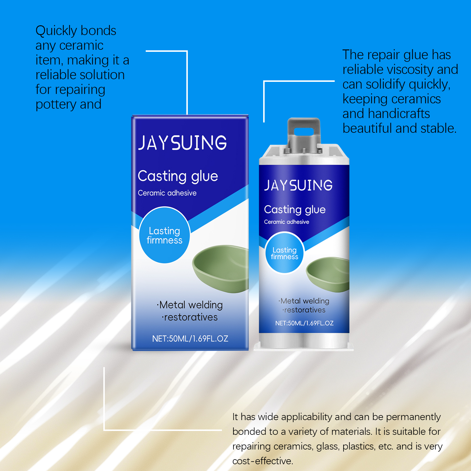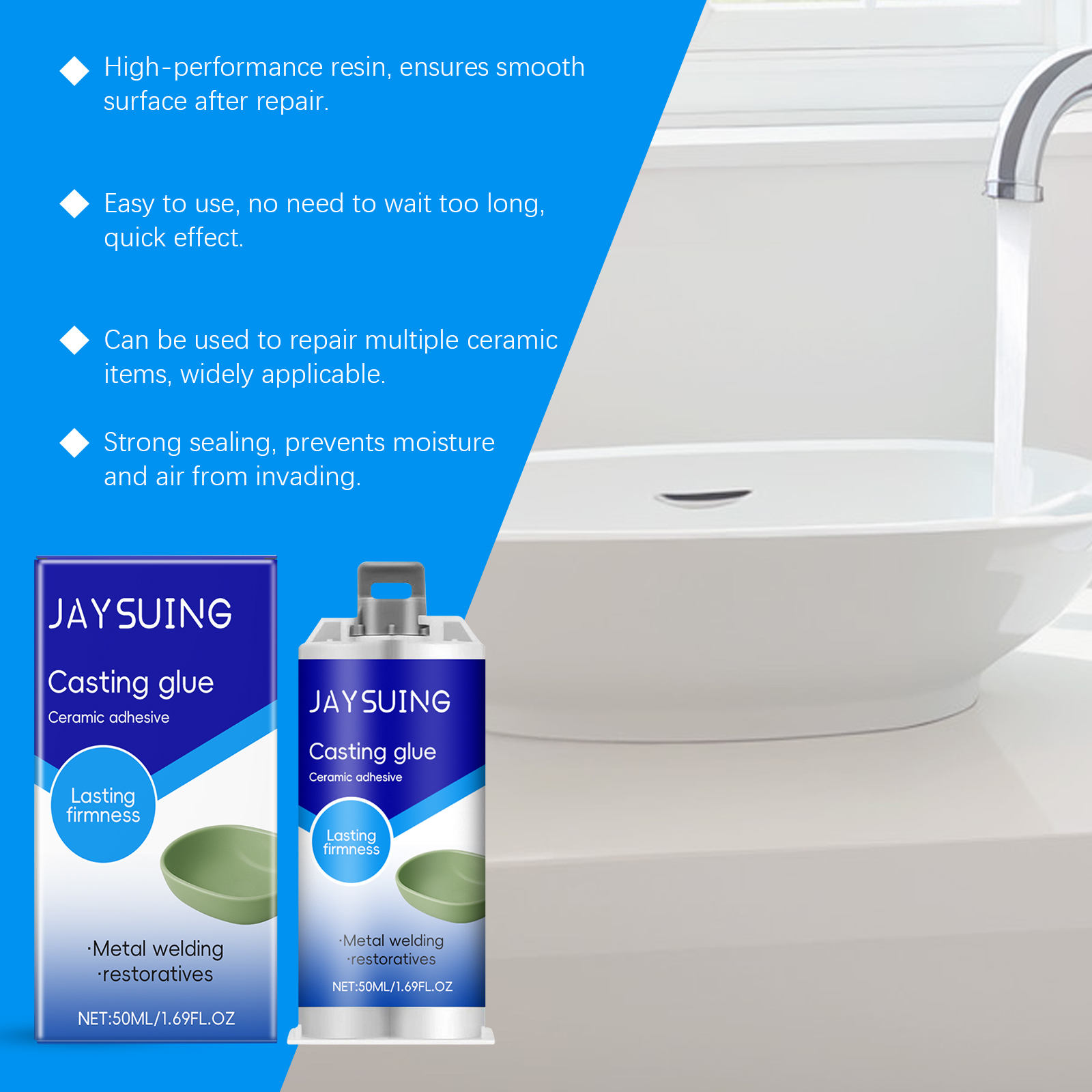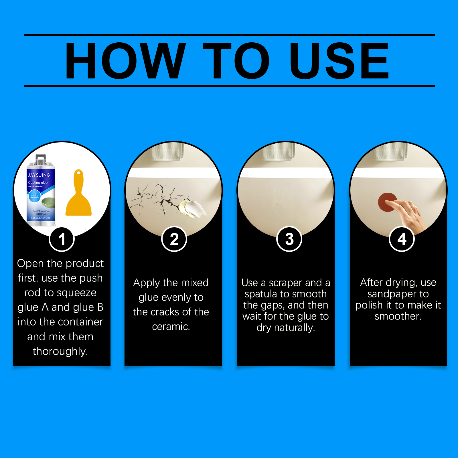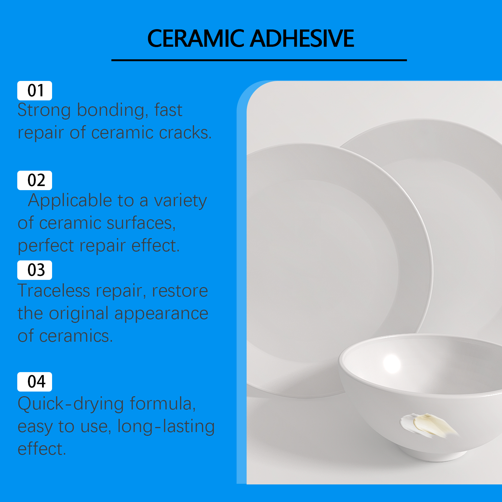 我们的陶瓷修补剂,由A胶:环氧树脂、高分子树脂,B胶:固化剂、添加剂精心调配而成。专为修复后无痕迹,恢复完整的陶瓷质感设计。使用方法极为便捷:首先打开产品使用推杆将胶水A和胶水B挤入容器并充分混合。将混合的胶水均匀地涂在陶瓷的裂缝上。使用刮刀和铲子来平滑缝隙,然后等待胶水自然干燥。干燥后,使用砂纸将其抛光,使其更光滑。并且它可以快速粘合陶瓷表面强度高,持久耐用。适用于各种材料,如陶瓷、瓷器、瓷砖等。