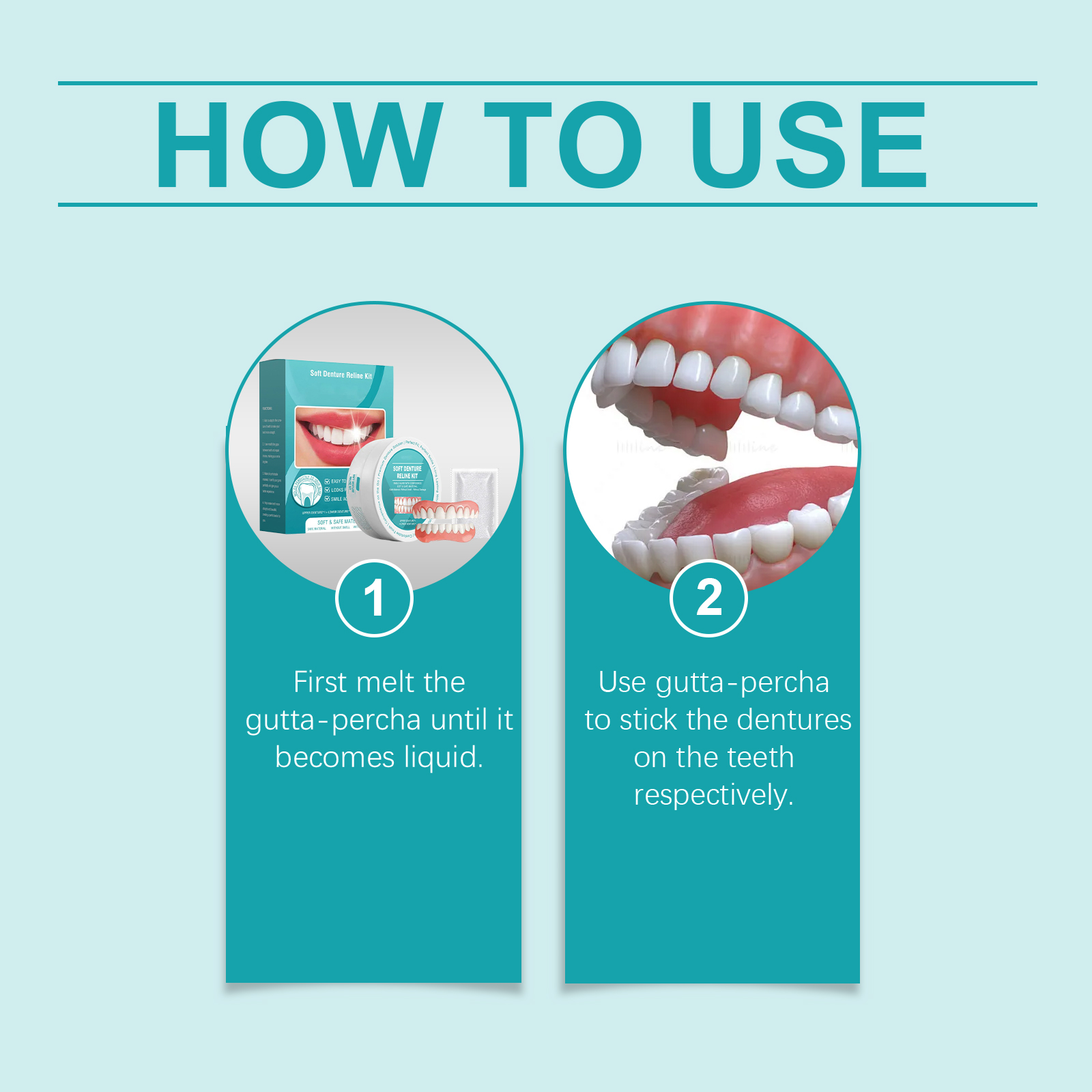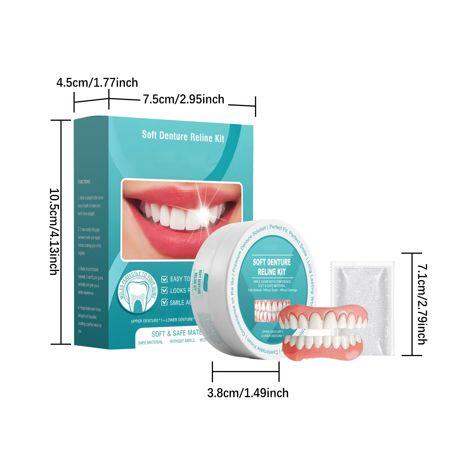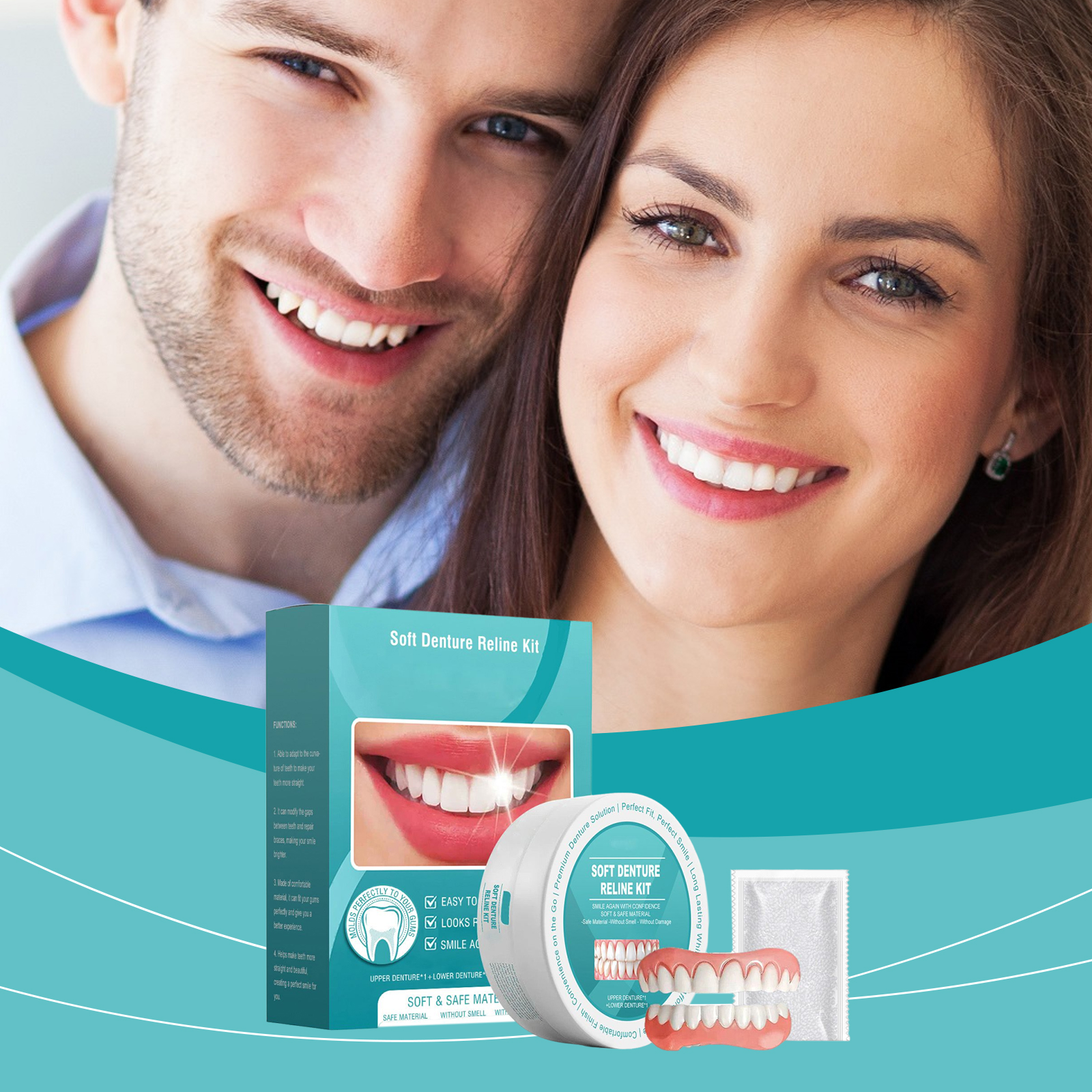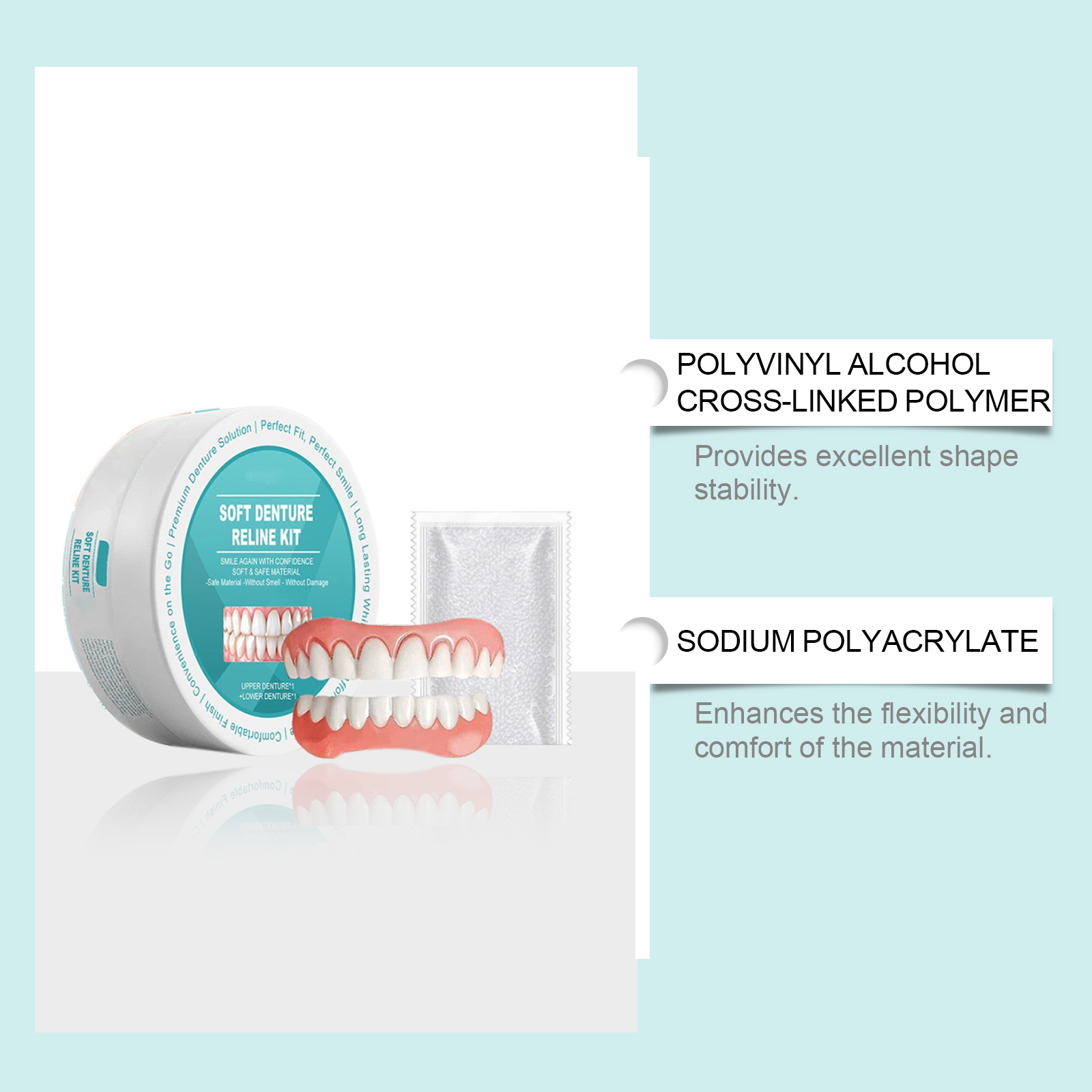 我们的假牙修饰套装,由聚乙烯醇交联聚合物、聚丙烯酸钠精心调配而成。专为精准贴合和带来自然感觉设计。使用方法极为便捷:首先将黄麻胶熔化直到它变成液体。分别用软木胶将假牙粘在牙齿上。并且它可以立即提升你的外貌,易于使用且立竿见影。