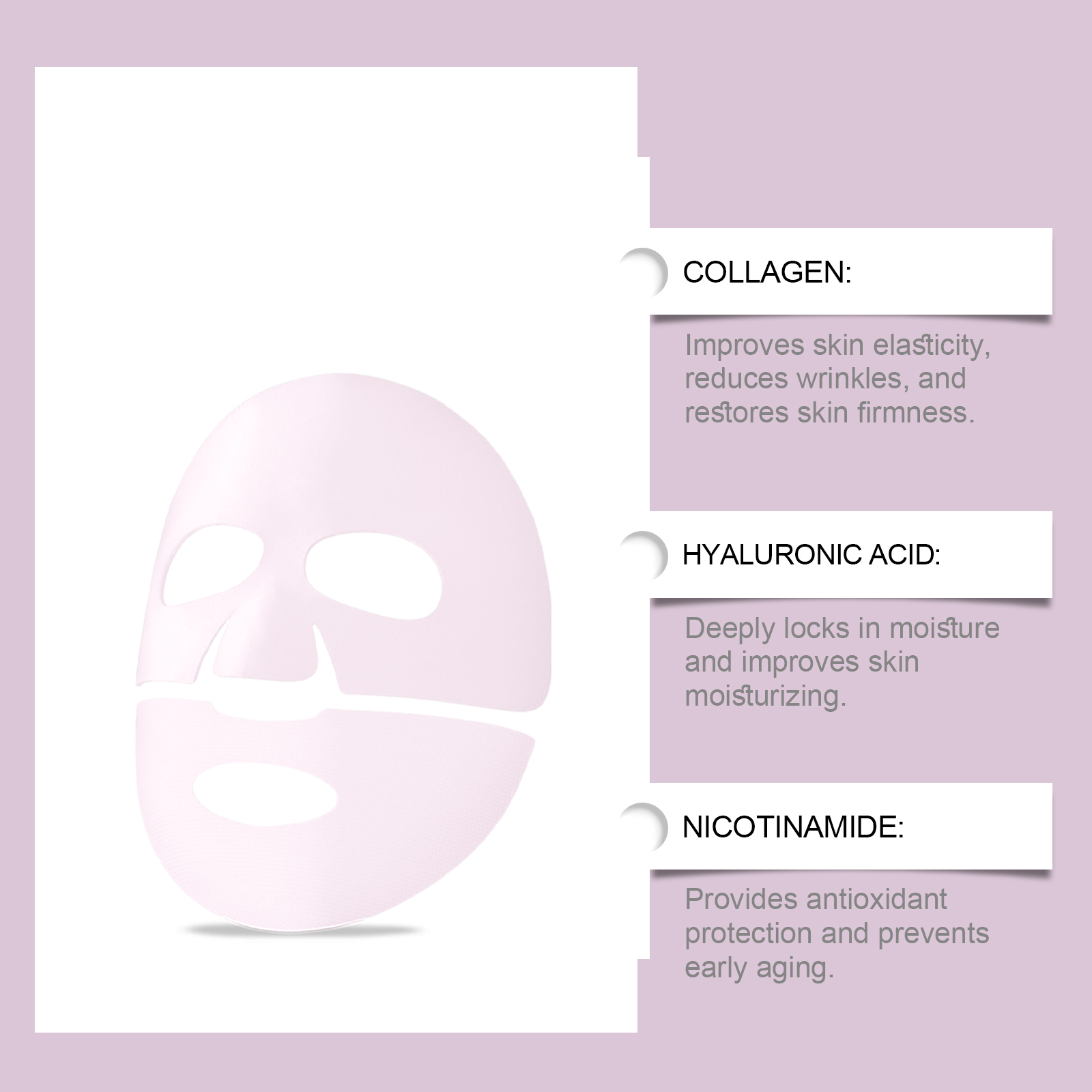 我们的胶原蛋白保湿面膜(袋装)含有胶原蛋白、透明质酸、烟酰胺。它可以增强肌肤天然弹性,恢复肌肤紧致光滑。它的使用方法很简单:1. 完全清洁面部皮肤;2. 取出面膜,贴在面部肌肤上静置15-20分钟,让精华液完全吸收。3. 取下面膜,用清水清洗。高效成分迅速渗透肌肤,显著减少皱纹和细纹。持续释放滋养成分,深层滋养肌肤,改善肤质。