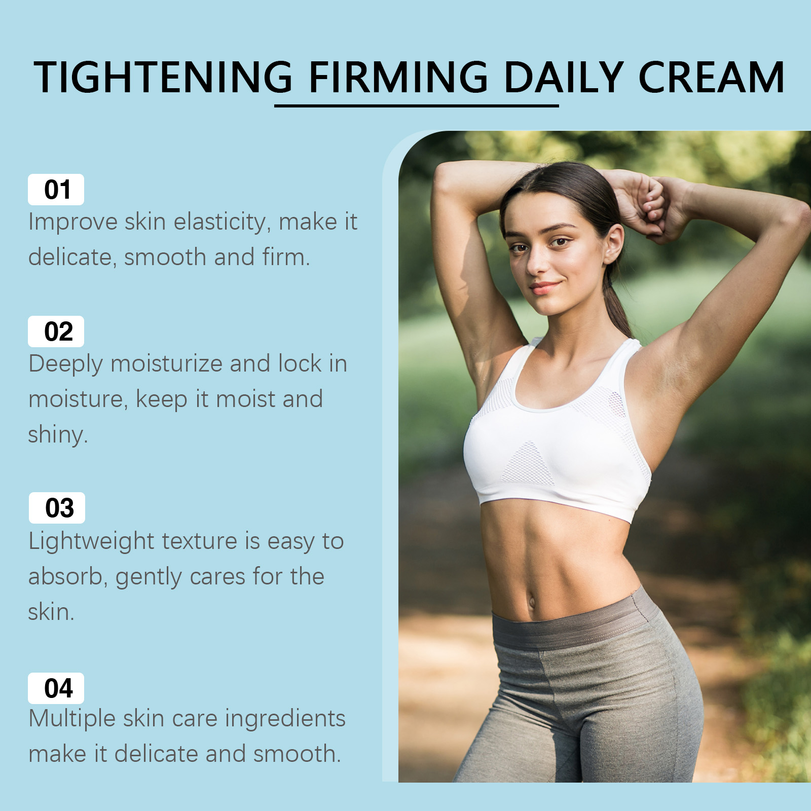 我们的滋养紧致肌肤霜,由透明质酸、视黄醇精心调配而成。专为改善松弛并塑造紧致轮廓设计。使用方法极为便捷:清洁并擦干皮肤。取适量本品涂抹于皮肤。轻轻按摩以促进吸收。并且可持久保湿,使肌肤柔软细腻。