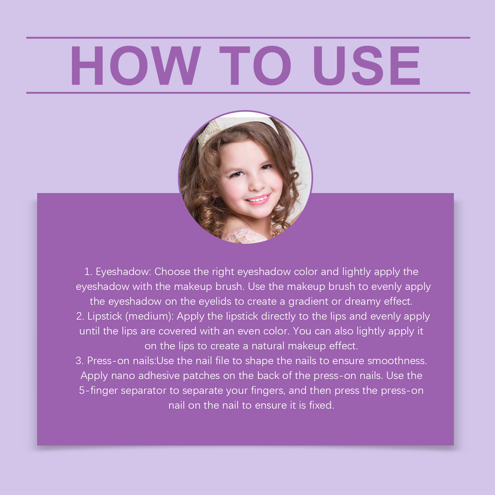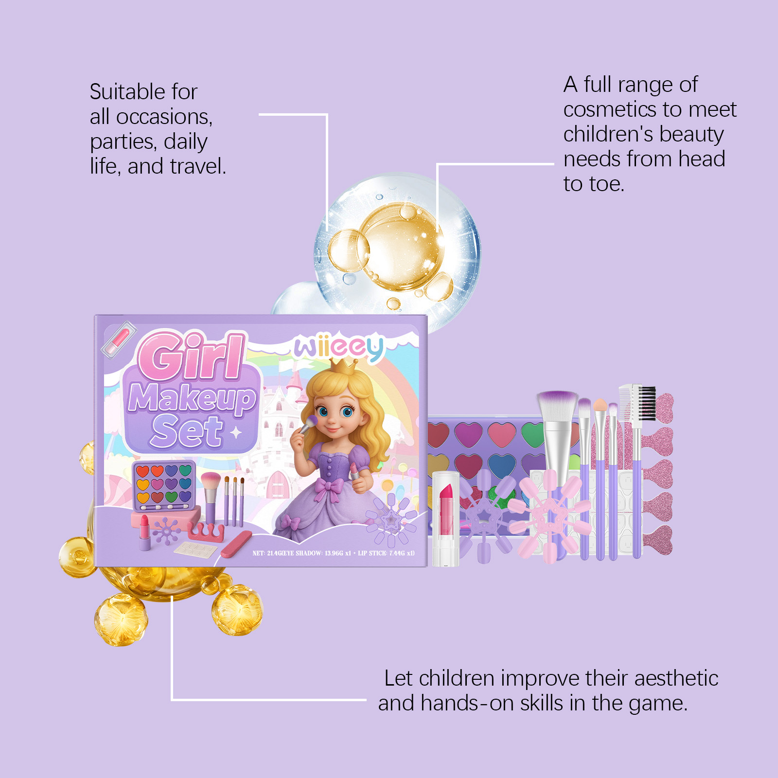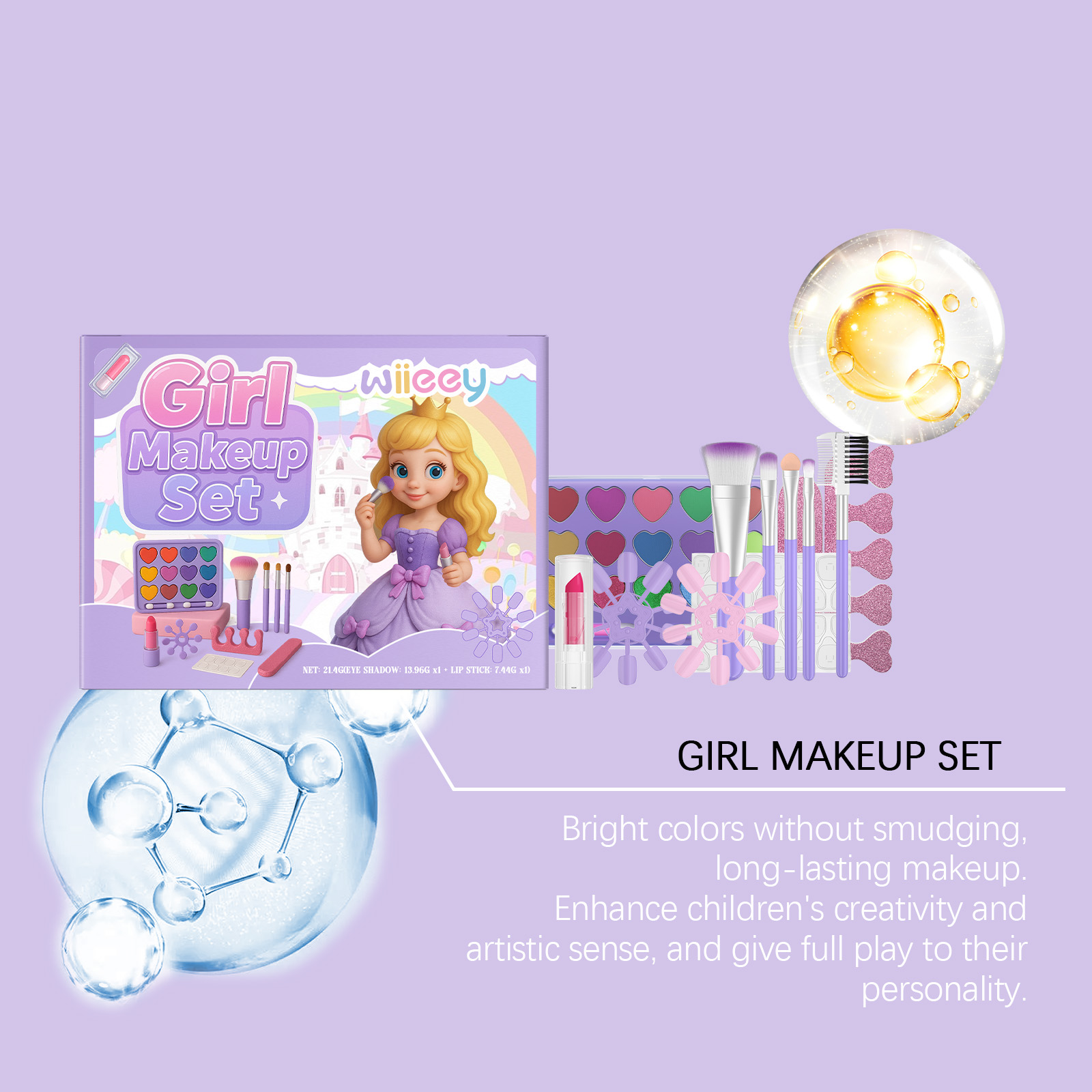 我们的儿童彩妆,由云母、矿油精心调配而成。专为满足不同化妆需求,打造独特风格设计。使用方法极为便捷:1.眼影:选择合适的眼影颜色,用化妆刷轻轻涂抹眼影。使用化妆刷均匀地将眼影涂抹在眼睑上,以创造渐变或梦幻效果。2.唇膏(中):直接将唇膏涂在嘴唇上,均匀涂抹直到嘴唇覆盖均匀的颜色。你也可以轻轻涂抹在嘴唇上,创造自然的化妆效果。3.穿戴甲:使用指甲锉来修剪指甲,确保光滑。在贴片指甲的背面贴上纳米胶贴片。使用五指分离器,将手指分开然后将贴片指甲按在指甲上,确保固定。并且可以充满梦幻元素,吸引小女孩的爱。