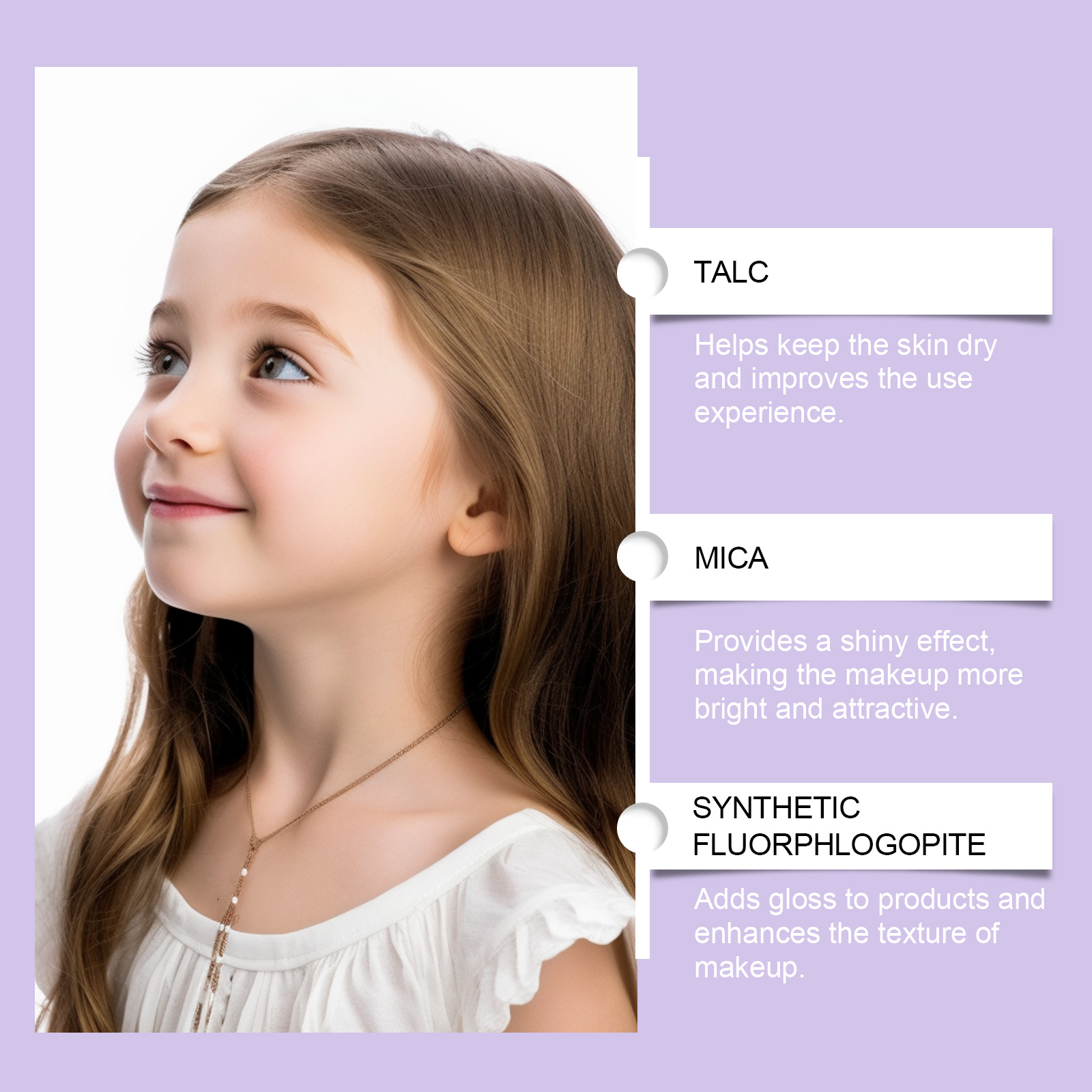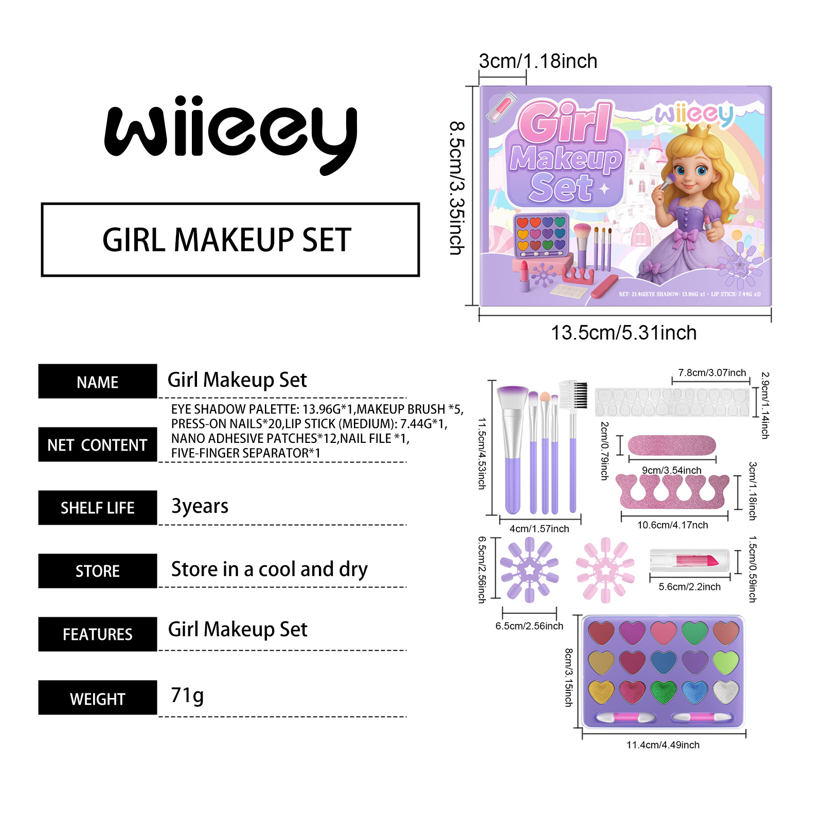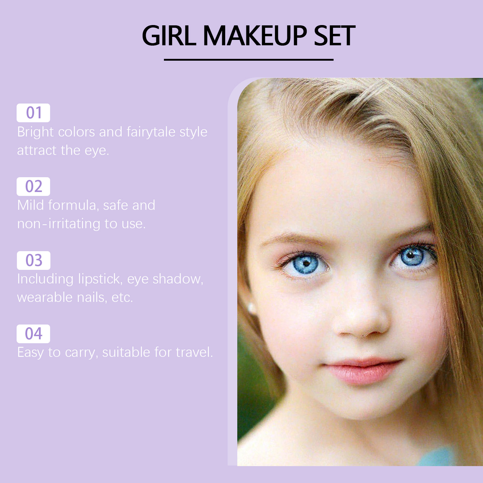 我们的儿童彩妆,由云母、矿油精心调配而成。专为满足不同化妆需求,打造独特风格设计。使用方法极为便捷:1.眼影:选择合适的眼影颜色,用化妆刷轻轻涂抹眼影。使用化妆刷均匀地将眼影涂抹在眼睑上,以创造渐变或梦幻效果。2.唇膏(中):直接将唇膏涂在嘴唇上,均匀涂抹直到嘴唇覆盖均匀的颜色。你也可以轻轻涂抹在嘴唇上,创造自然的化妆效果。3.穿戴甲:使用指甲锉来修剪指甲,确保光滑。在贴片指甲的背面贴上纳米胶贴片。使用五指分离器,将手指分开然后将贴片指甲按在指甲上,确保固定。并且可以充满梦幻元素,吸引小女孩的爱。