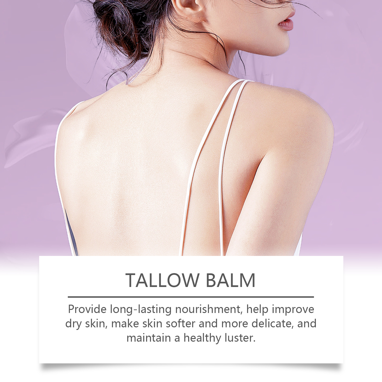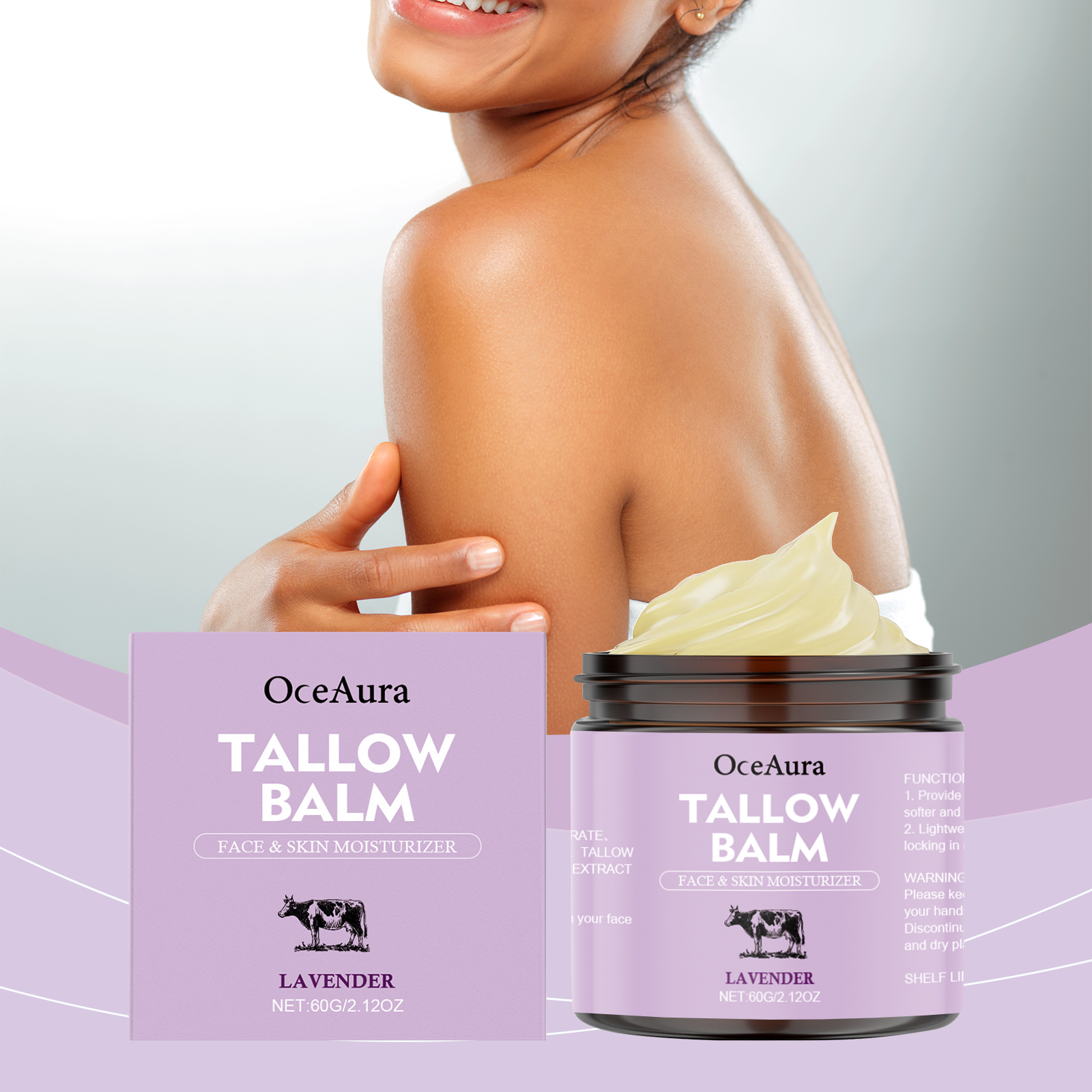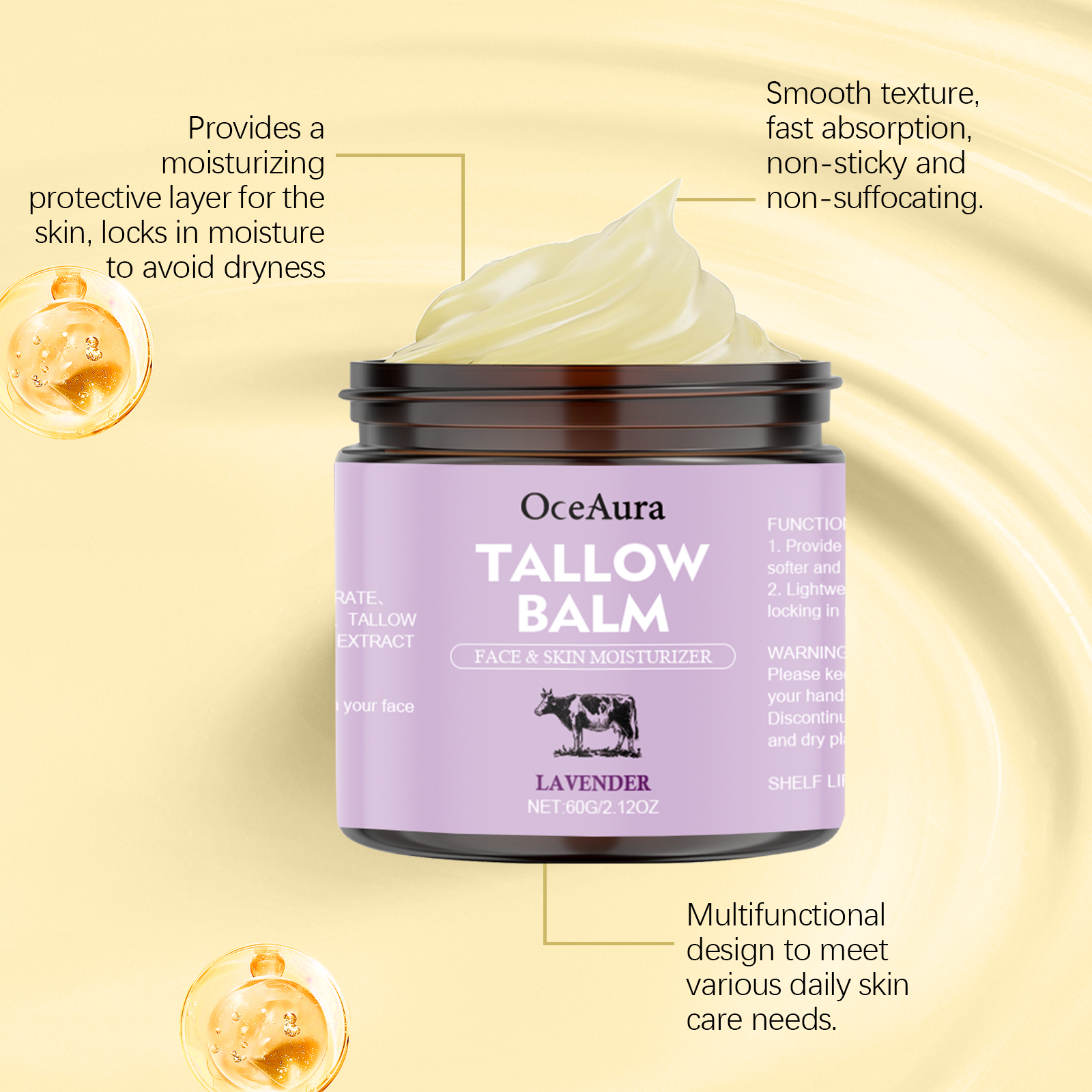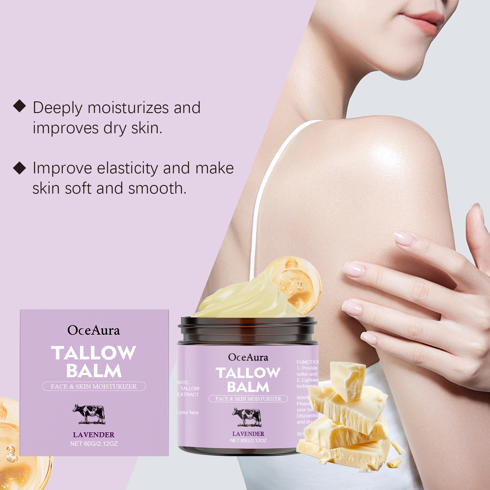 我们的薰衣草牛脂润肤霜,由甘油、矿油、甘油硬脂酸酯精心调配而成。专为提供持久的滋养,帮助改善干燥的皮肤,使皮肤更加柔软和细腻,并保持健康的光泽设计。使用方法极为便捷:彻底清洁皮肤并先擦干。取适量本品,均匀涂抹于面部、手部、腿部及背部皮肤,轻轻按摩以促进更好的吸收。并且可以适合面部、身体和手部使用,全方位滋润肌肤。为皮肤提供持久的保湿,使干燥的皮肤感觉更舒适。