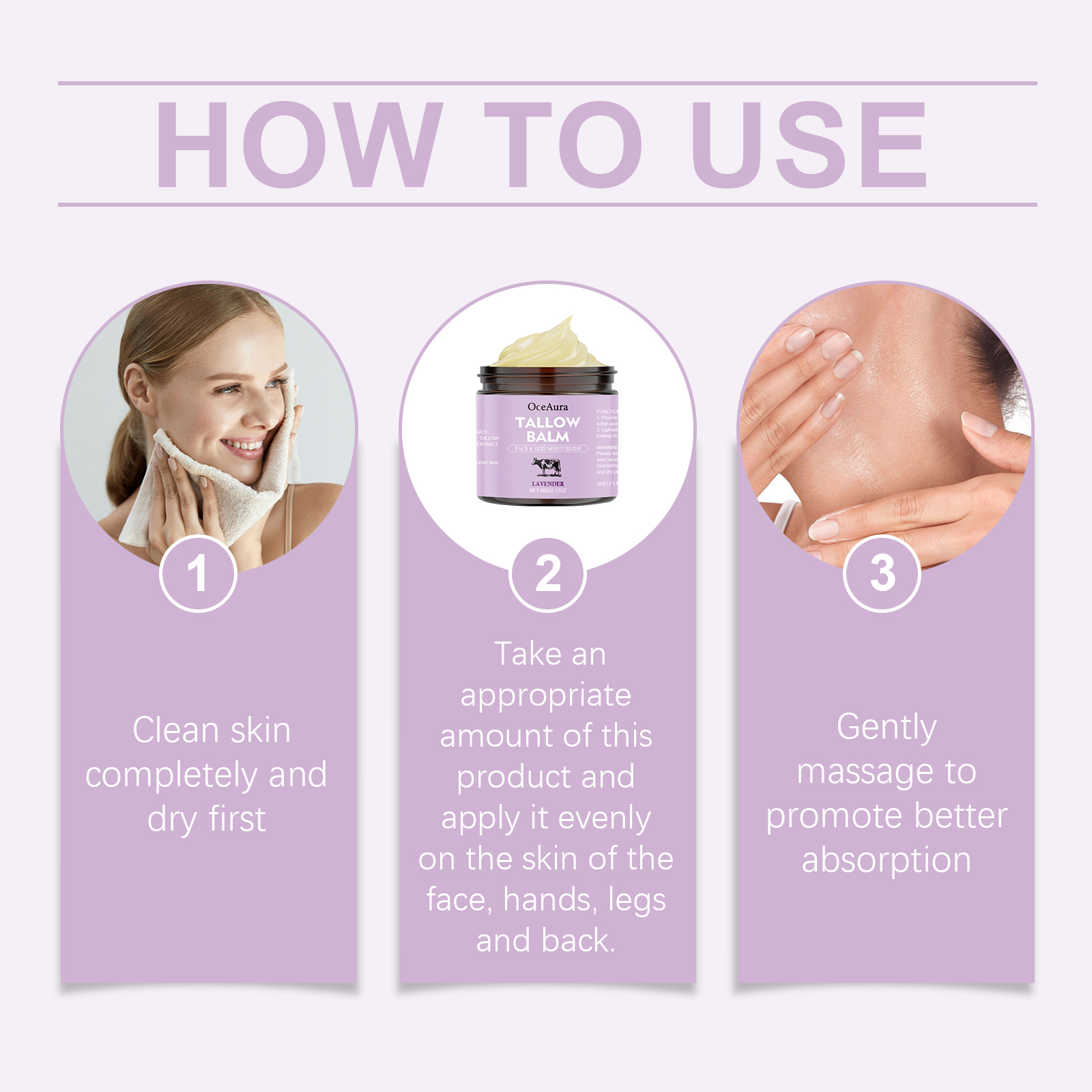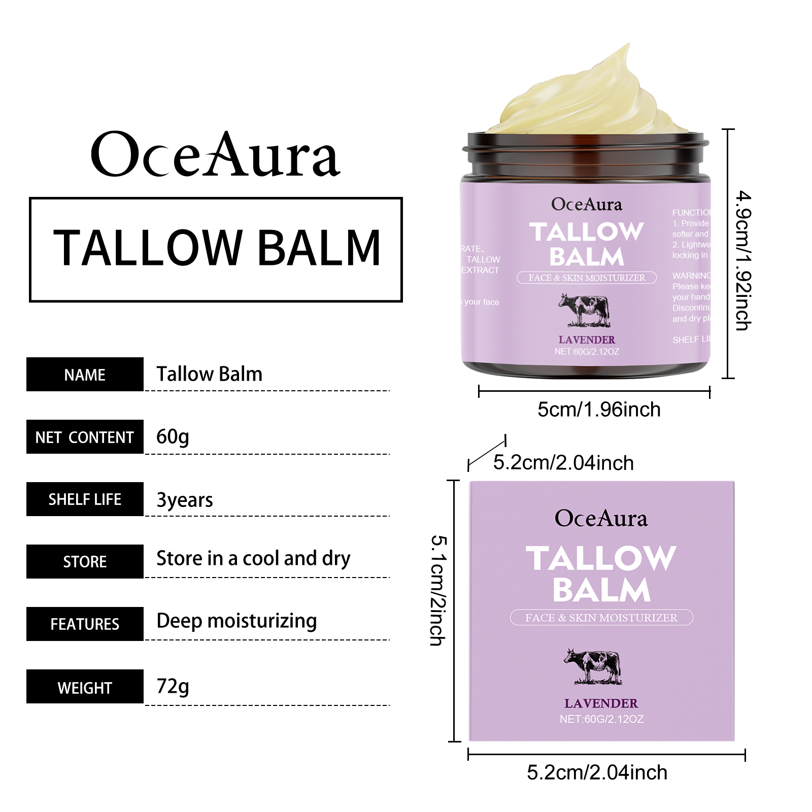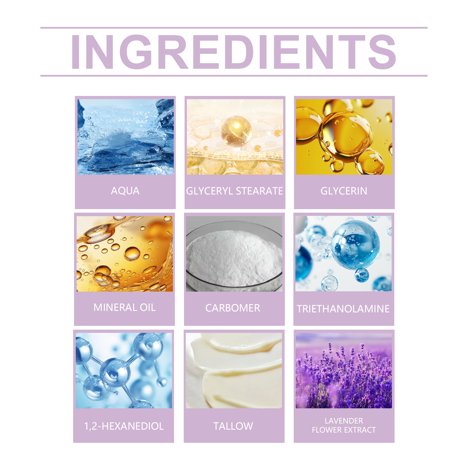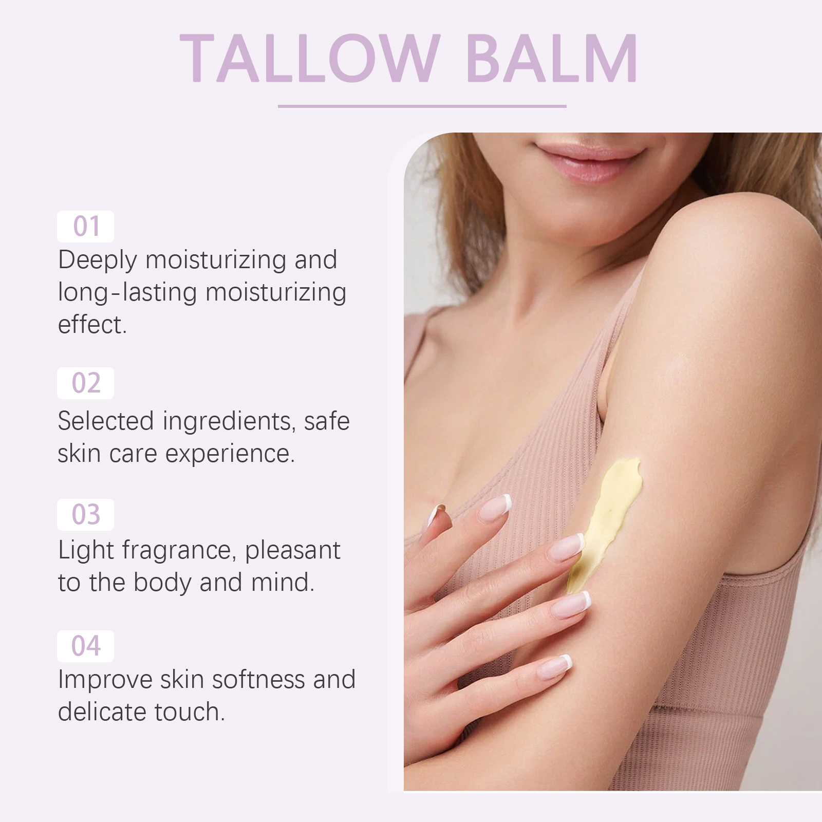 我们的薰衣草牛脂润肤霜,由甘油、矿油、甘油硬脂酸酯精心调配而成。专为提供持久的滋养,帮助改善干燥的皮肤,使皮肤更加柔软和细腻,并保持健康的光泽设计。使用方法极为便捷:彻底清洁皮肤并先擦干。取适量本品,均匀涂抹于面部、手部、腿部及背部皮肤,轻轻按摩以促进更好的吸收。并且可以适合面部、身体和手部使用,全方位滋润肌肤。为皮肤提供持久的保湿,使干燥的皮肤感觉更舒适。