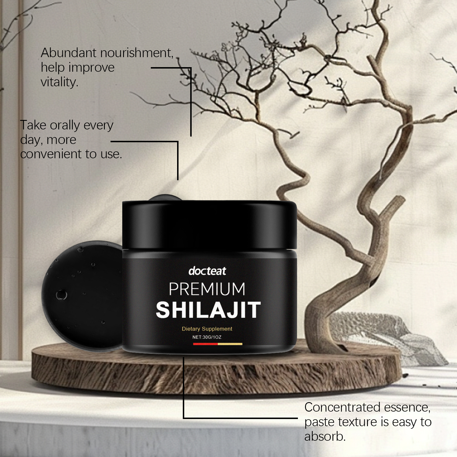 我们的喜来芝膏,由喜来芝树脂精心调配而成。专为调节精神状态和日常补充,以维持身体状况设计。使用方法极为便捷:每天服用一勺,浸泡在水中。并且可以每日补充,显示良好的精神状态。