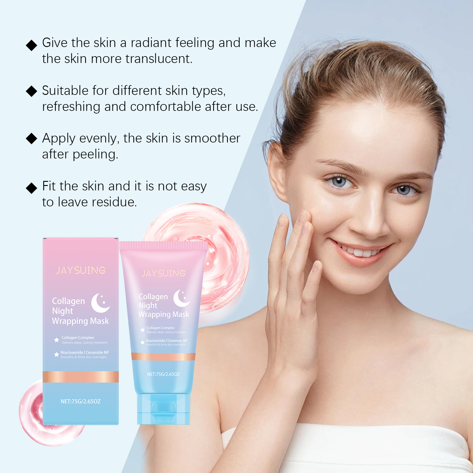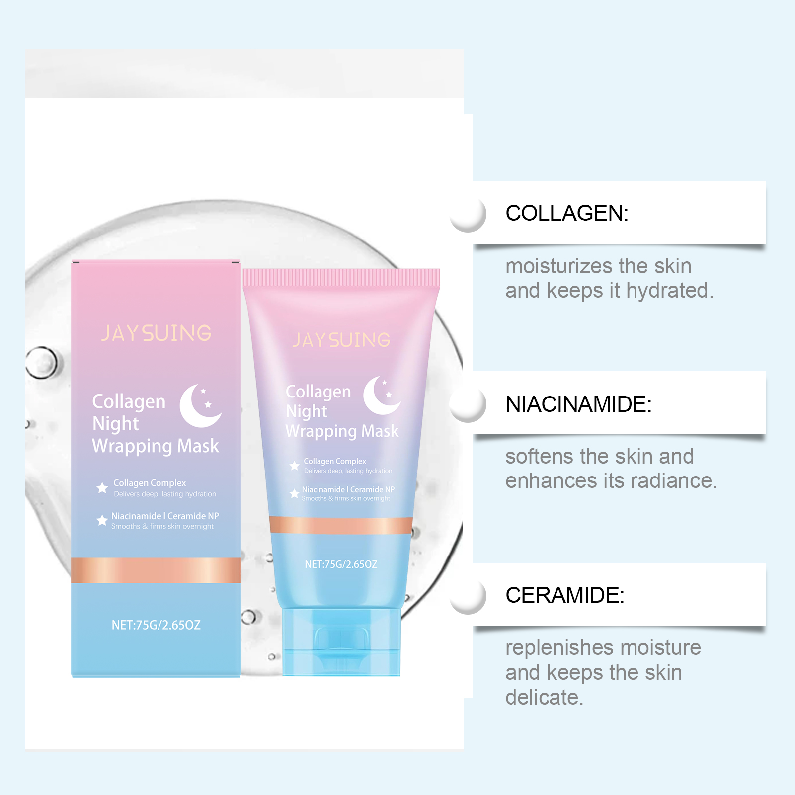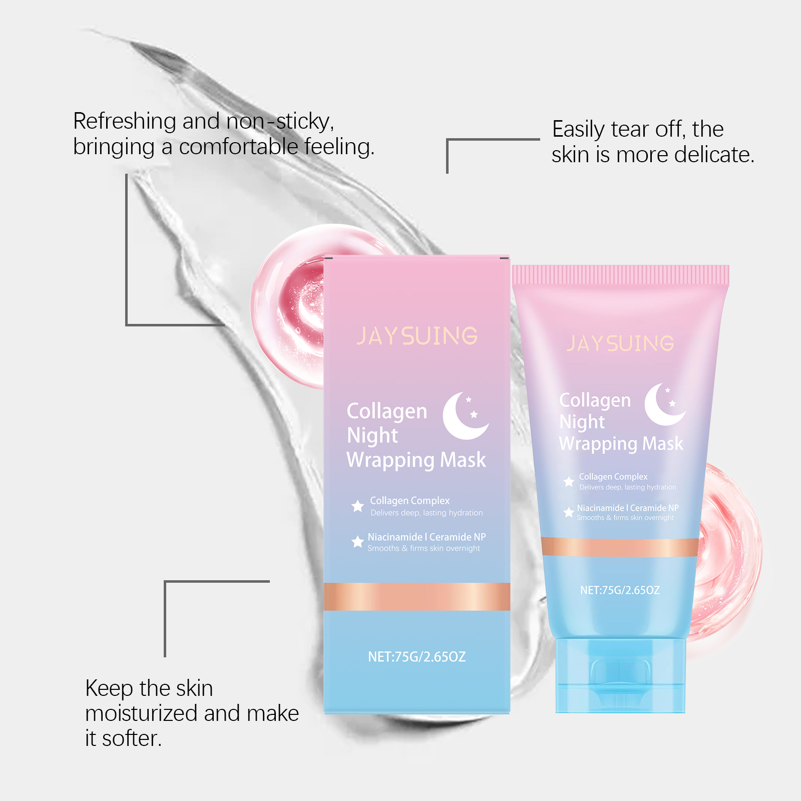 我们的胶原蛋白夜间撕拉面膜,由聚乙烯醇、甘油精心调配而成。专为清爽不粘腻,带来舒适的感觉设计。使用方法极为便捷:清洁你的脸并保持干燥。取适量本品均匀涂抹于面部,静待8小时或一整夜然后轻轻揭下面膜,用温水冲洗干净。并且可以用工具使用,轻轻涂抹,易于均匀覆盖皮肤表面。提供保湿感,保持皮肤光滑。