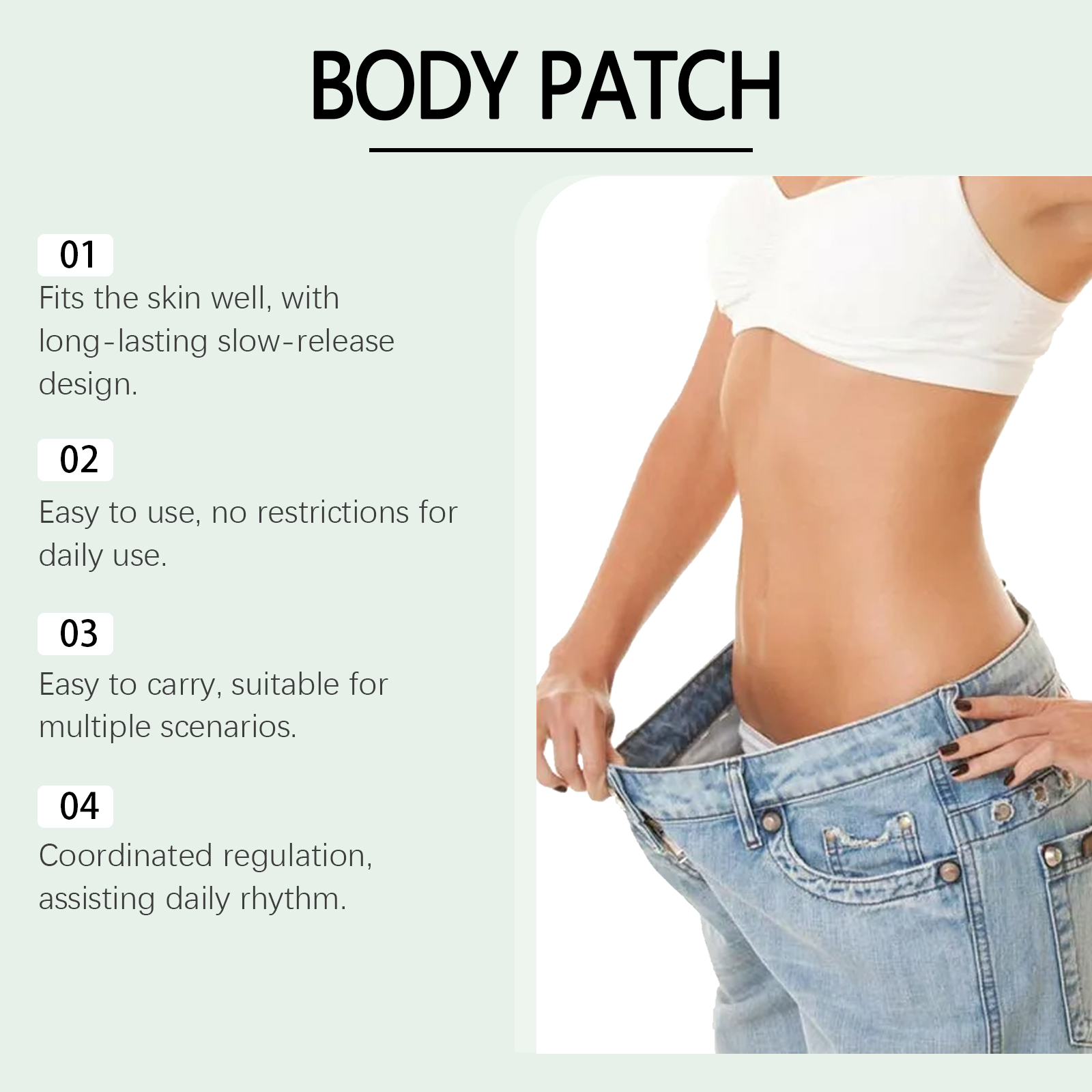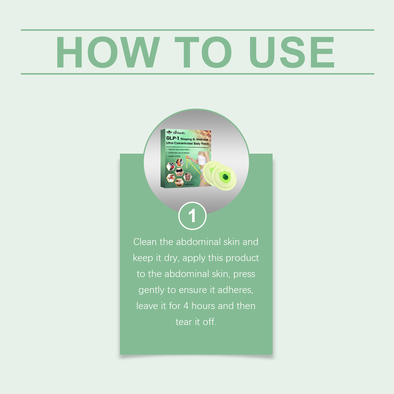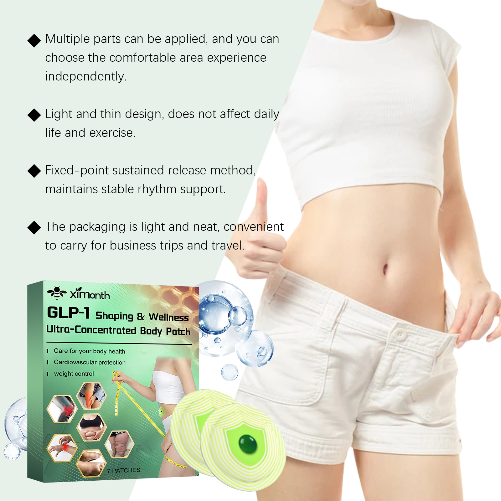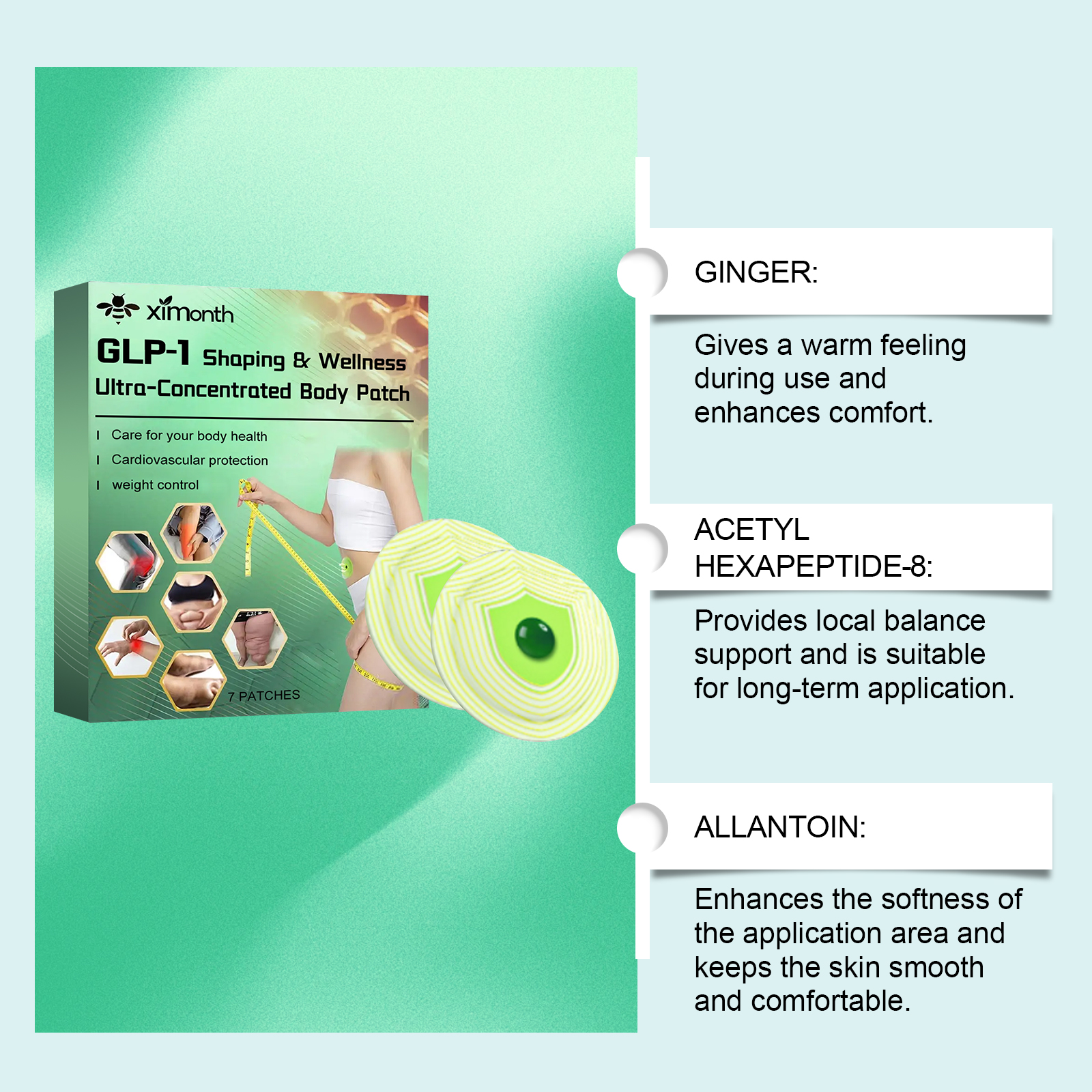 我们的身材护理贴片,由尿囊素、乙二胺四乙酸二钠精心调配而成。专为提供局部平衡支持,适用于长期应用设计。使用方法极为便捷:清洁腹部皮肤并保持干燥,将本产品涂抹在腹部皮肤上,轻轻按压以确保其粘附,放置4小时后将其撕下。并且可以增强应用区域的柔软度,保持皮肤光滑舒适。