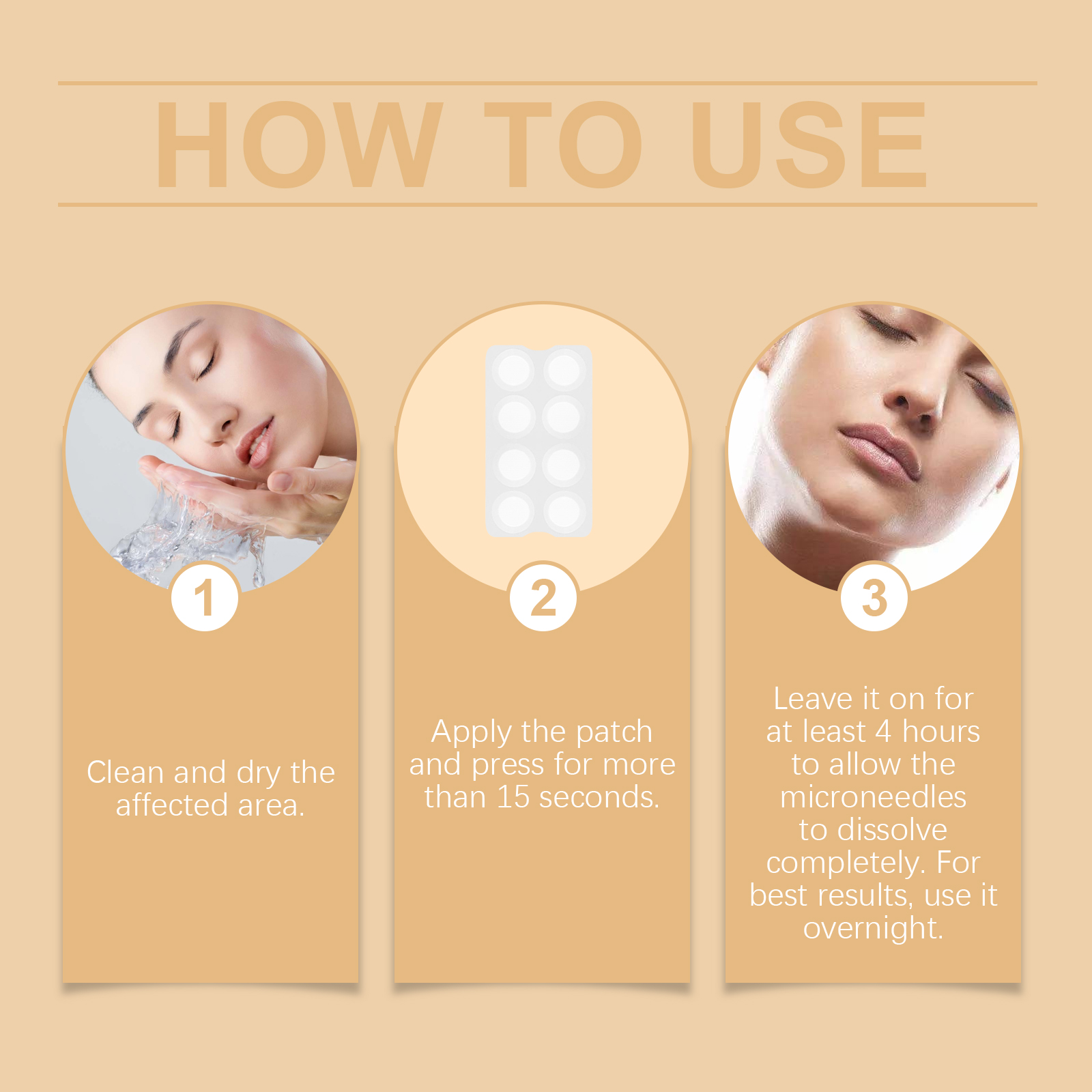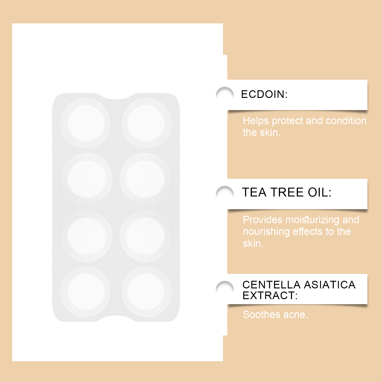 我们的痘痘贴,由水杨酸、依克多因、EDTA 二钠精心调配而成。专为改善表面,帮助皮肤变得均匀细腻设计。使用方法极为便捷:清洁并擦干受影响区域。贴上贴片并按压超过15秒。让它在皮肤上停留至少4小时,让微针完全溶解。为了获得最佳效果,建议整夜使用。并且可以保持皮肤滋润和舒适,易于操作和使用。