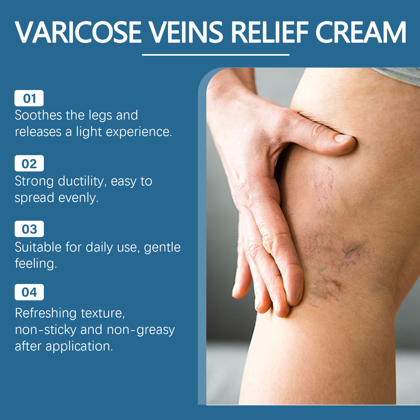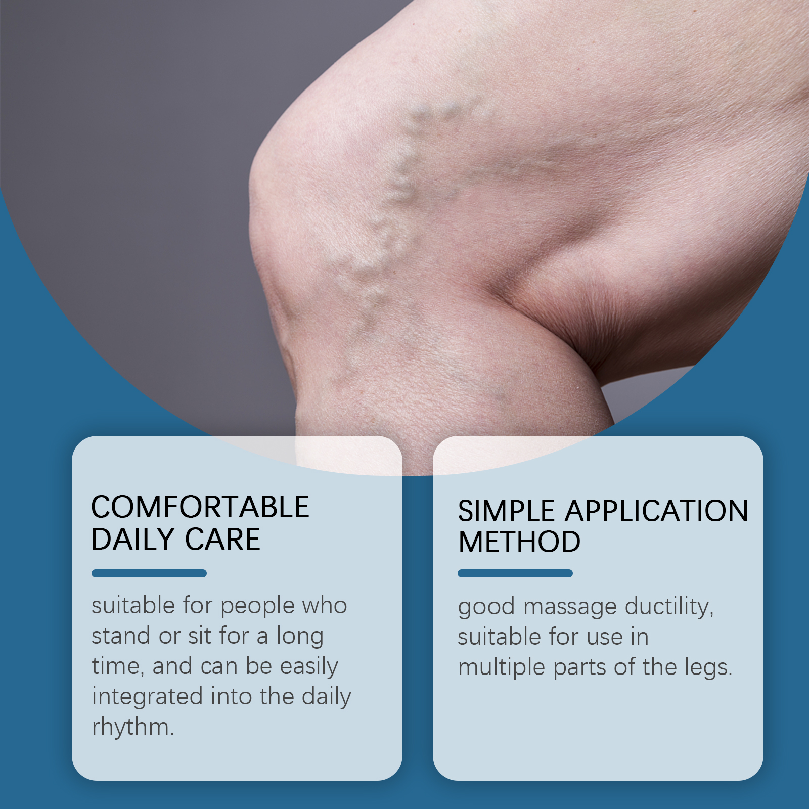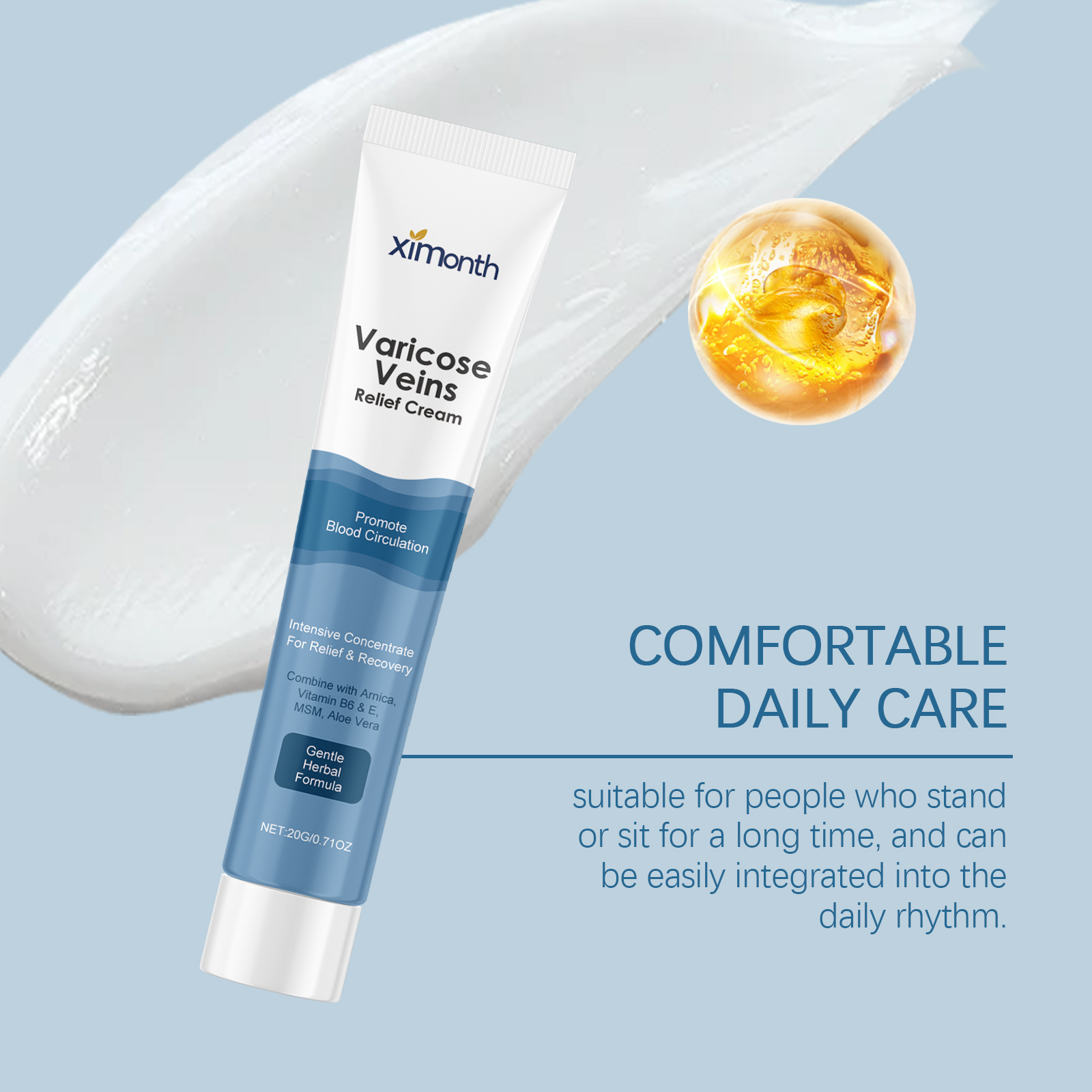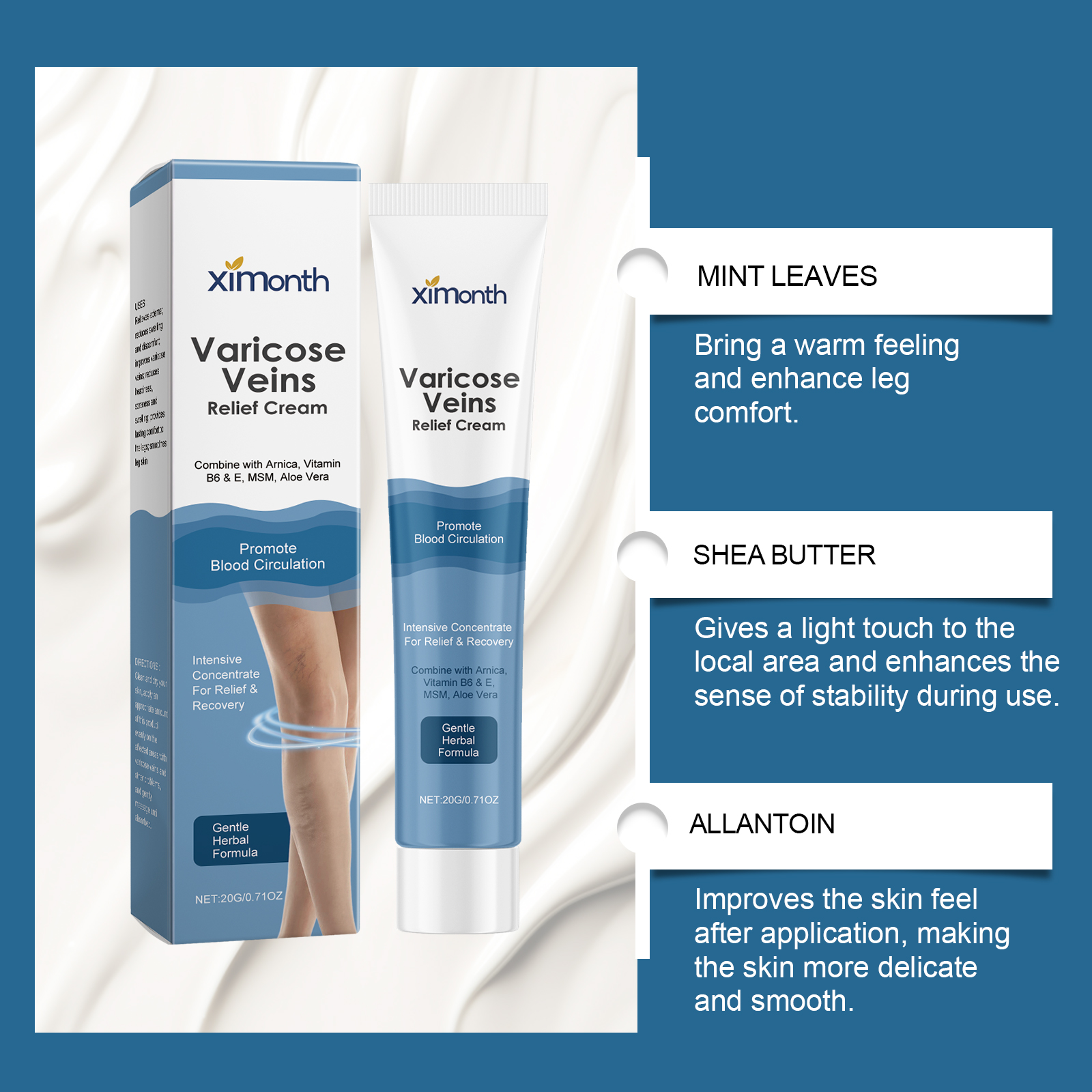 我们的腿部护理霜,由三乙醇胺、二甲基砜、尿囊素精心调配而成。专为减轻水肿,减少肿胀和不适,改善静脉曲张;减轻沉重、疼痛和肿胀设计。使用方法极为便捷:清洁并干燥皮肤,将适量本品均匀涂抹在患有静脉曲张和其他问题的受影响的区域,并轻轻按摩直至吸收。并且为腿部提供持久的舒适感,平滑腿部皮肤。