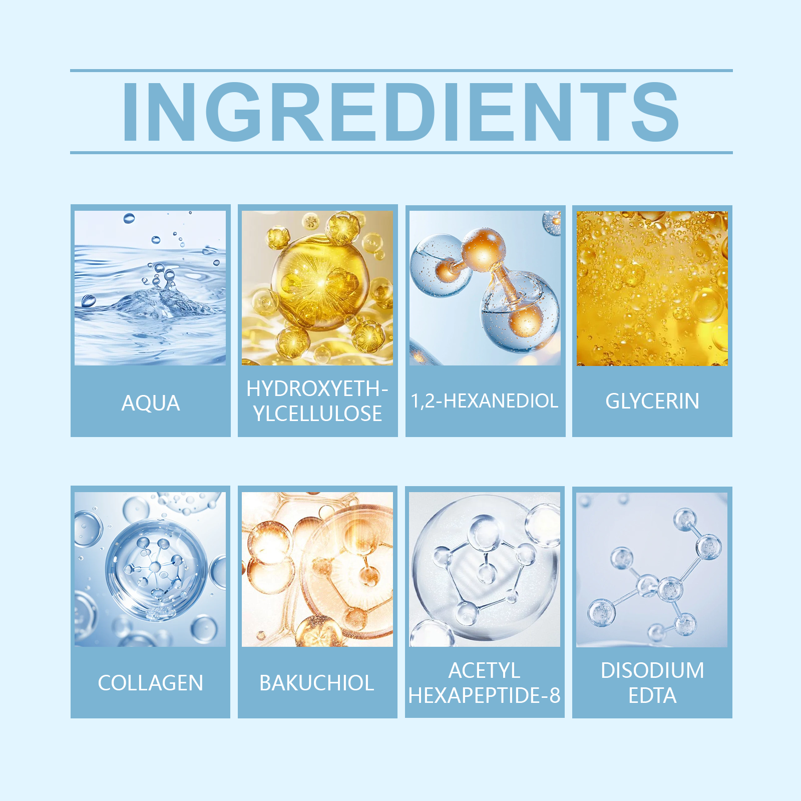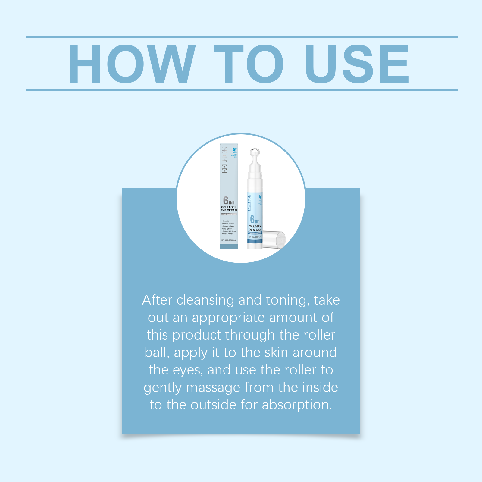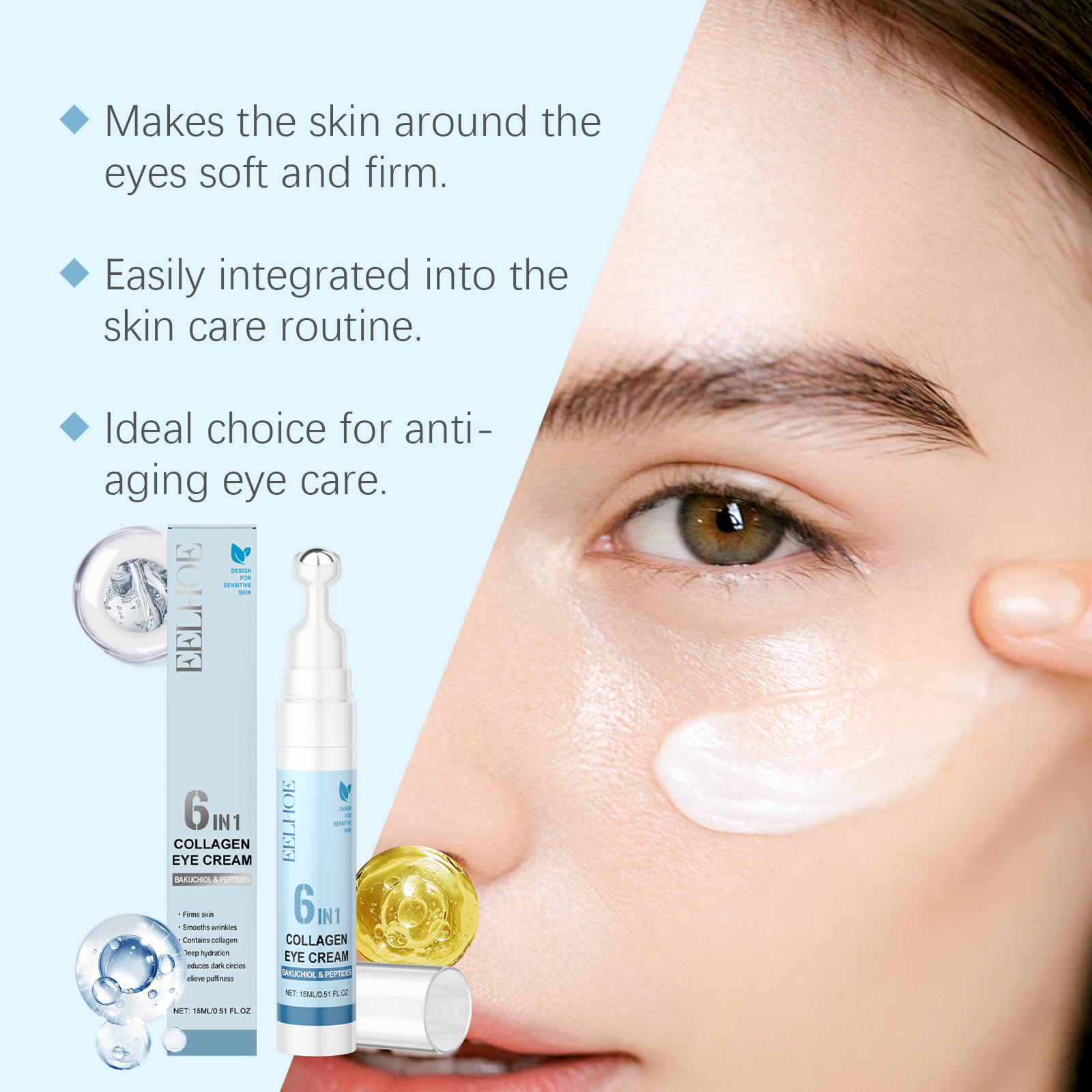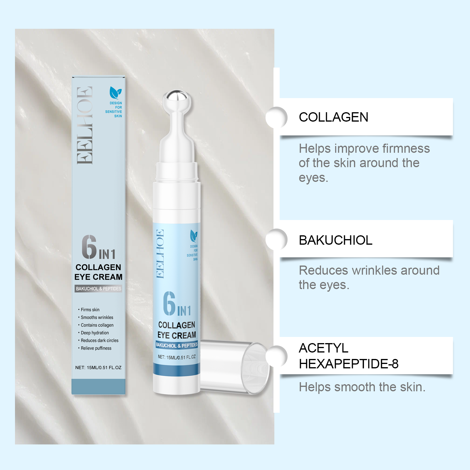 我们的胶原蛋白眼霜,由补骨脂酚、乙酰基六肽-8、EDTA 二钠精心调配而成。专为增强轮廓并紧致肌肤设计。使用方法极为便捷:通过滚轮清洁和调理后,取出适量产品,将其涂抹在眼周肌肤上,并用滚轮轻轻按摩,从内向外吸收。并且可以减少细纹并抚平眼周轮廓。