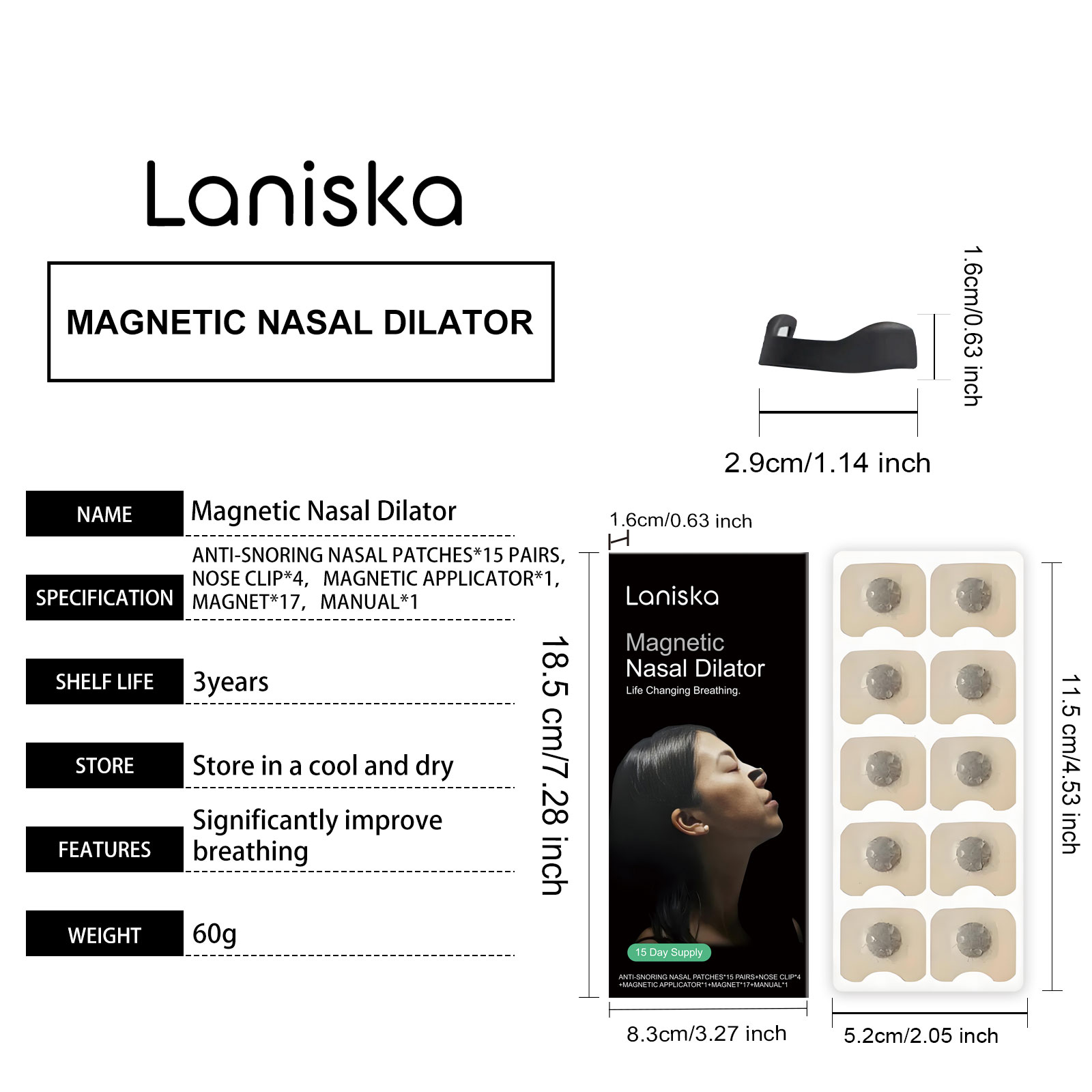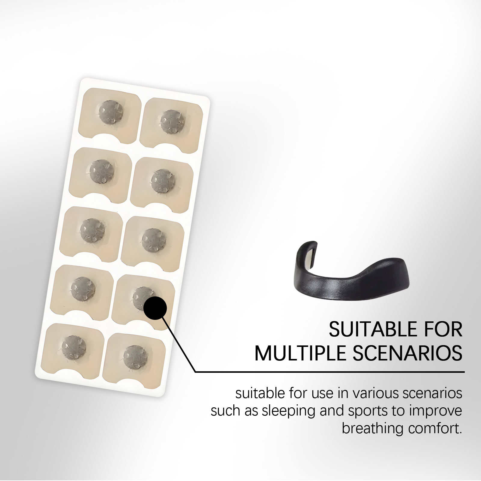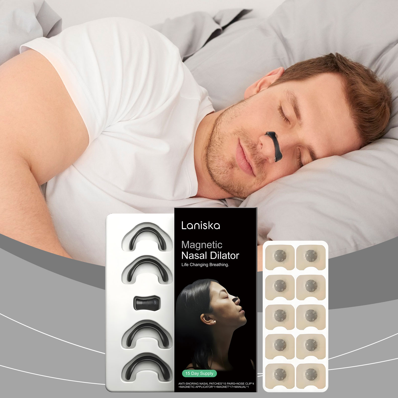 我们的止鼾睡眠安心贴套装,由薄荷叶油、蓝桉叶提取物精心调配而成。专为有效打开鼻腔通道并提高呼吸效率设计。使用方法极为便捷:1.彻底清洁和干燥鼻子区域的皮肤。2.将圆形磁铁放入磁贴器中,使用磁贴器吸收鼻贴,撕下鼻贴背面的保护膜,将鼻贴放在鼻子的一个侧面上,按压并抚平鼻贴,然后在另一侧重复以上步骤。3.将方形磁铁安装在鼻夹内,最后使用鼻夹夹住补丁,将其固定在鼻子上。并且可以显著减少打鼾并改善睡眠质量。