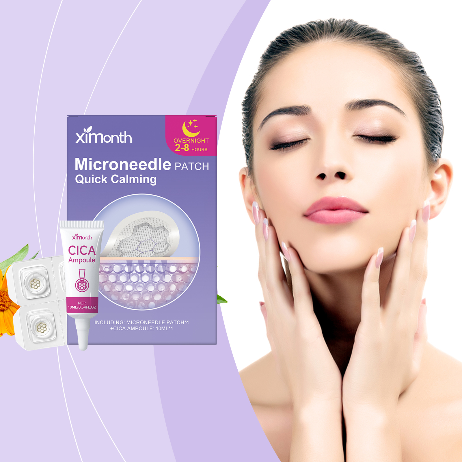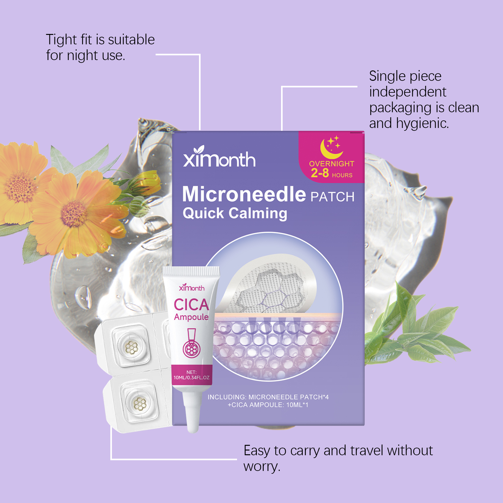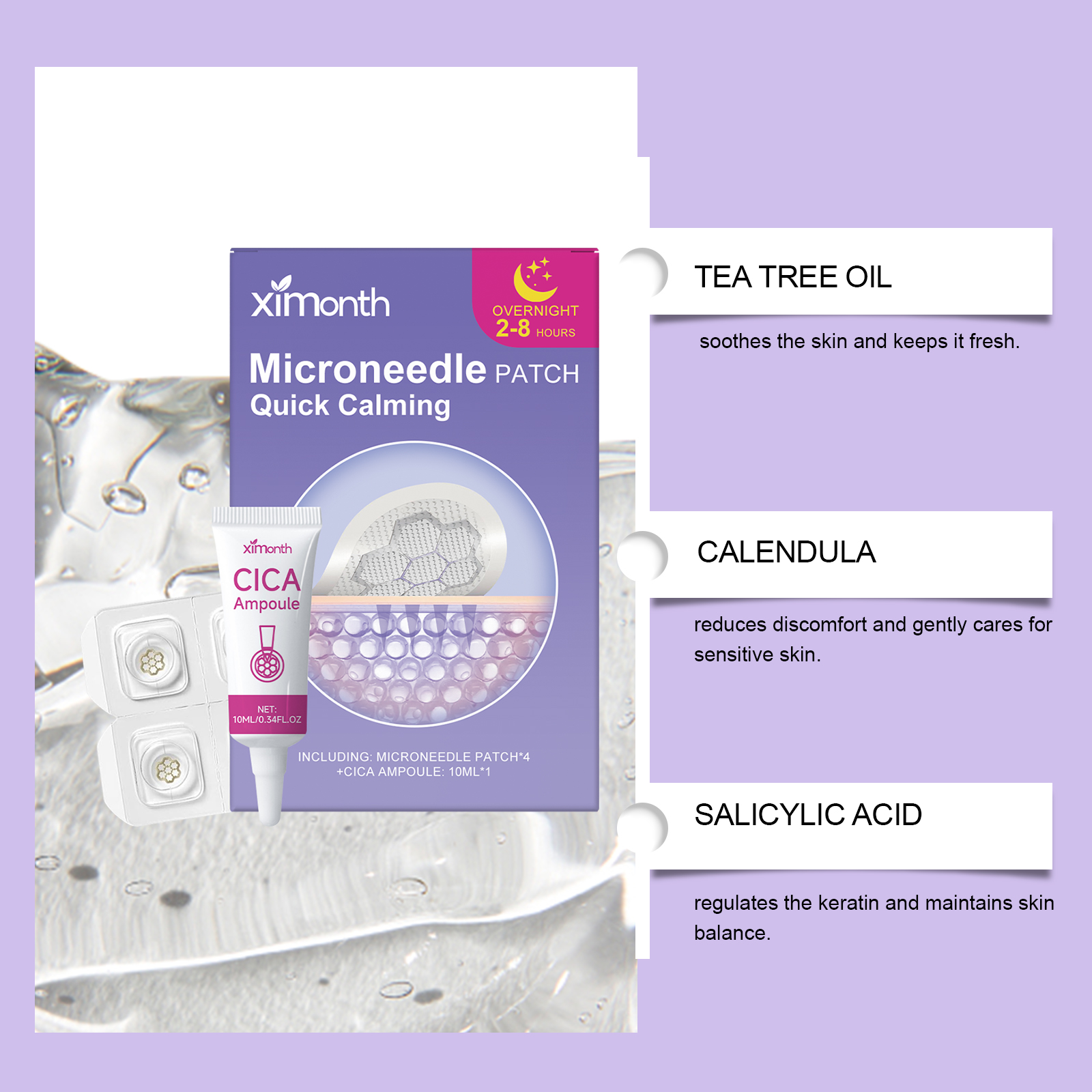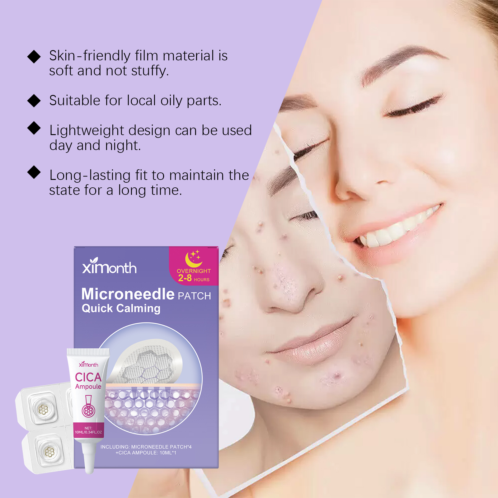 我们的面部护理贴套装,由贴片:茶树油、甘油,安瓶:金盏花、积雪草精心调配而成。专为调节角质并维持皮肤平衡设计。使用方法极为便捷:轻轻清洁痘痘周围的皮肤。取出贴片,挤出适量,从安瓶中取出的内容物到贴片上,然后直接将其贴在痤疮区域。轻轻按压贴片约5秒,以确保贴合良好,8小时后取下贴片并轻柔地清洁皮肤。并且产品薄而轻,不易脱落。