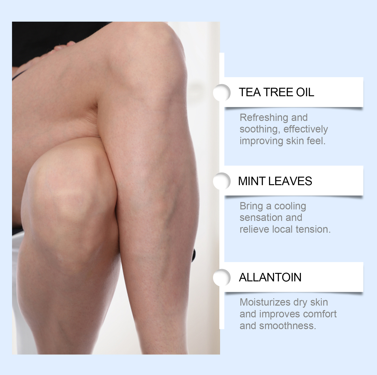 我们的腿部护理霜,由茶树油、薄荷叶精心调配而成。专为缓解腿部不适,缓解腿部肿胀,缓解静脉曲张设计。使用方法极为便捷:清洁肌肤并保持干燥,取适量本品均匀涂抹在腿部肿胀等受影响的肌肤上,轻柔按摩直至吸收。并且可以促进血液循环,改善肤色,提高腿部舒适度。