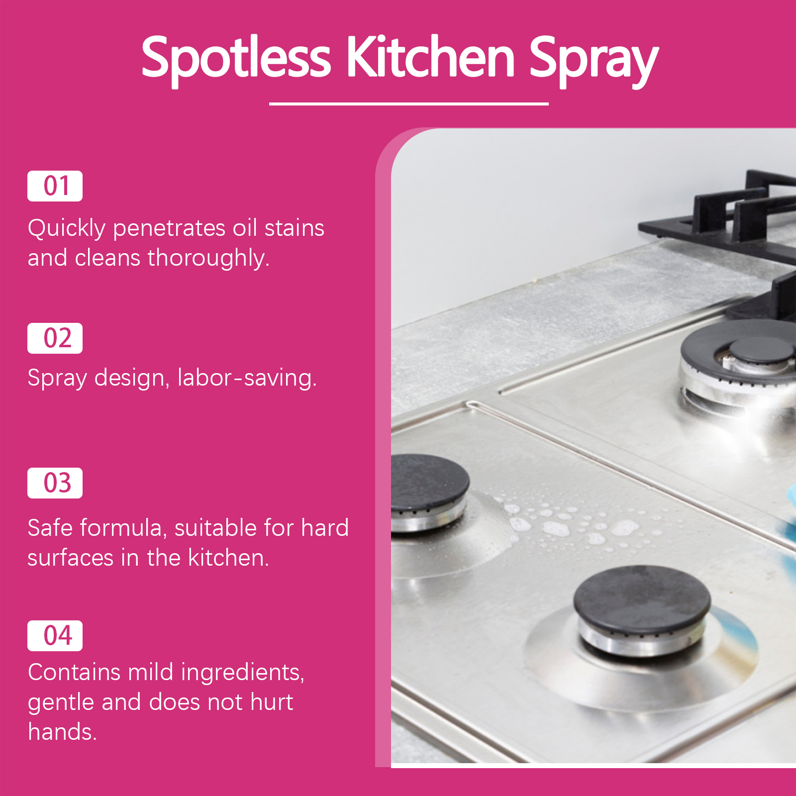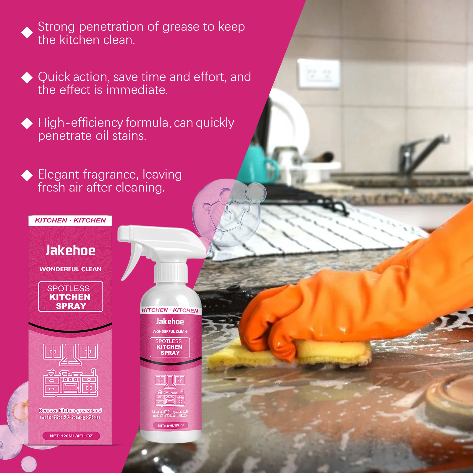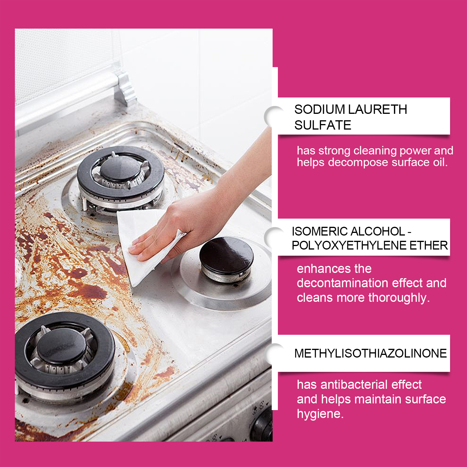 我们的厨房清洁喷雾,由月桂醇聚醚硫酸酯钠、异构醇聚氧乙烯醚精心调配而成。专为渗透顽固油渍,快速分解油脂和污垢设计。使用方法极为便捷:将喷嘴转到开启位置,并直接在要清洁的区域喷洒。等待5分钟,然后用干布或湿布擦拭干净。对于严重污渍的表面,重复使用。完成后,务必将喷嘴转到关闭位置。并且具有抗菌效果,有助于保持表面卫生。