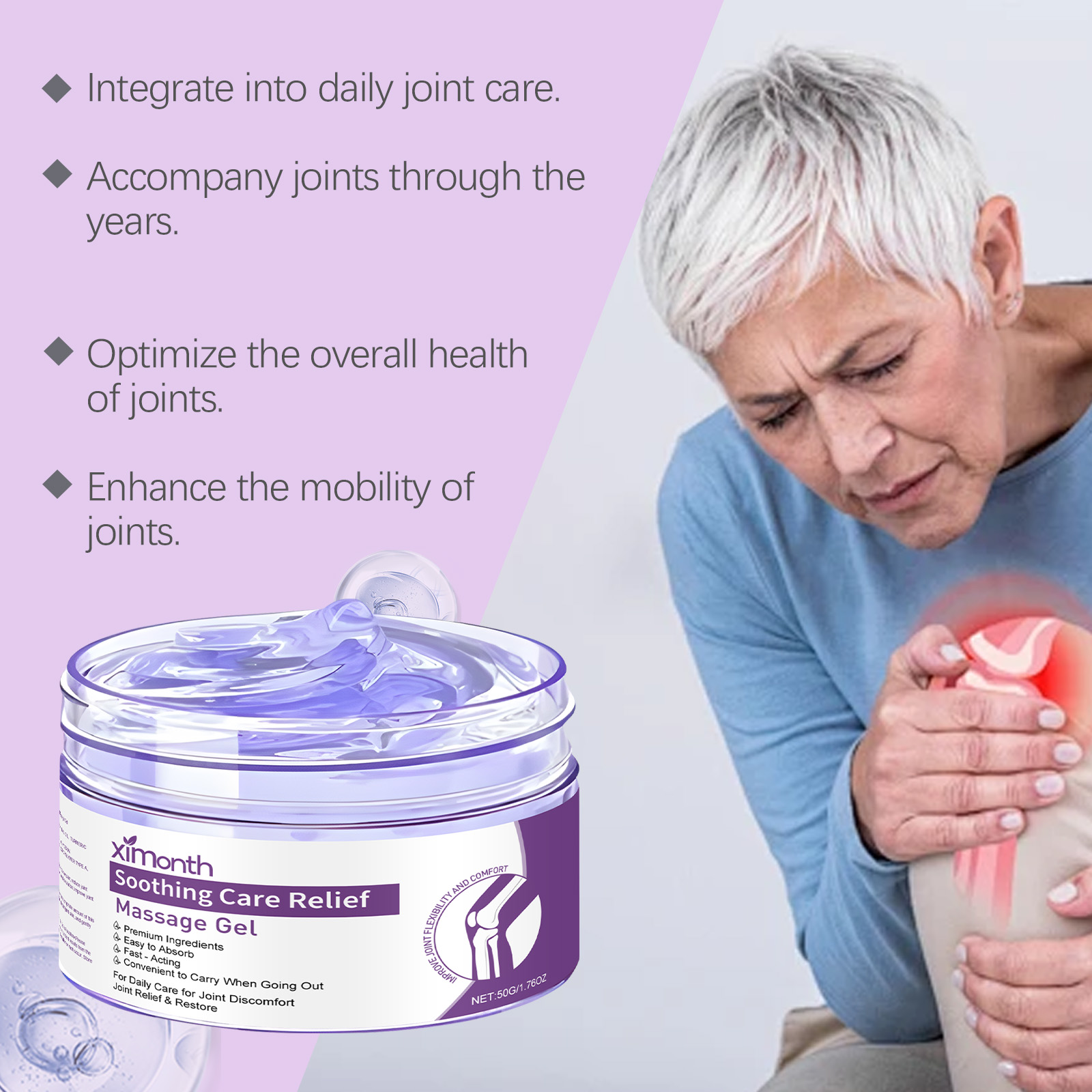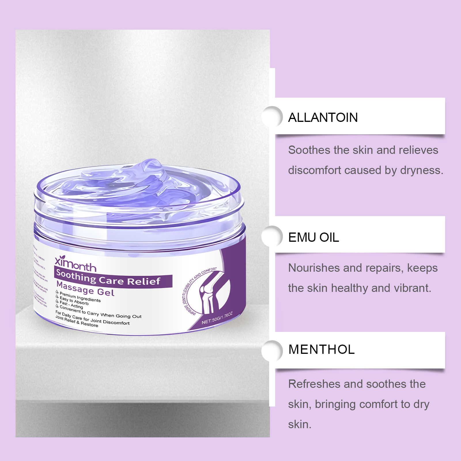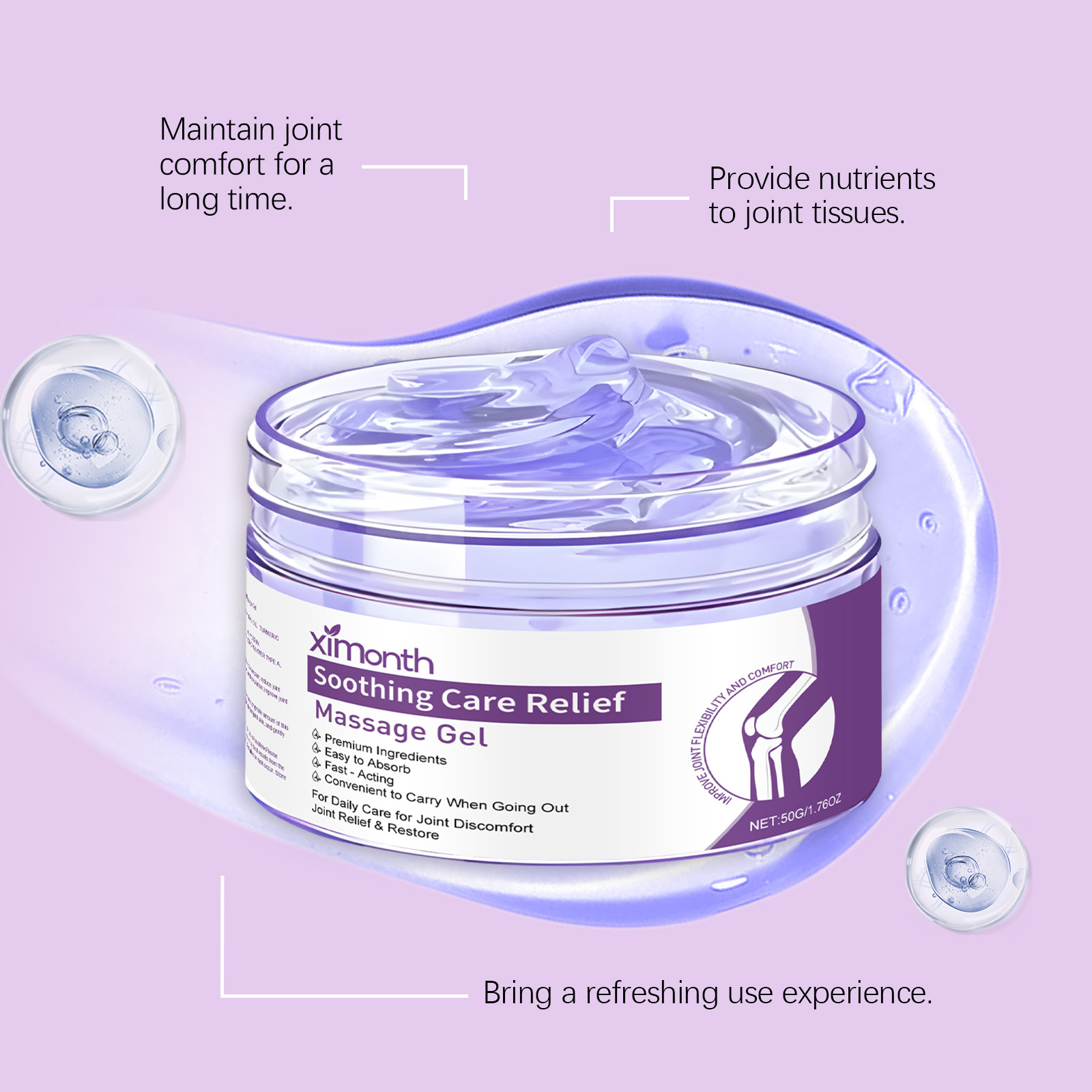 我们的关节按摩凝胶,由三乙醇胺、尿囊素精心调配而成。专为温和缓解关节不适设计。使用方法极为便捷:洁肤后保持皮肤干燥,取适量本品均匀涂抹于患处,待吸收。并且可以帮助关节恢复灵活性。