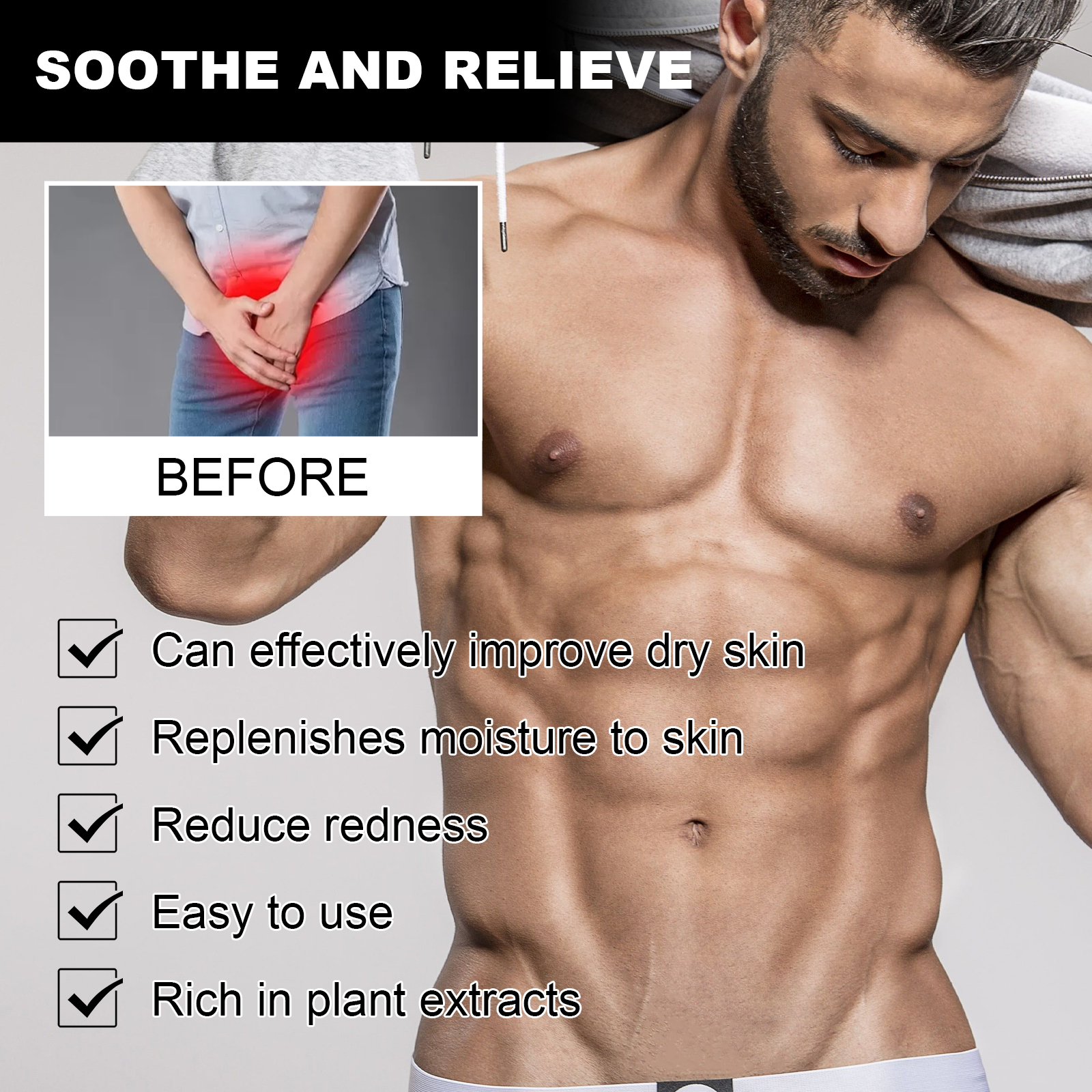 我们的男士护理膏含有芦荟、水解燕麦、牛油果提取物。它可以有效改善剃须后干燥的肌肤,为肌肤补充水分,恢复肌肤水分和光泽;能有效改善干燥皮肤,富含植物提取物,补充皮肤水分,减少发红,易于使用。它的使用方法很简单:清洁双手后,取适量护理霜,剃须后涂抹于私处,均匀涂抹在皮肤上。男士护理膏有效保护皮肤,减少红肿;保持个人清洁,给人耳目一新的感觉。
