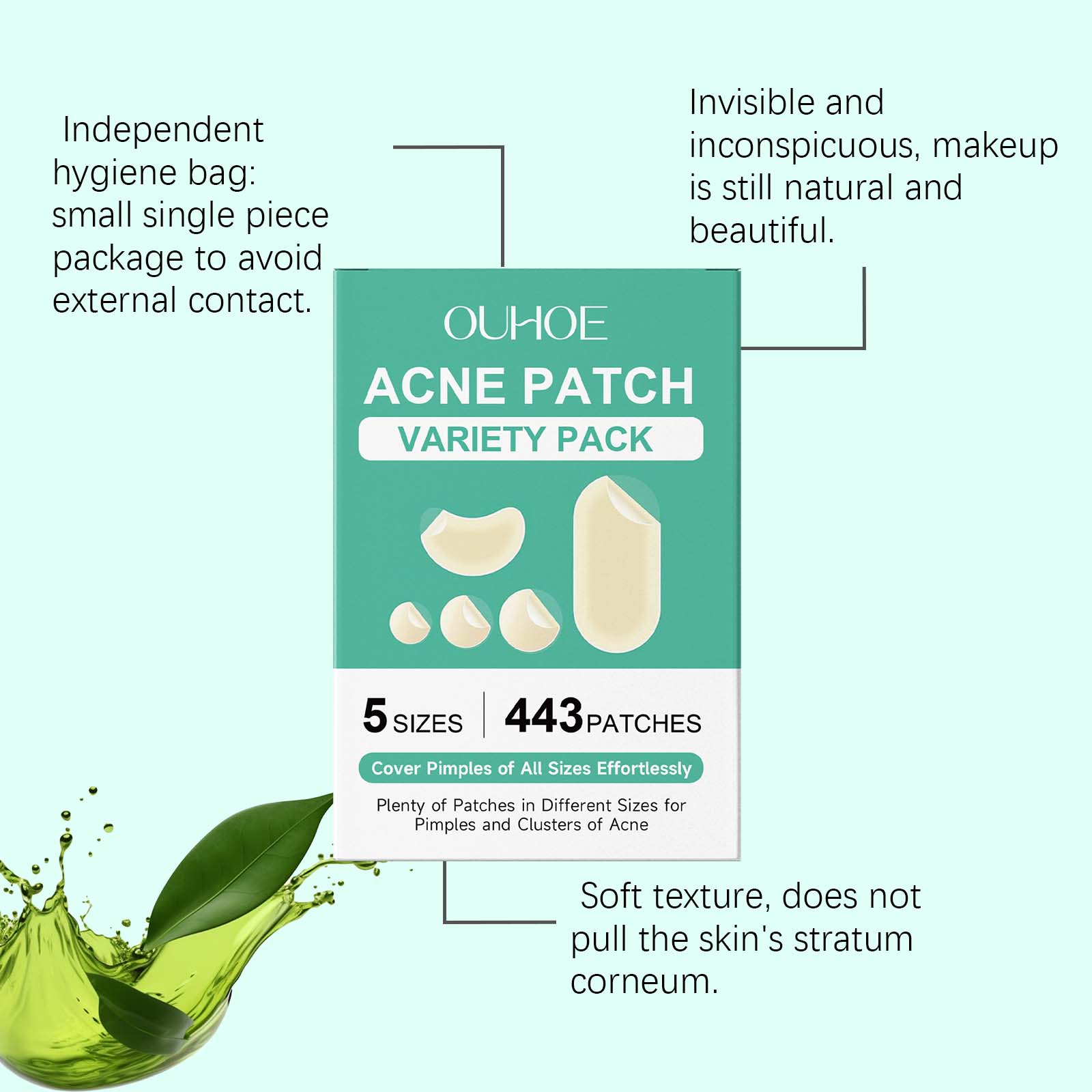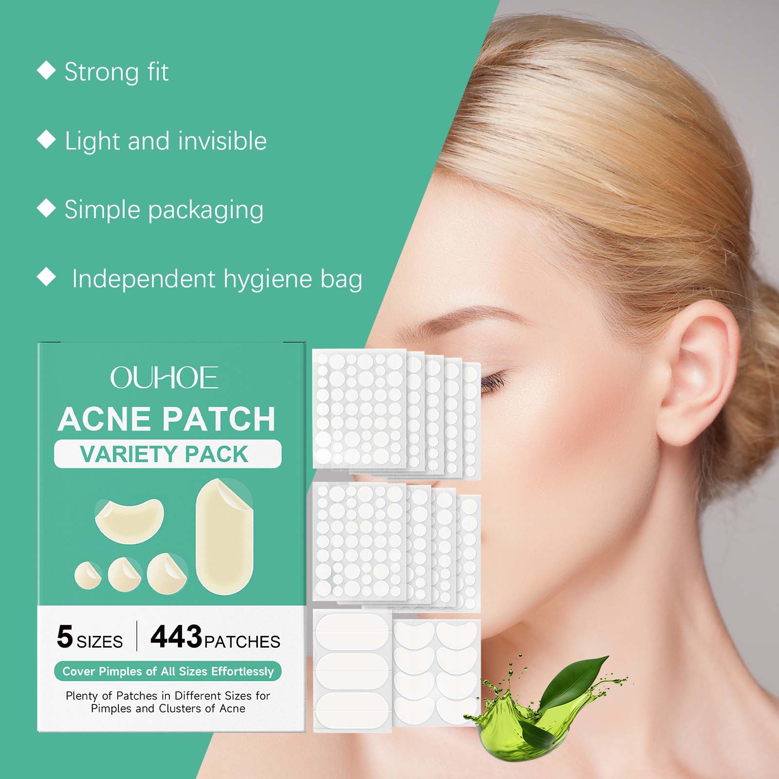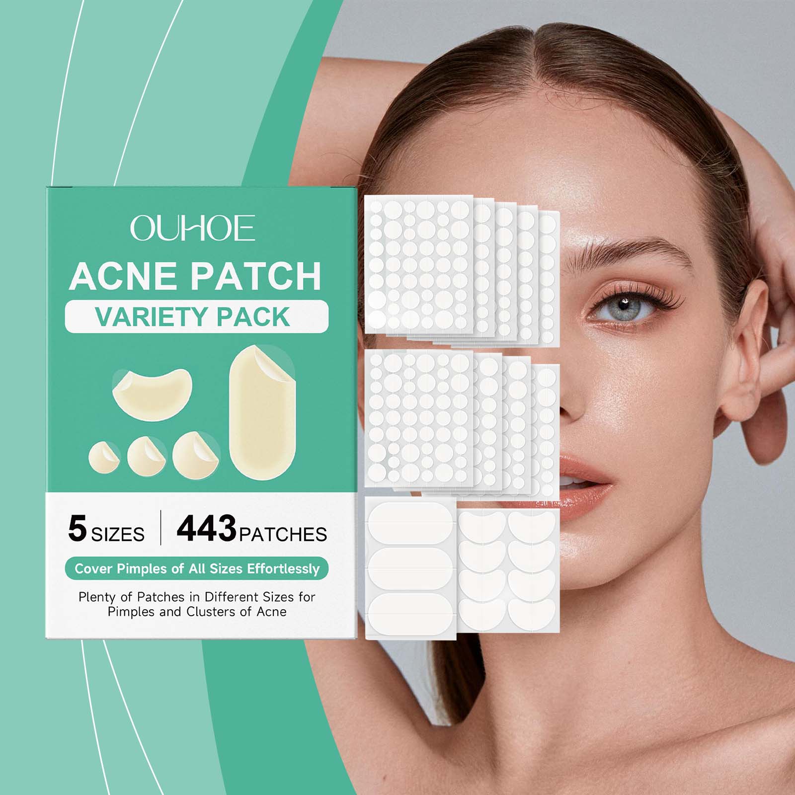 我们的痘痘遮瑕贴套装,由甘油、羟乙基纤维素精心调配而成。专为有效地处理痤疮和其他皮肤瑕疵设计。使用方法极为便捷:1. 清洁并彻底擦干需使用部位。2. 根据痘痘大小选择痘贴,小心揭下贴膜。3. 贴于痘痘或需要护理的区域。4. 建议贴满至少4小时,亦可隔夜使用。5. 使用后轻轻揭下,视需要更换新贴。并且可以迅速干燥粉刺,轻松吸出白头上的脓液,帮助恢复清晰无瑕的肌肤。