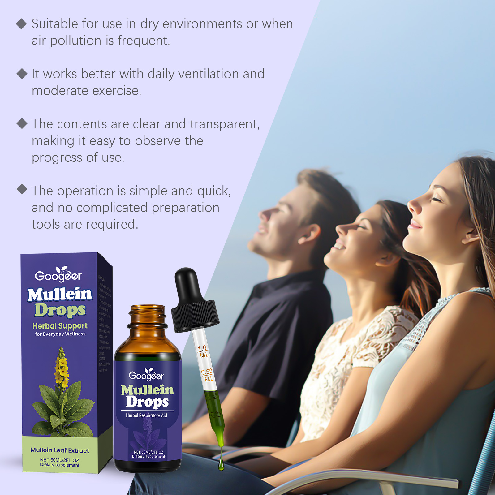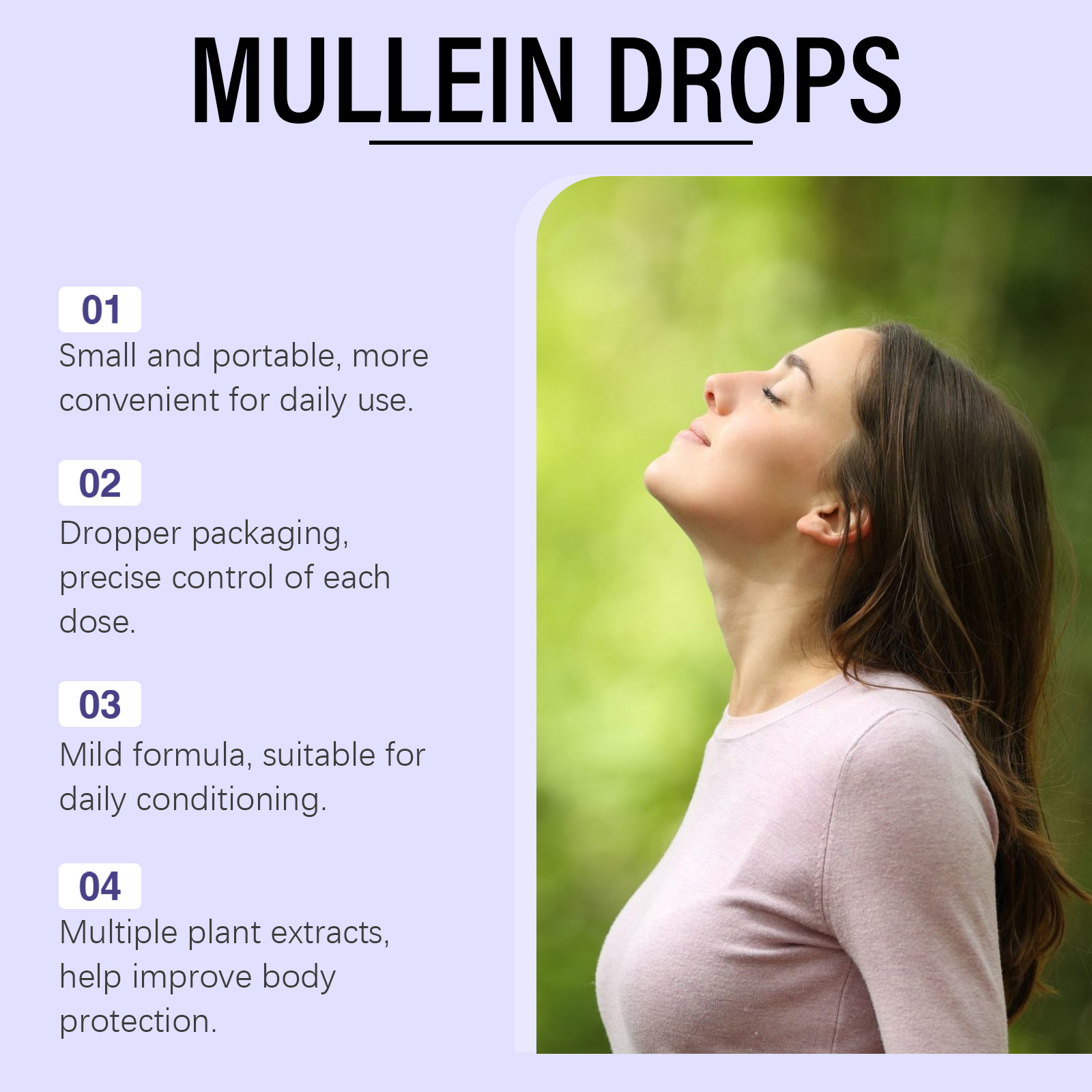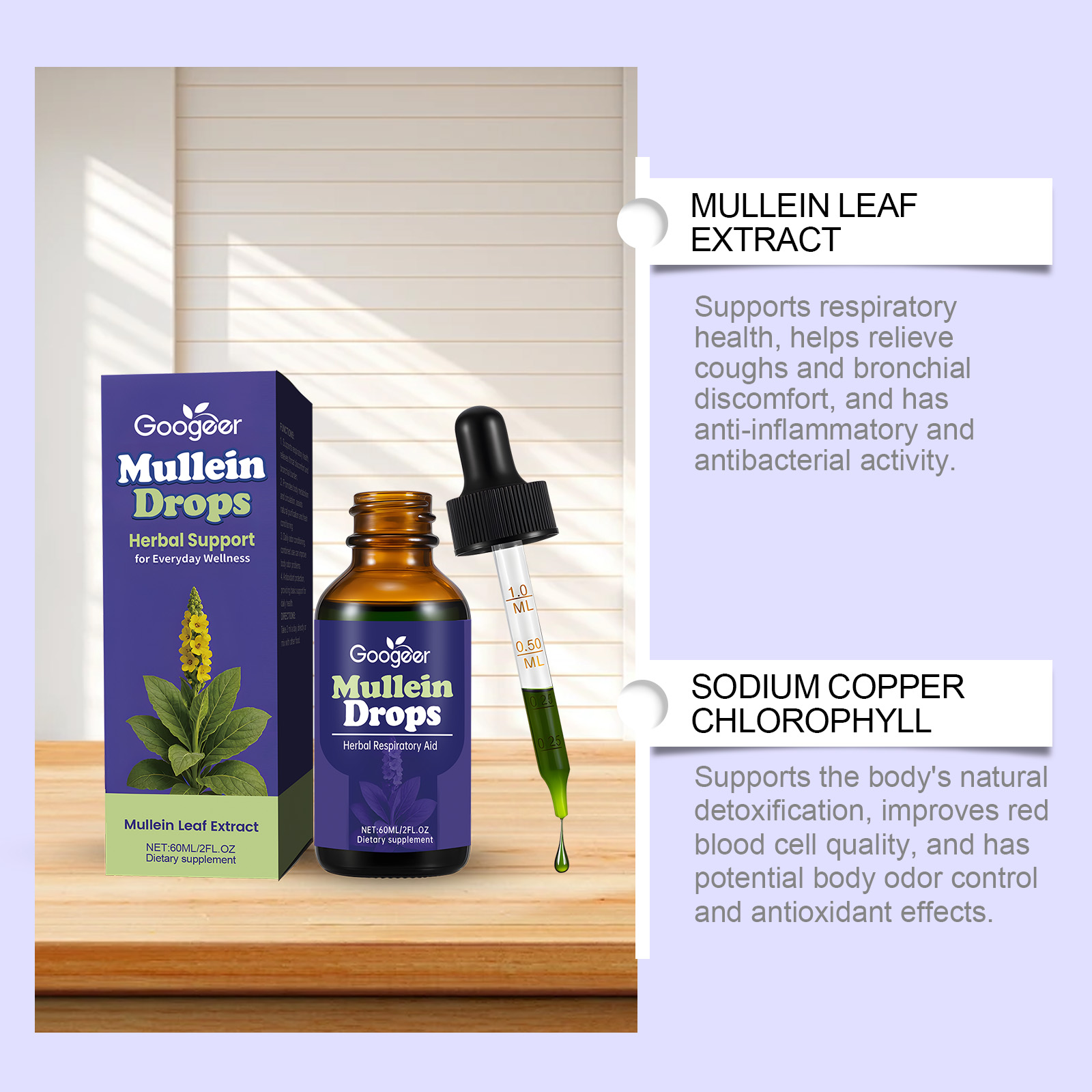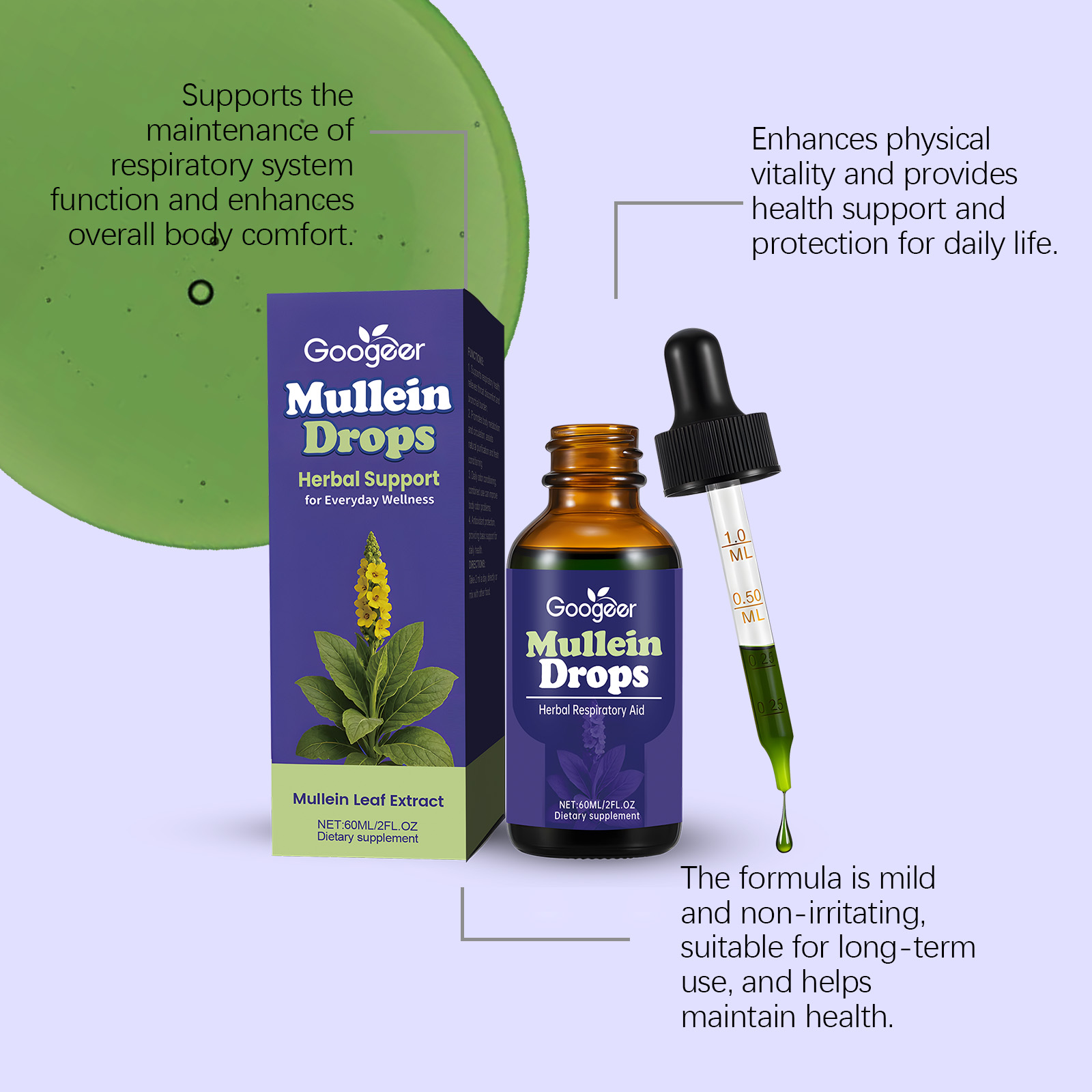 我们的毛蕊花滴剂,由毛蕊花叶提取物、叶绿素钠铜盐精心调配而成。专为支持呼吸系统健康,缓解咽喉不适与支气管负担设计。使用方法极为便捷:一天2ml,直接服用或与其他食物混合服用。并且可以支持呼吸系统健康,缓解咽喉不适与支气管负担。