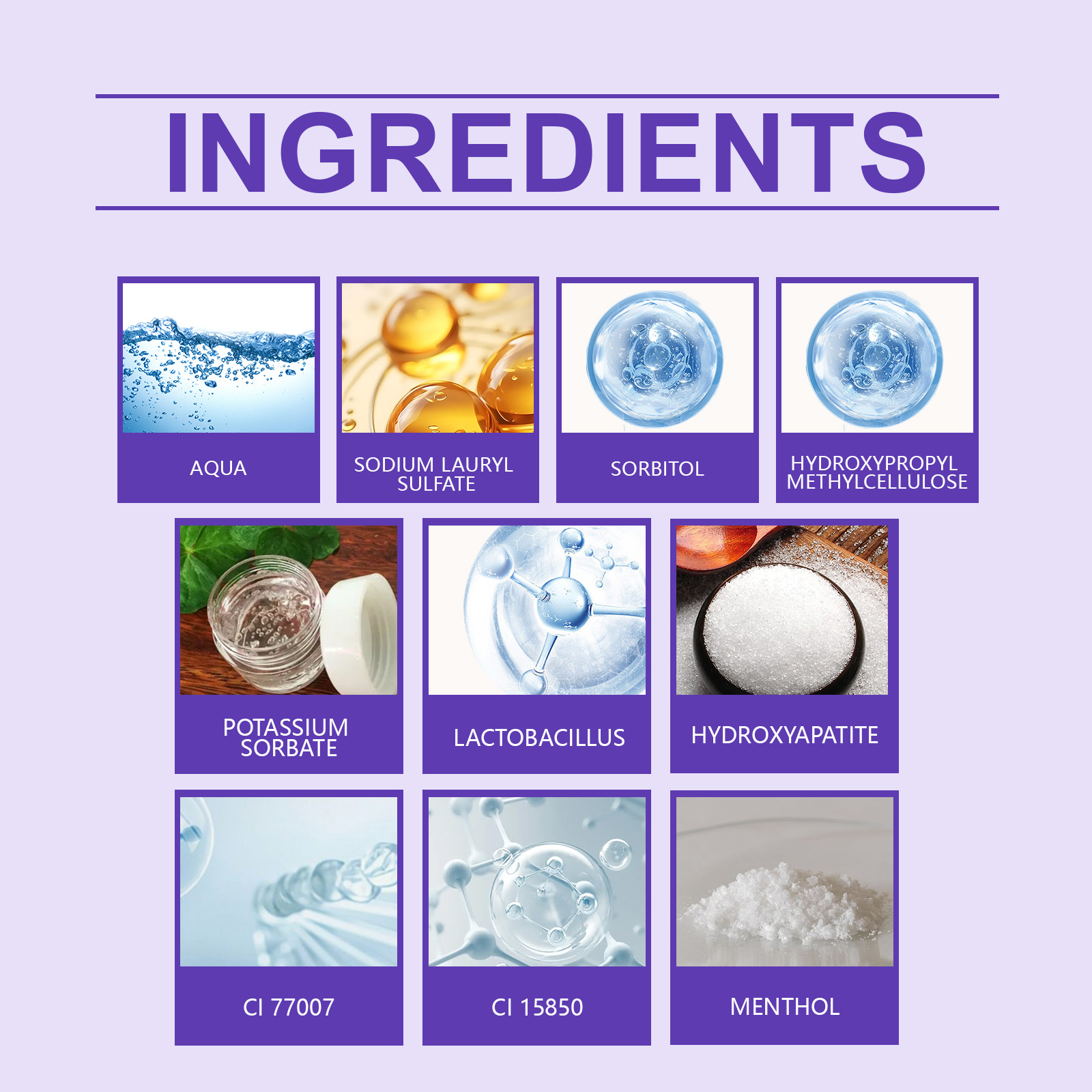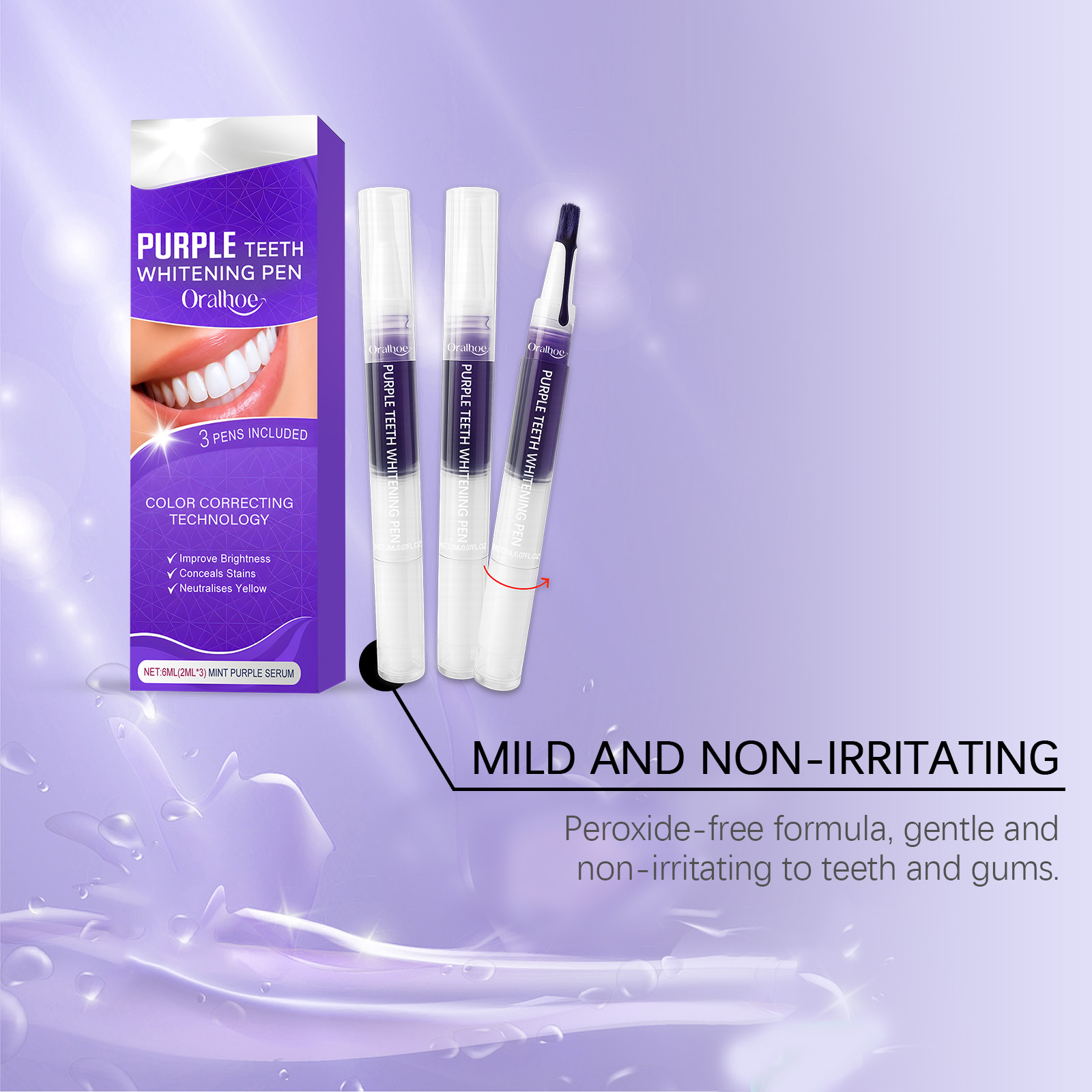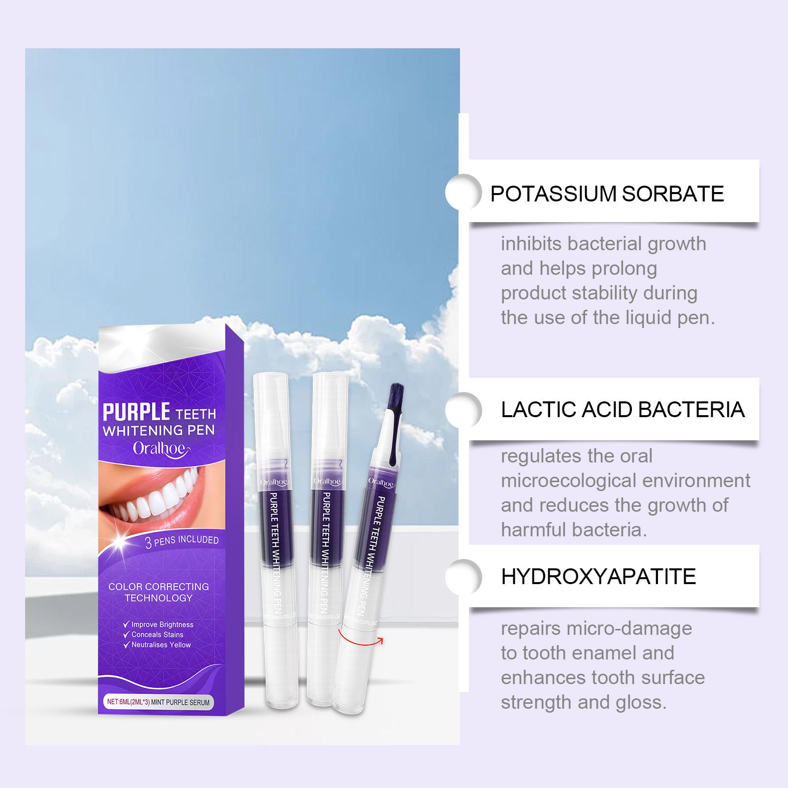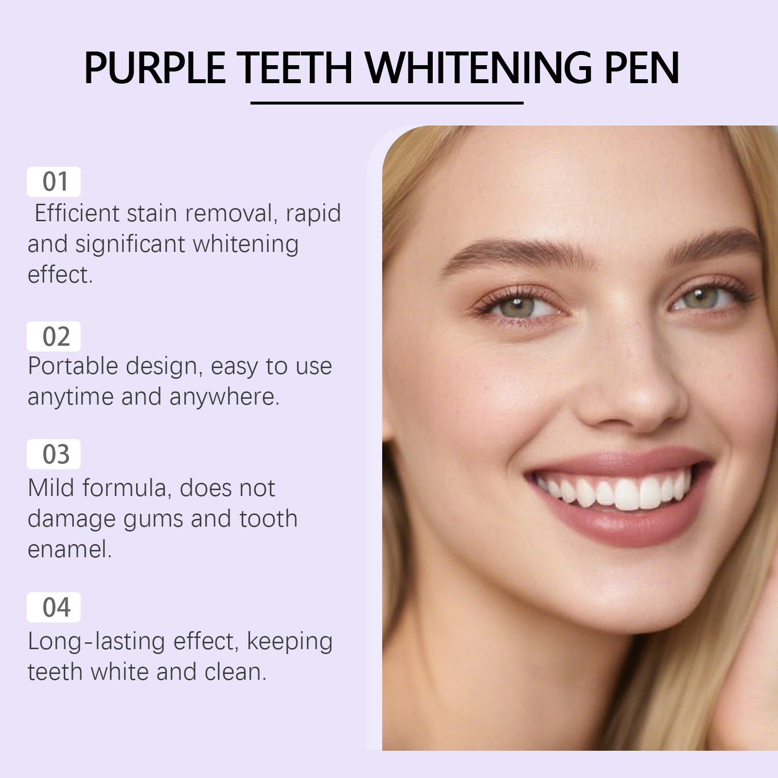 我们的紫色牙齿护理笔,由山梨酸钾、乳酸菌精心调配而成。专为促进即时美白效果设计。使用方法极为便捷:1. 使用前充分摇匀美白液笔。2. 旋转底部笔杆,挤出适量液体。3. 对准牙齿表面,均匀涂抹美白液。4. 静待 30 分钟,让液体充分作用。5. 用清水漱口并将残留液体吐出。并且可以去除牙菌斑,同时保护牙齿免受新污渍的侵害。