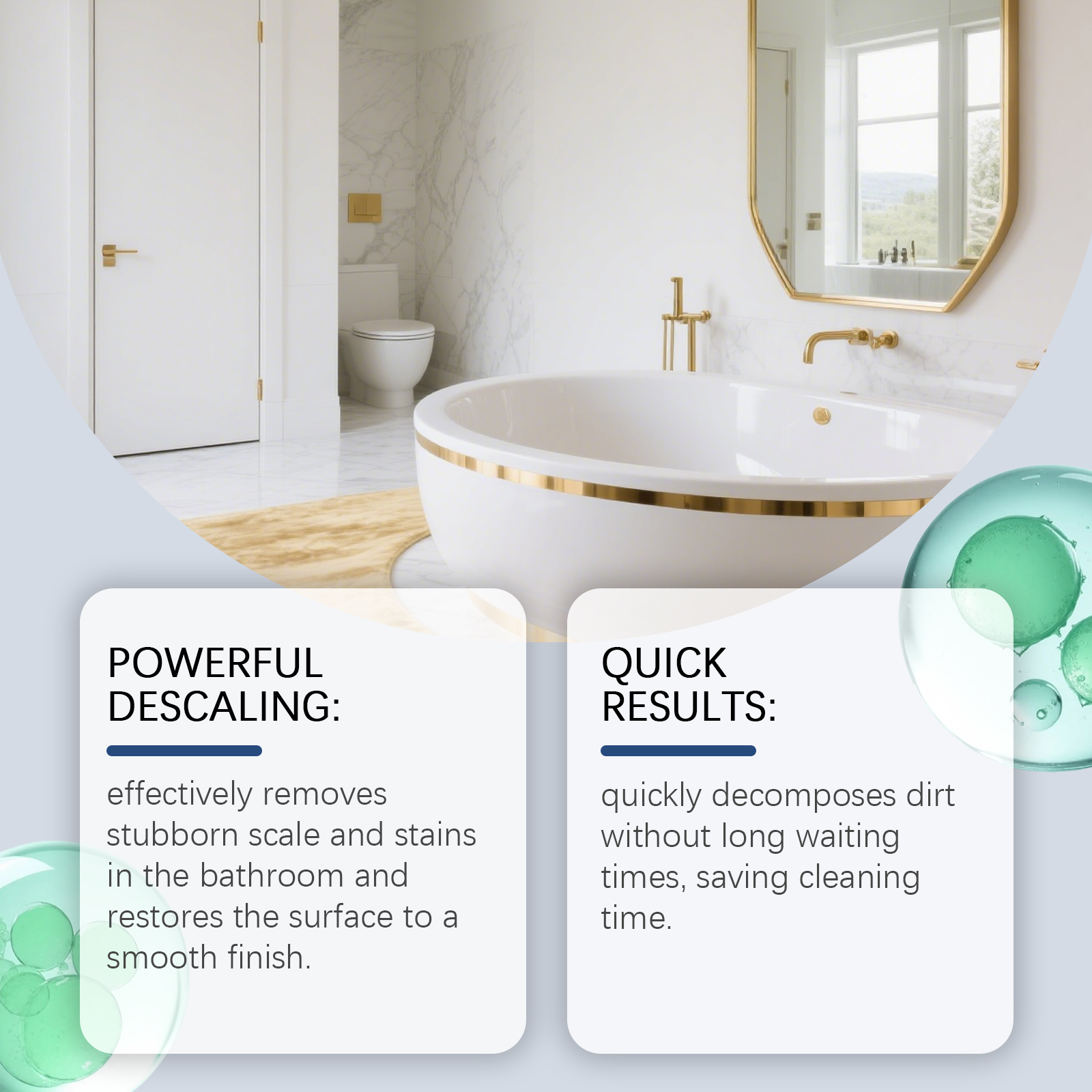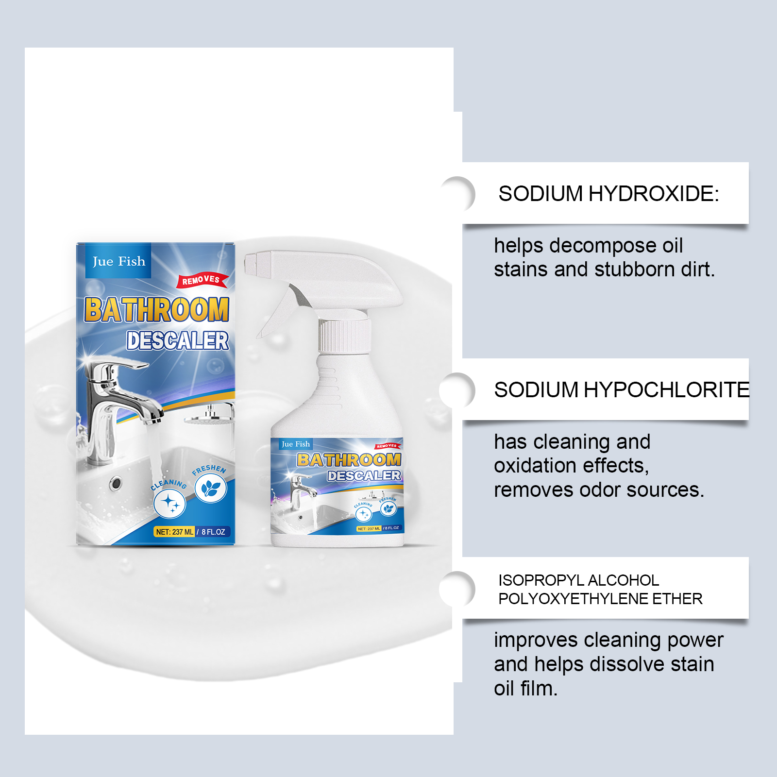 我们的浴室除垢剂,由次氯酸钠、异构醇聚氧乙烯醚精心调配而成。专为有效去除浴室中的顽固水垢和污渍设计。使用方法极为便捷:将产品均匀喷洒在要清洁的表面上,确保其完全湿润。让它停留大约2分钟,让清洁成分充分发挥作用。用干净的布擦拭表面以去除污渍和残留物。并且可以快速分解污垢,无需长时间等待,节省清洁时间。