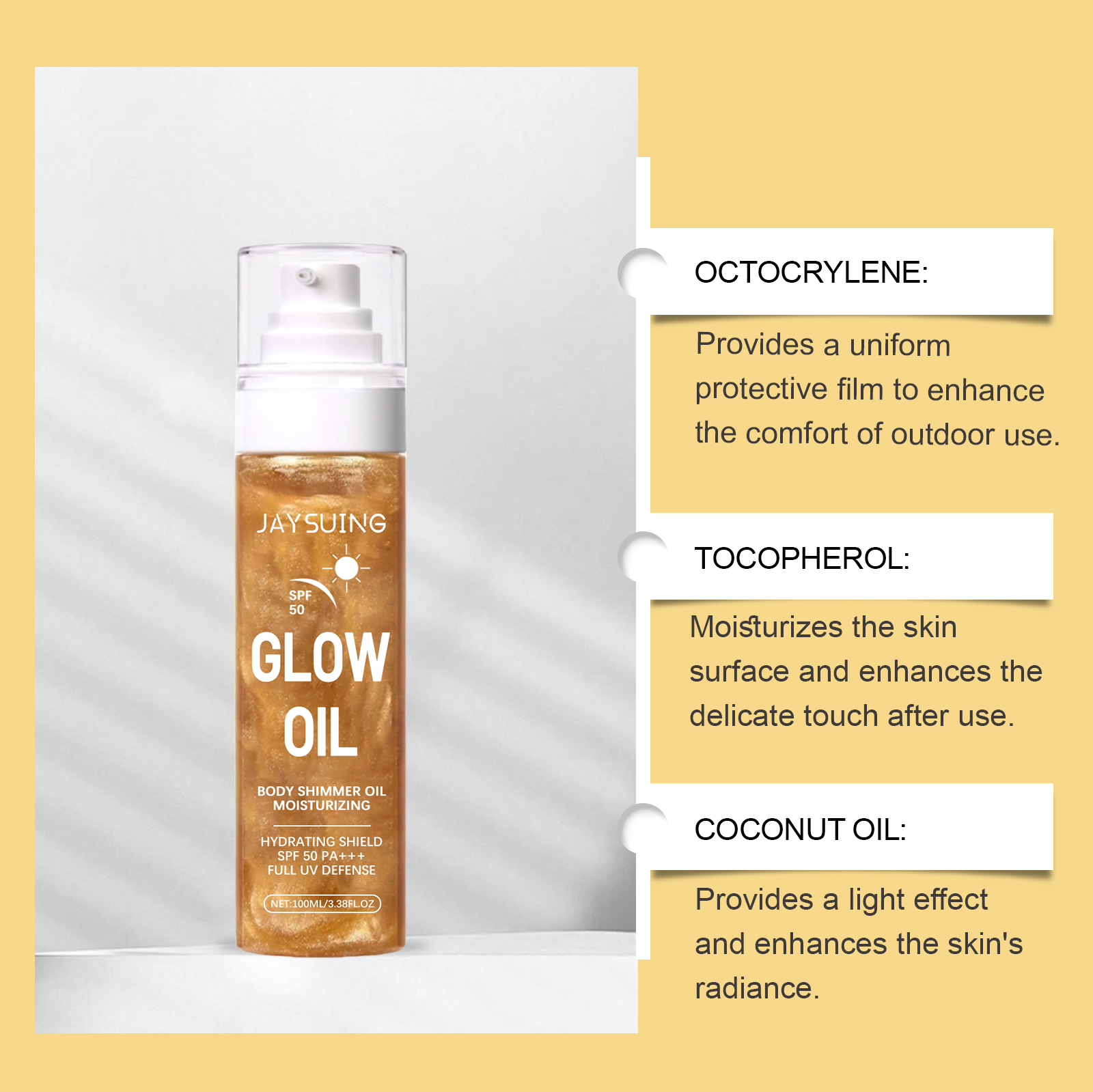 我们的椰子闪光防护油,由液体石蜡、甲氧基肉桂酸乙基己酯精心调配而成。专为有助于滋养同时防晒,为您打造健康光泽肌肤,清爽轻盈质地,不粘腻,适合夏日户外使用设计。使用方法极为便捷:1.清洁肌肤并保持干燥。2.取适量本品均匀涂抹在面部和身体肌肤,轻柔按摩直至吸收。3.出门或日晒前15分钟再涂抹一层,建议每2小时补充一次。并且它具有防水配方持久保护,可以适合游泳及高温环境,涂抹后展现健康亮泽光感效果。