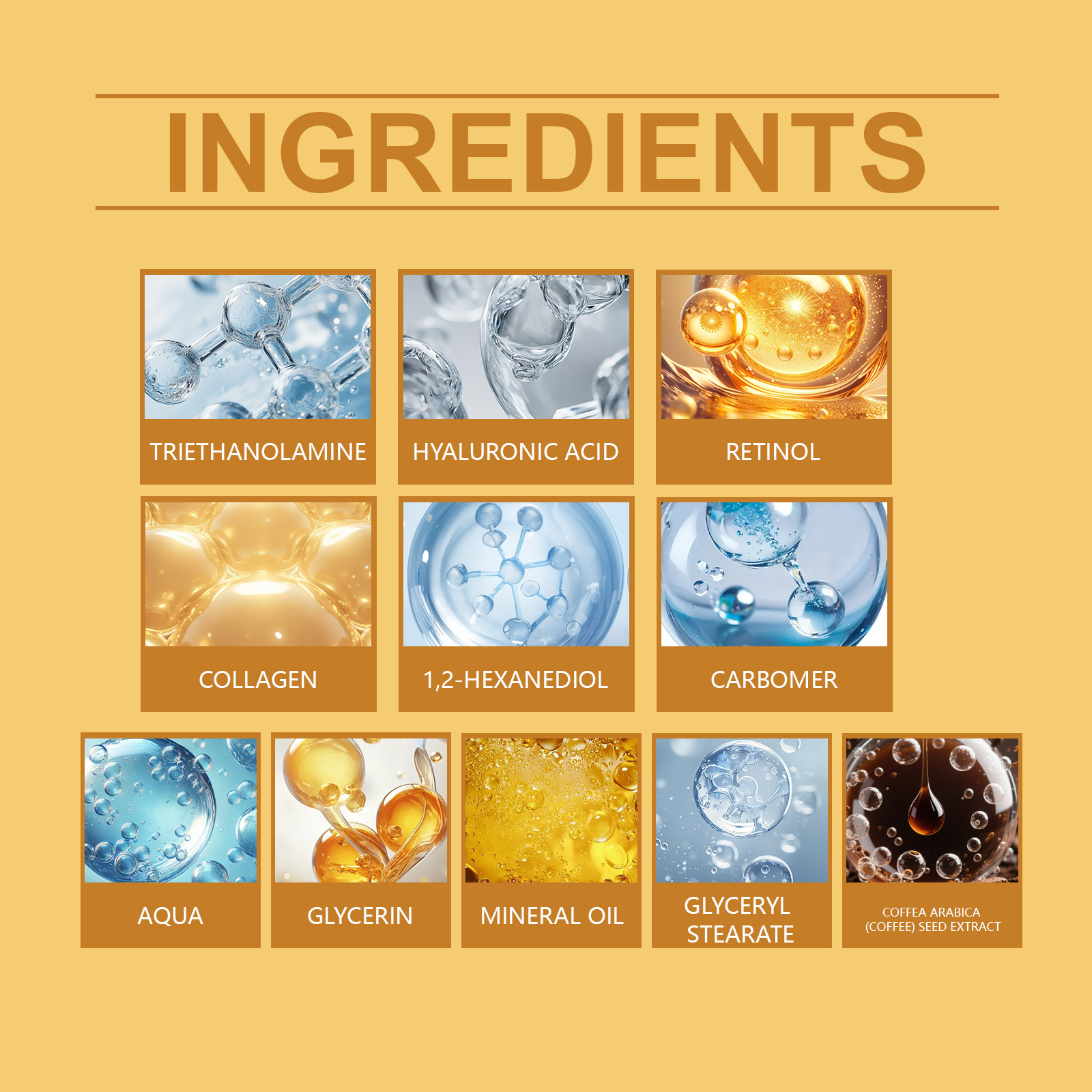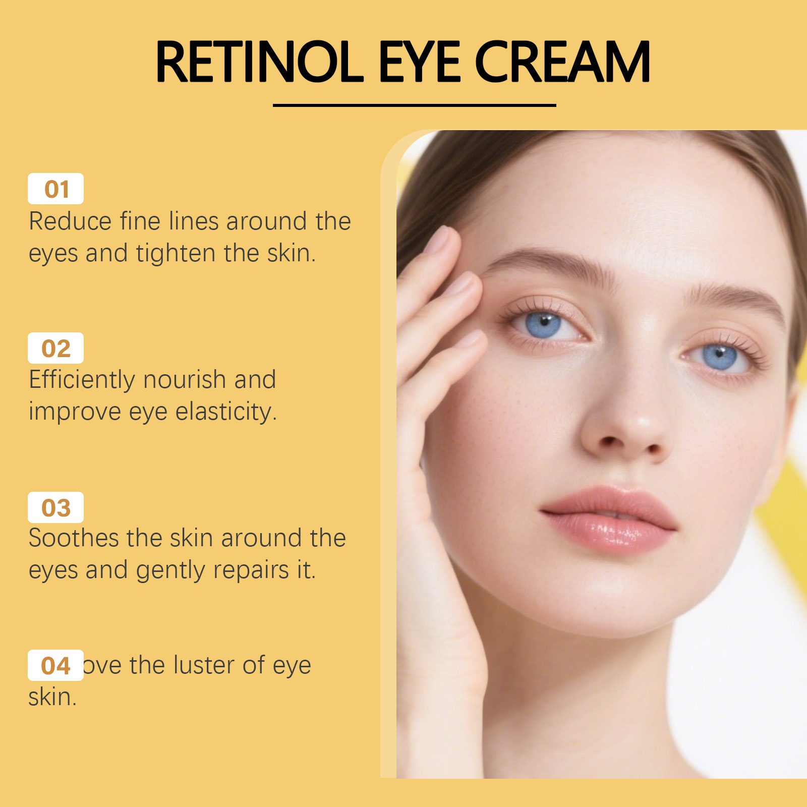 我们的视黄醇保湿眼霜,由甘油、矿油、甘油硬脂酸酯精心调配而成。专为紧致肌肤,有效淡化眼周细纹与皱纹,恢复弹性设计。使用方法极为便捷:清洁皮肤,取适量眼霜均匀涂抹在眼周,打圈按摩促进吸收。并且它可以加速细胞更新,促进皮肤细胞快速更新,减少暗沉,让眼周肌肤焕发新生光泽,针对眼周问题,显著改善黑眼圈,提升眼部整体亮度,重拾年轻明亮双眸。