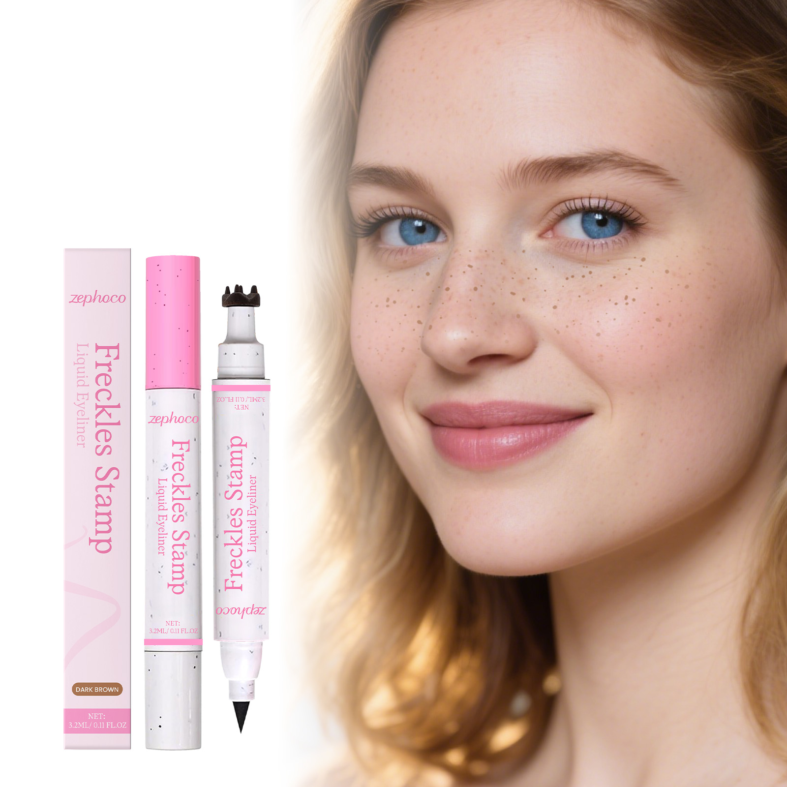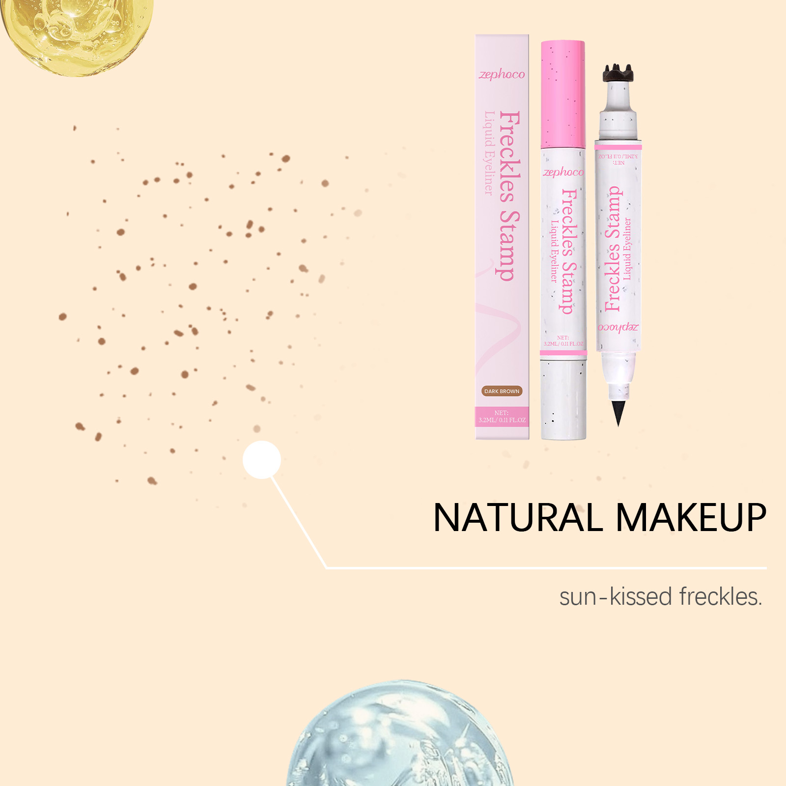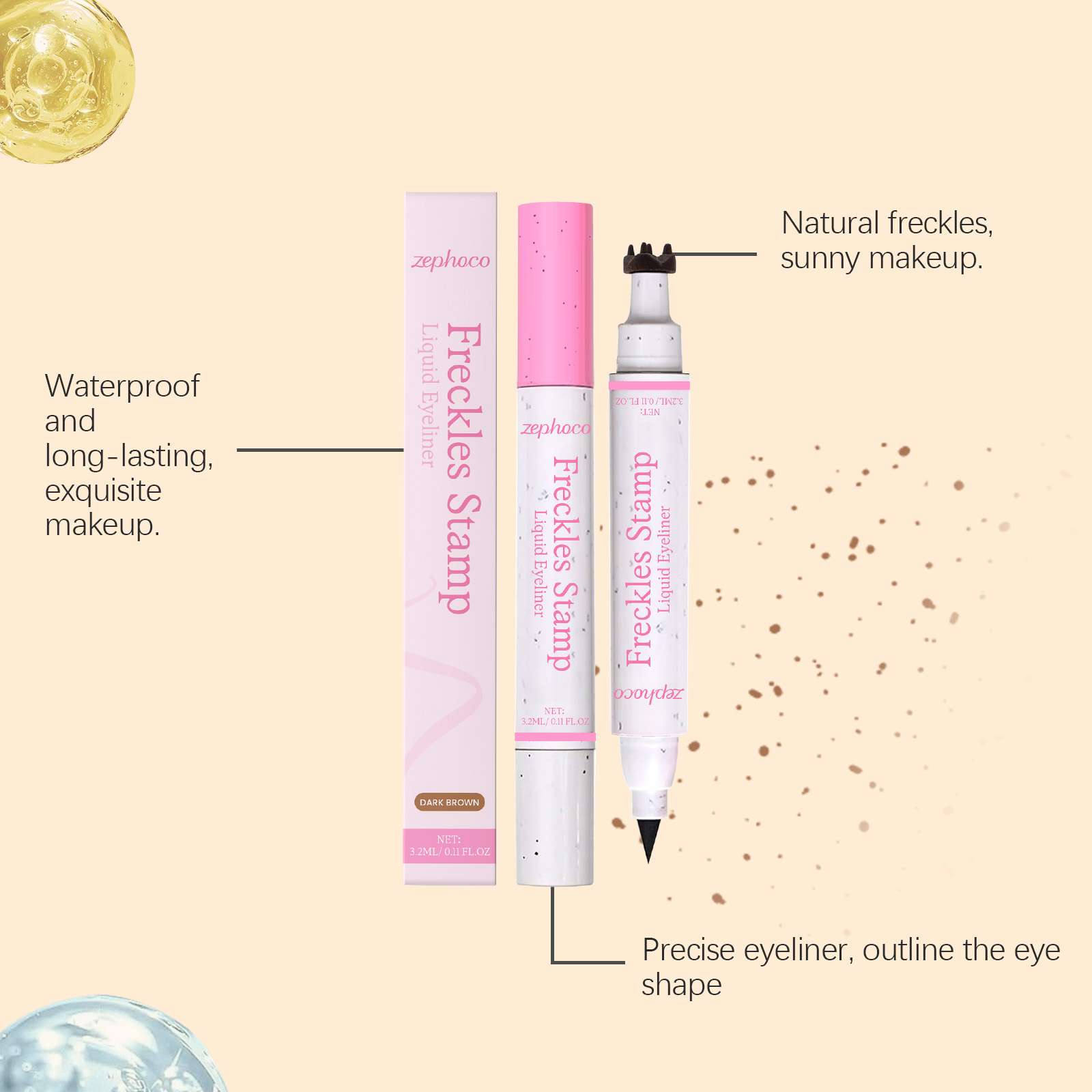 我们的2合1防水眼线笔雀斑笔(深棕色),由VP/DMAPA 丙烯酸(酯)类共聚物、甘油精心调配而成。专为打造自然雀斑,呈现阳光亲吻般妆容,眼线液一端画出精准分明的眼线,修饰眼型设计。使用方法极为便捷:用雀斑印章端轻点肌肤,用手指晕开,打造自然雀斑。再用眼线笔端,沿睫毛根部轻绘,勾勒出持久防水细眼线。并且它可以防水配方持久持妆,不易晕染,快干特性,适合所有肤质,支持多样妆容风格。