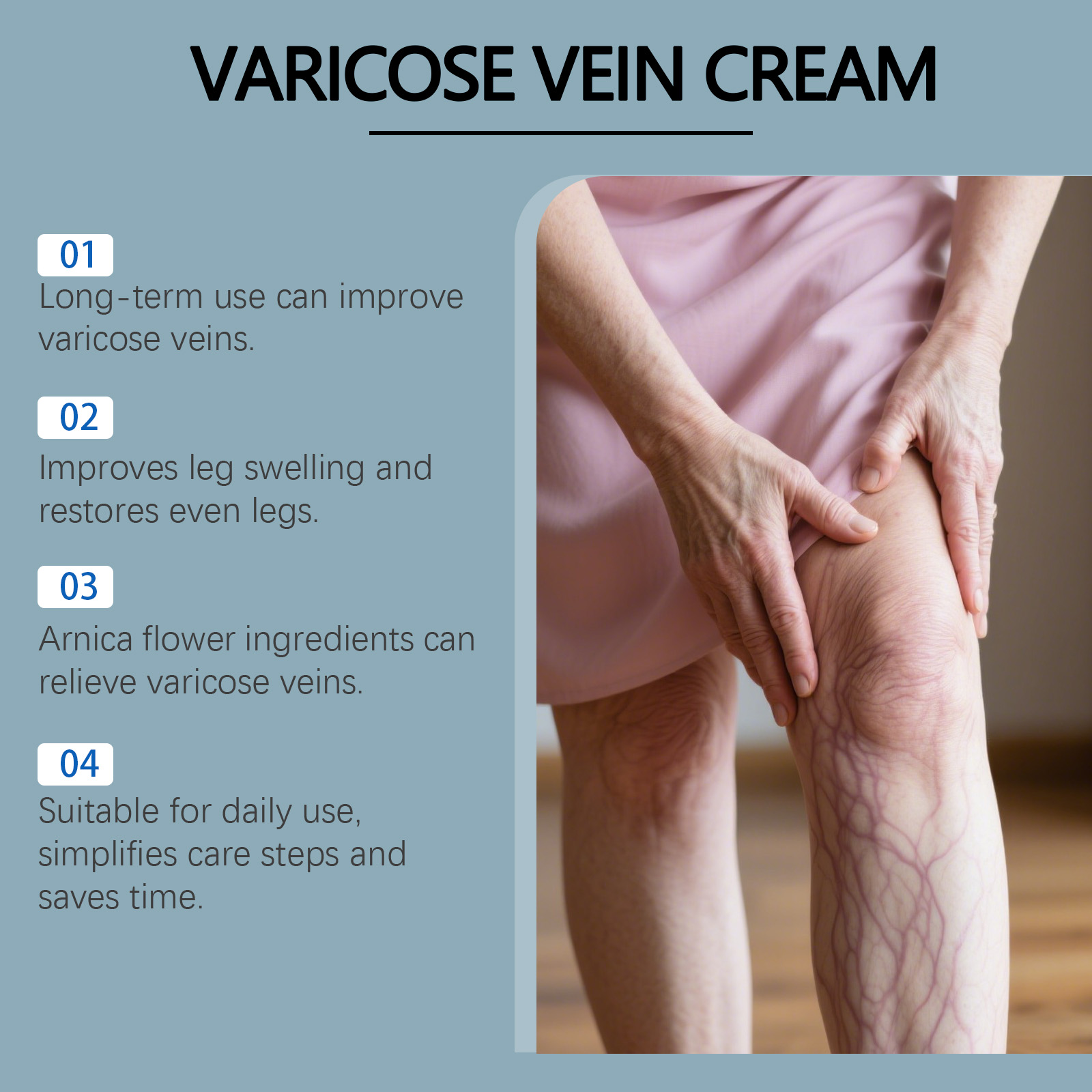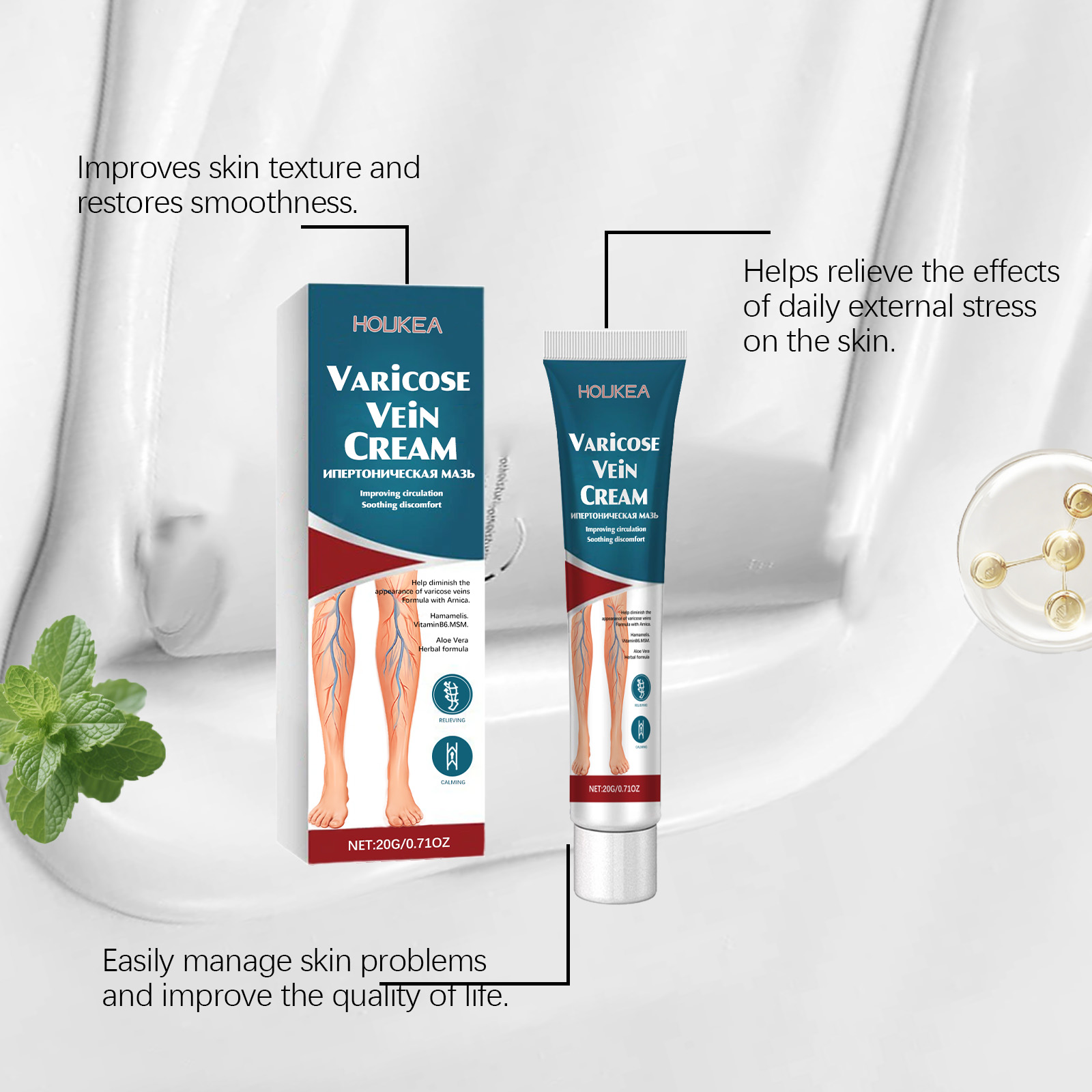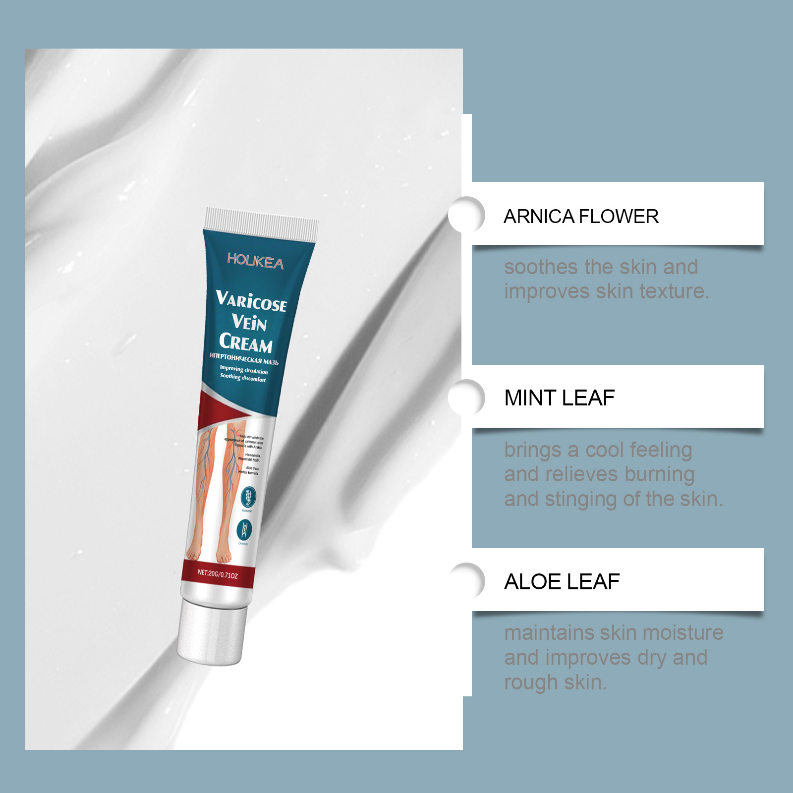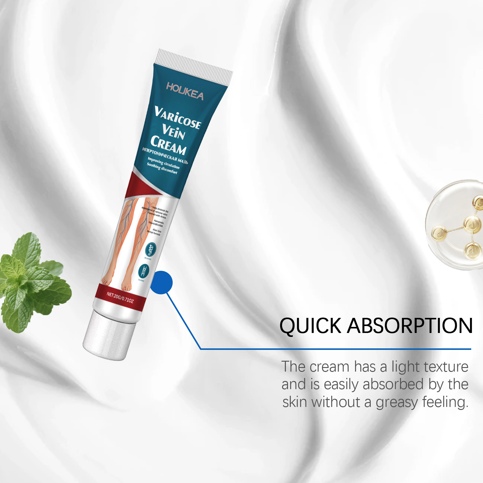 我们的腿部护理膏,由二甲砜、芦荟叶精心调配而成。专为缓解腿部静脉曲张并减少肿胀设计。使用方法极为便捷:清洁并干燥皮肤,取适量涂抹于腿部肌肤,并轻轻按摩,以促进吸收。并且可以促进血液循环并改善血管健康。