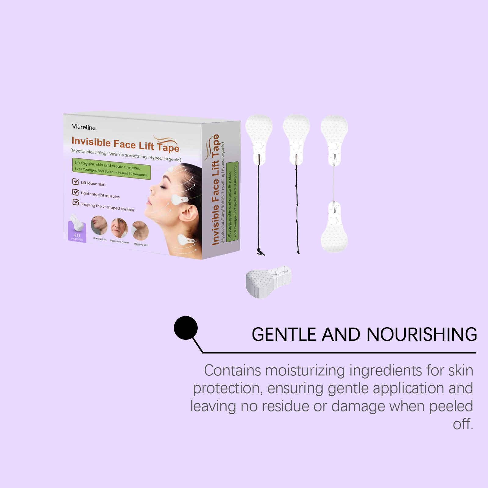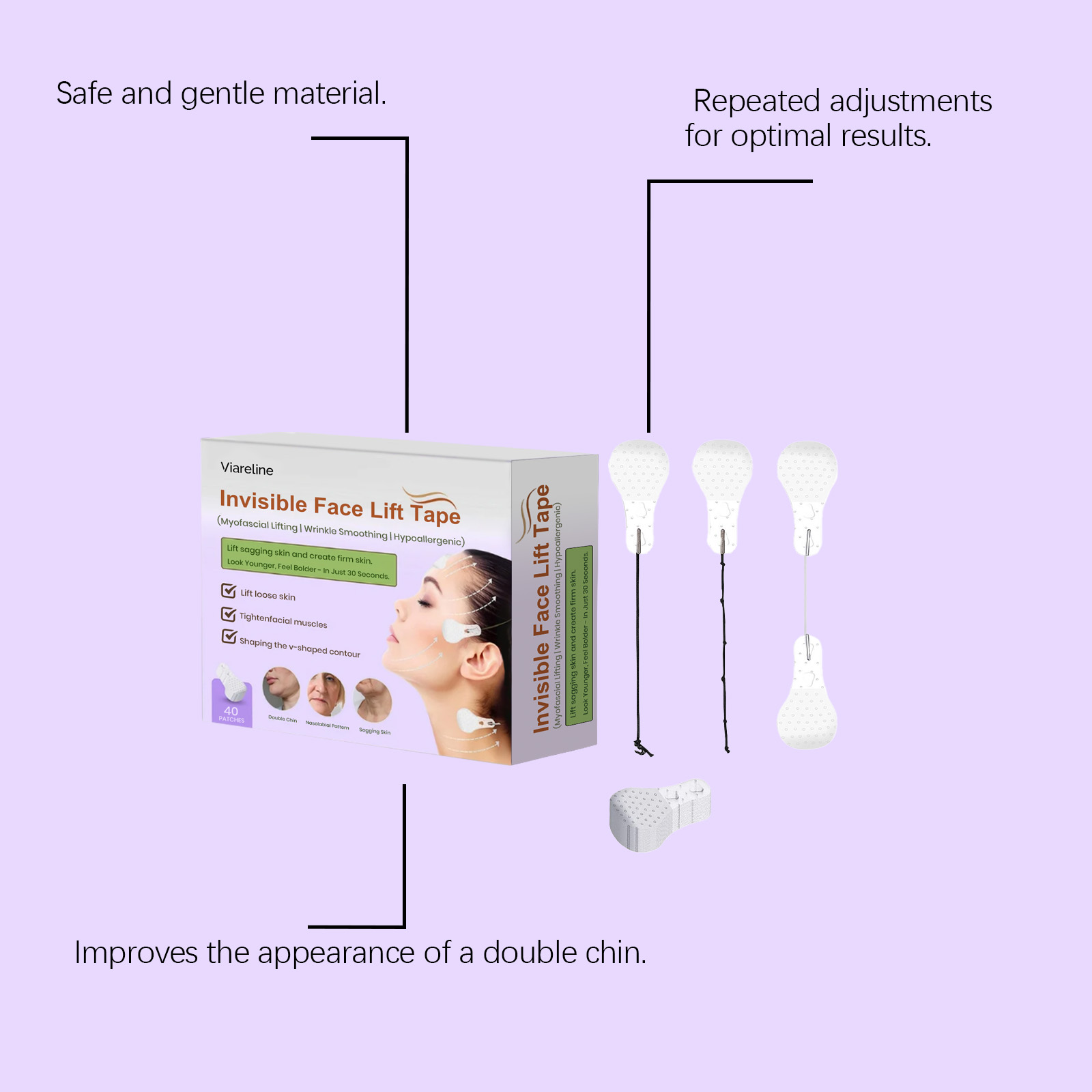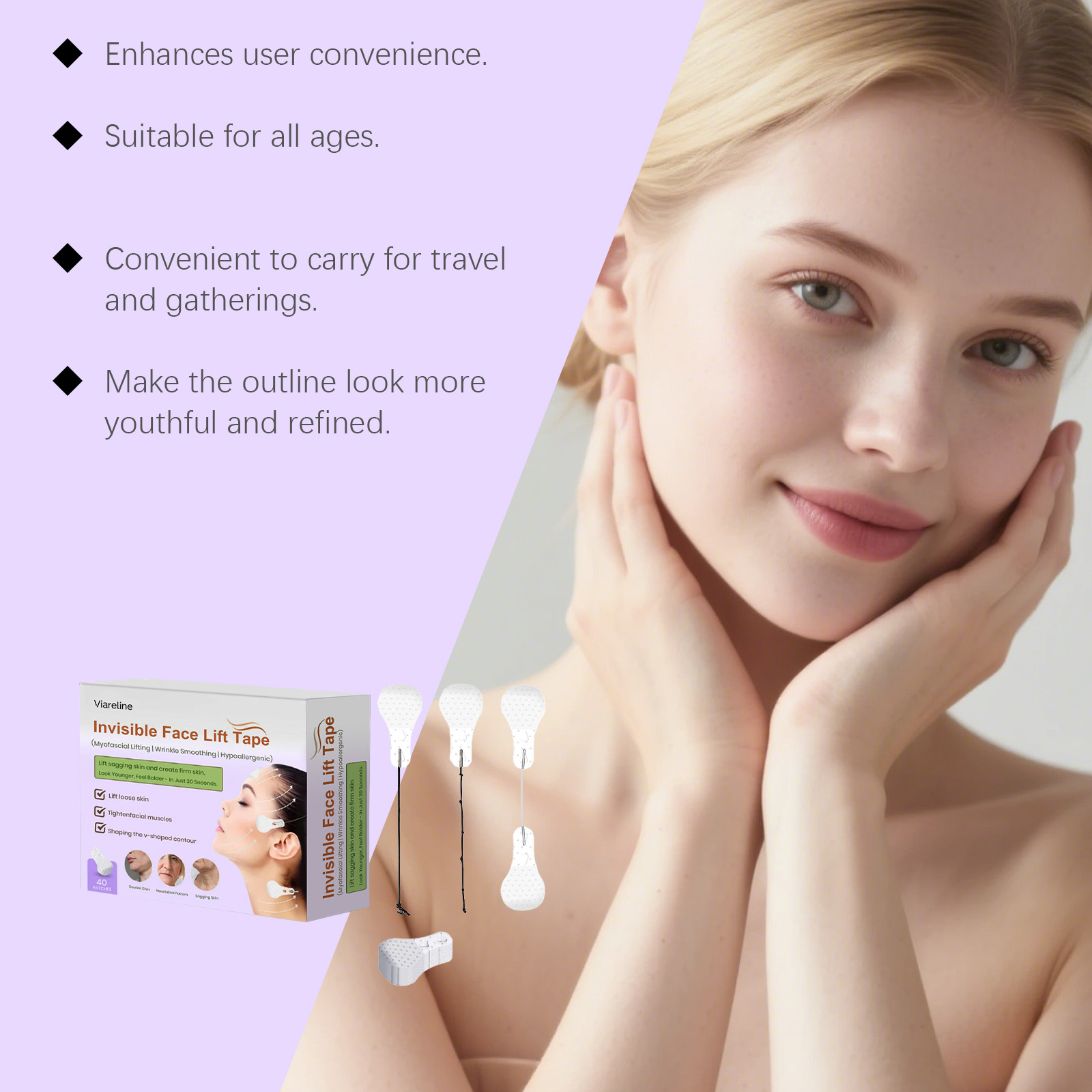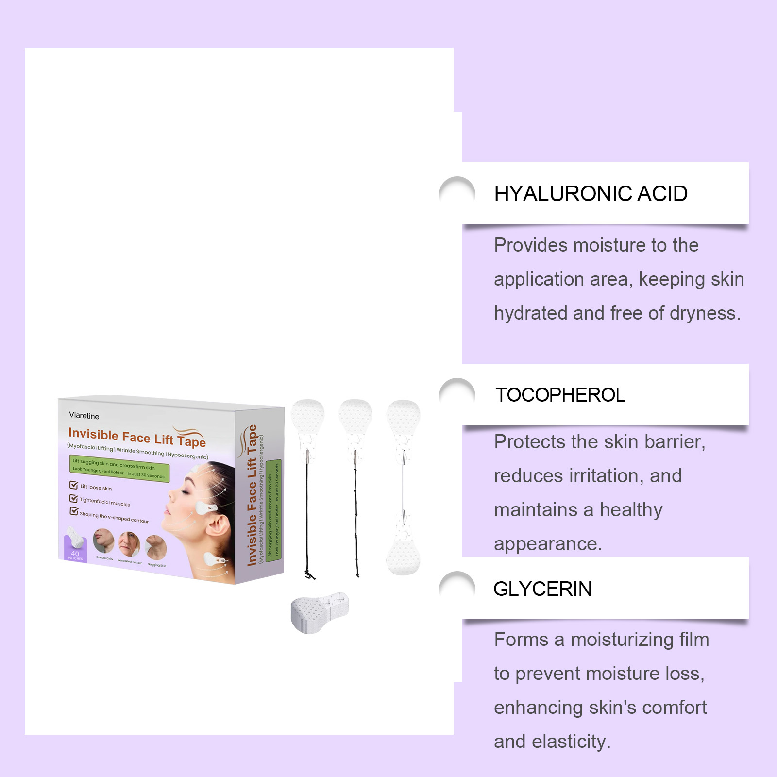我们的隐形面部提拉贴,由甘油、羟乙基纤维素精心调配而成。专为即刻提拉松弛肌肤重塑面部轮廓线条,打造紧致V脸效果设计。使用方法极为便捷:1.清洁肌肤并保持干燥。2.将隐形提拉贴贴在面部或颈部需要提拉的部位上,轻轻按压确保其粘合。3.若需增强提拉效果,可配合铁头绳、打结绳、带钩绳和提拉绳使用:将绳类配件按照合适方式固定,辅助贴片更好地发挥提升作用。并且它可以防水防汗科技确保贴片持久稳固,游泳运动不脱落,保持持久提拉效果不松弛不变形,超薄透气材质完美贴合肌肤纹理,隐形无痕不影响日常妆容,社交距离完全看不出来。