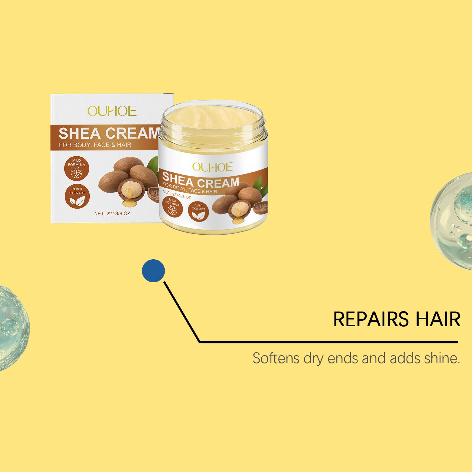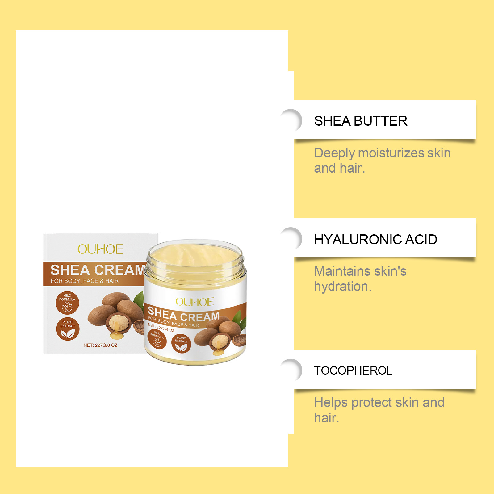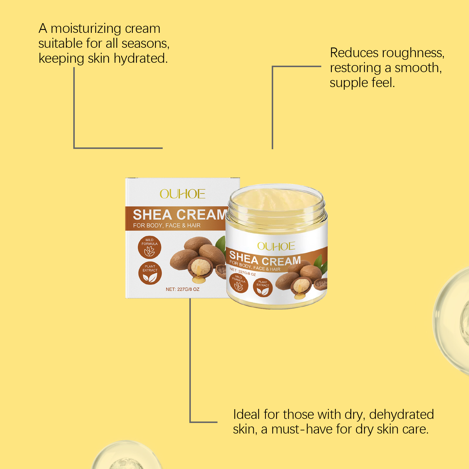 我们的乳木果多功能护理霜,由甘油、矿物油、硬脂酸甘油酯精心调配而成。专为缓解面部干燥紧绷,肌肤触感细腻有弹性,改善手肘、膝盖等粗糙部位,肌肤更显柔嫩设计。使用方法极为便捷:用在皮肤:1.清洁并干燥脸部或身体皮肤。2.将适量本品均匀涂抹在脸或身体的肌肤上。3.轻轻按摩直至吸收。用在头发:1.清洁头发并吹干或晾至半干。2.将适量本品均匀地涂抹在头发上。3.按摩头皮和头发直至吸收。并且它可以减少头发干枯分叉,发丝顺滑易梳理有光泽,一瓶满足面部、身体、头发护理需求,保湿更持久。