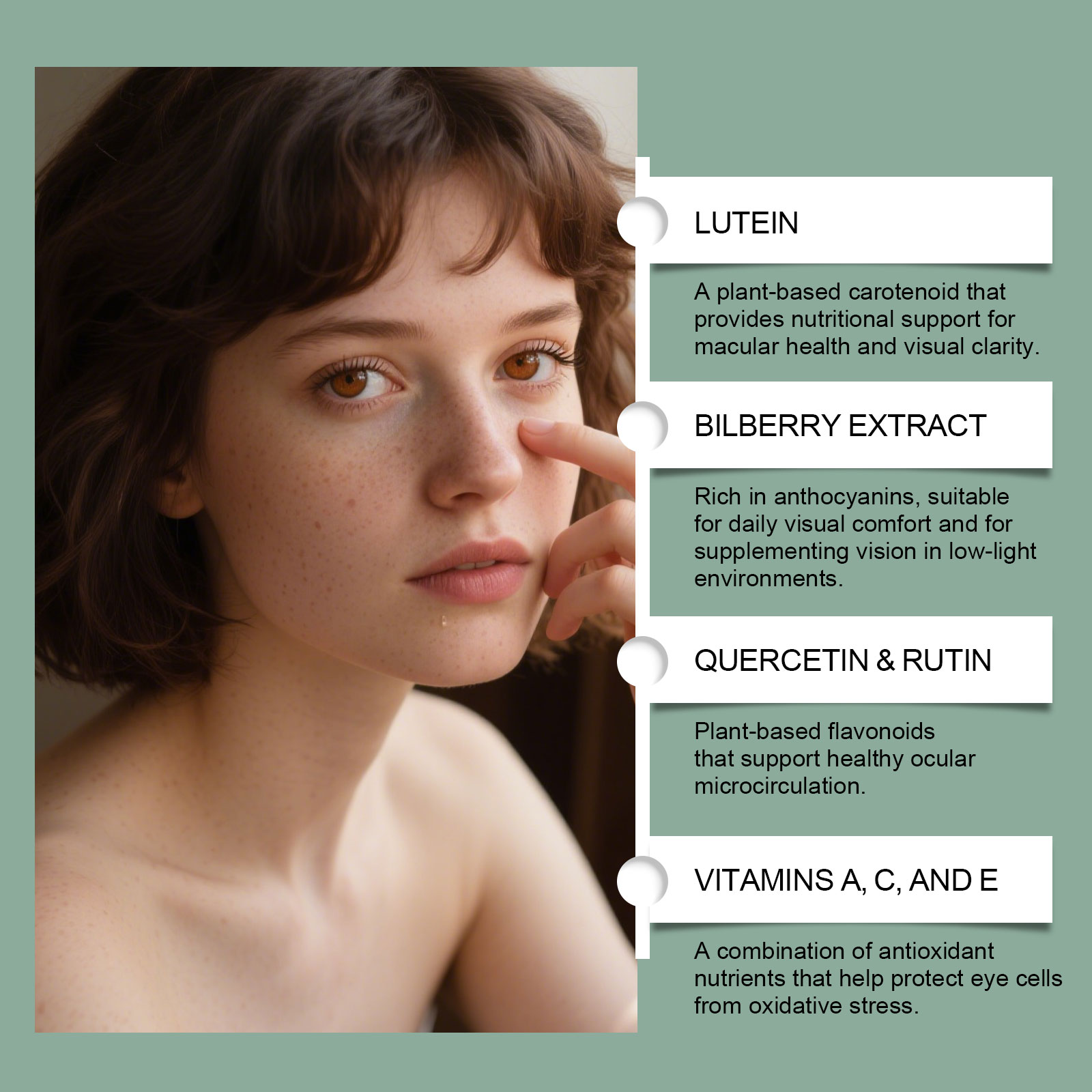 我们的眼睛呵护胶囊,由叶黄素、越橘提取物精心调配而成。专为支持黄斑区健康,提升视觉清晰度设计。使用方法极为便捷:一天2粒,吞服。并且它可以支持眼部微循环,促进健康视力,保护眼部细胞,抵御氧化压力。