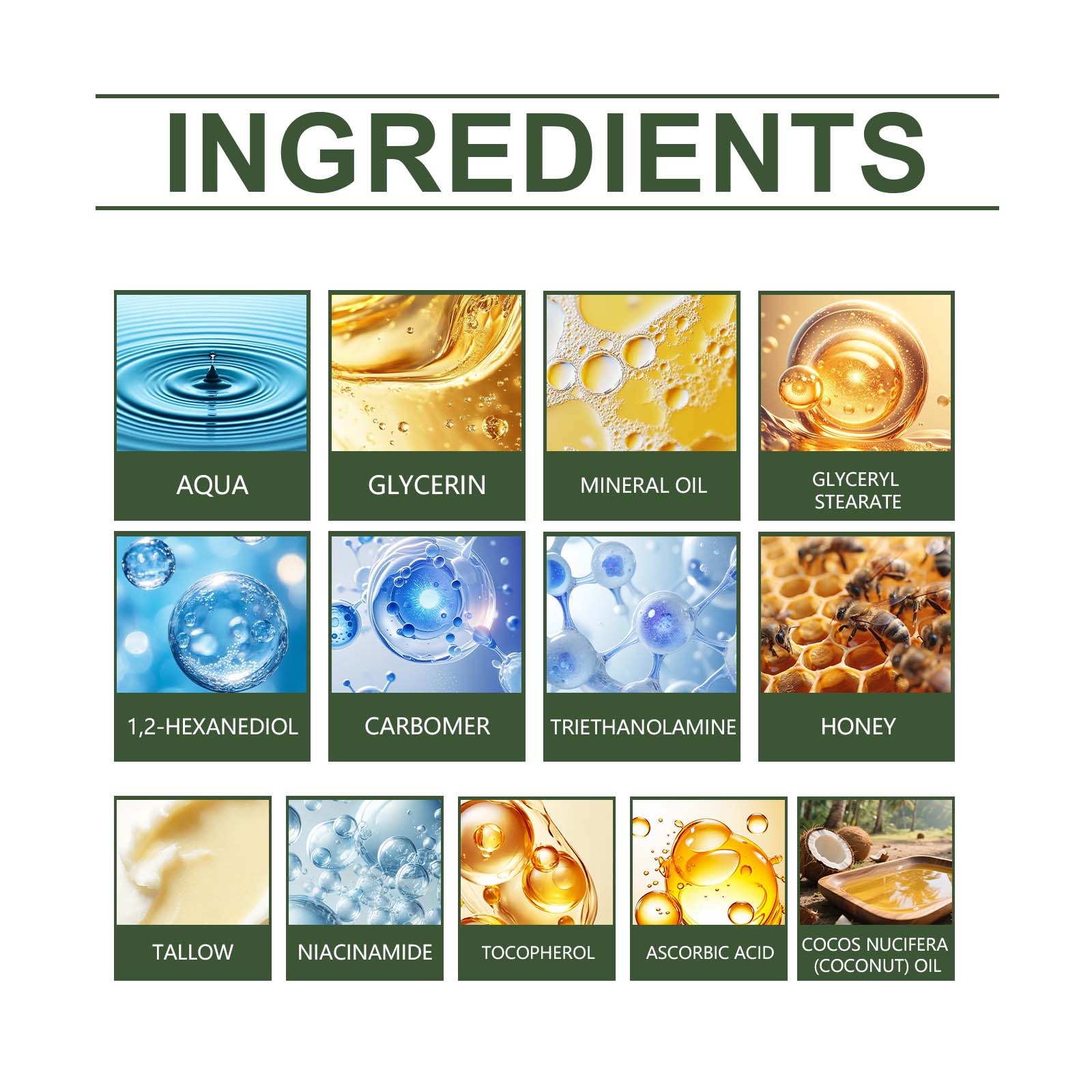 我们的牛脂蜂蜜保湿霜,由抗坏血酸(维生素C)椰子油精心调配而成。专为滋润干燥的皮肤设计。使用方法极为便捷:清洁并擦干皮肤。取适量本产品均匀涂抹于皮肤上。轻轻按摩至完全吸收。并且可以帮助皮肤保持水分并减少水分流失。