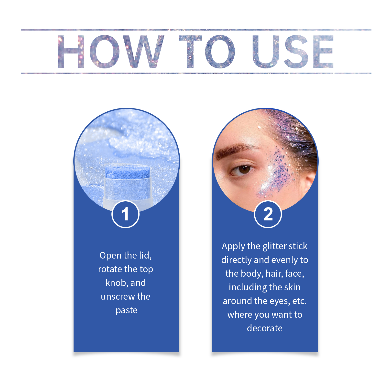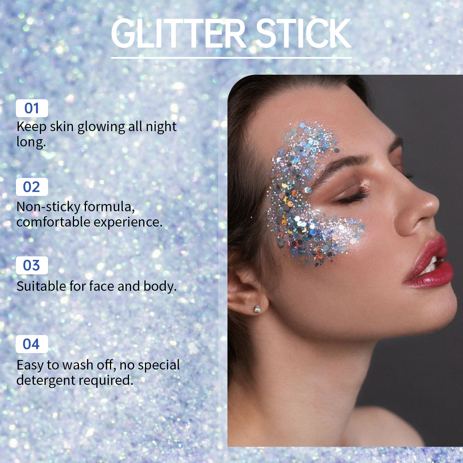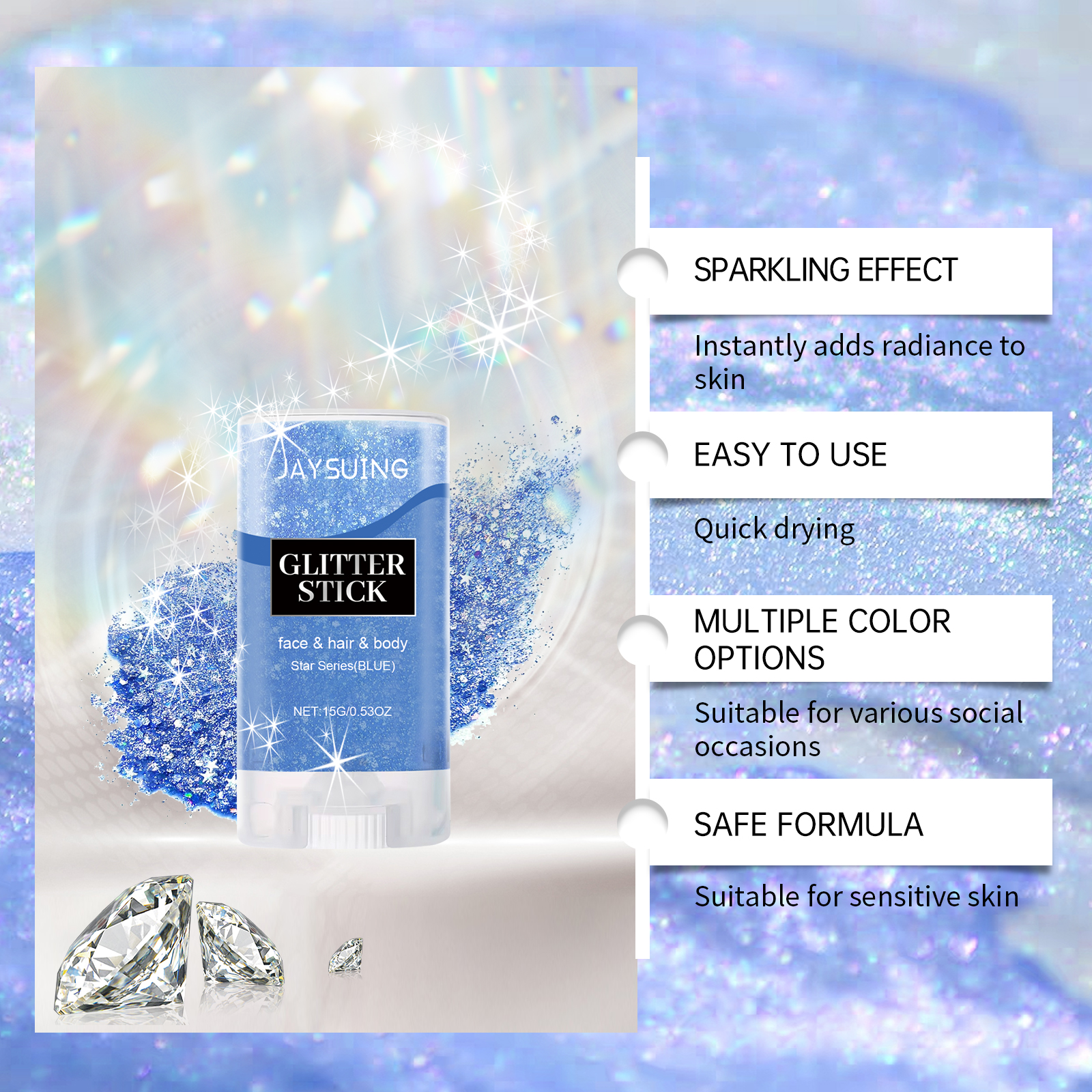 我们的亮片闪光棒(蓝色),由甘油、卡波姆、云母精心调配而成。专为增加皮肤光泽,让亮片长时间保持闪亮和迷人设计。使用方法极为便捷:1.打开盖子,旋转顶部旋钮,拧开膏体;2.将亮片棒直接均匀涂抹在身体、头发、脸部,包括眼周皮肤等你想要装饰的部位。并且加入闪亮的云母,瞬间提升你的个人魅力;适合各种社交场合,适合敏感肌肤。