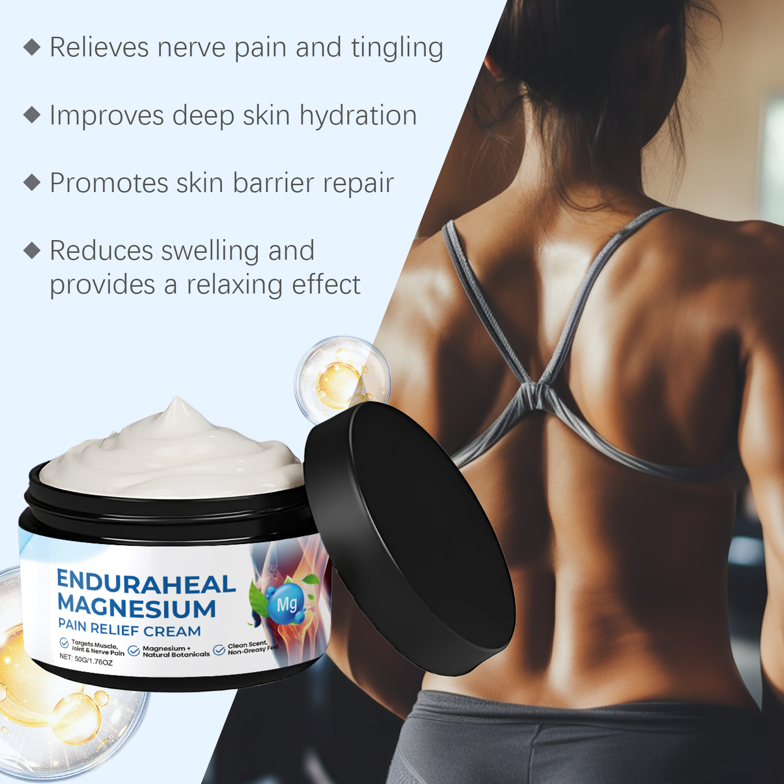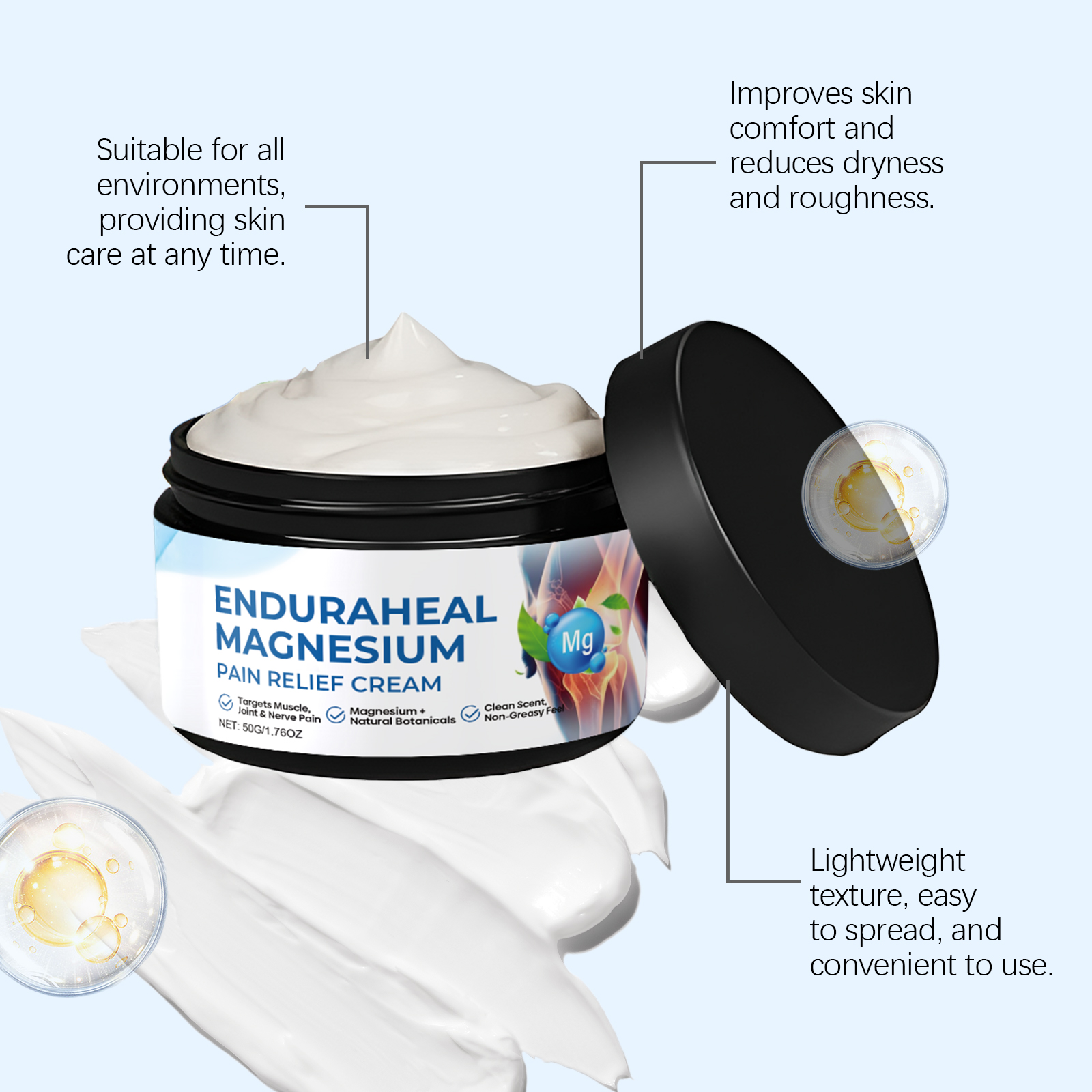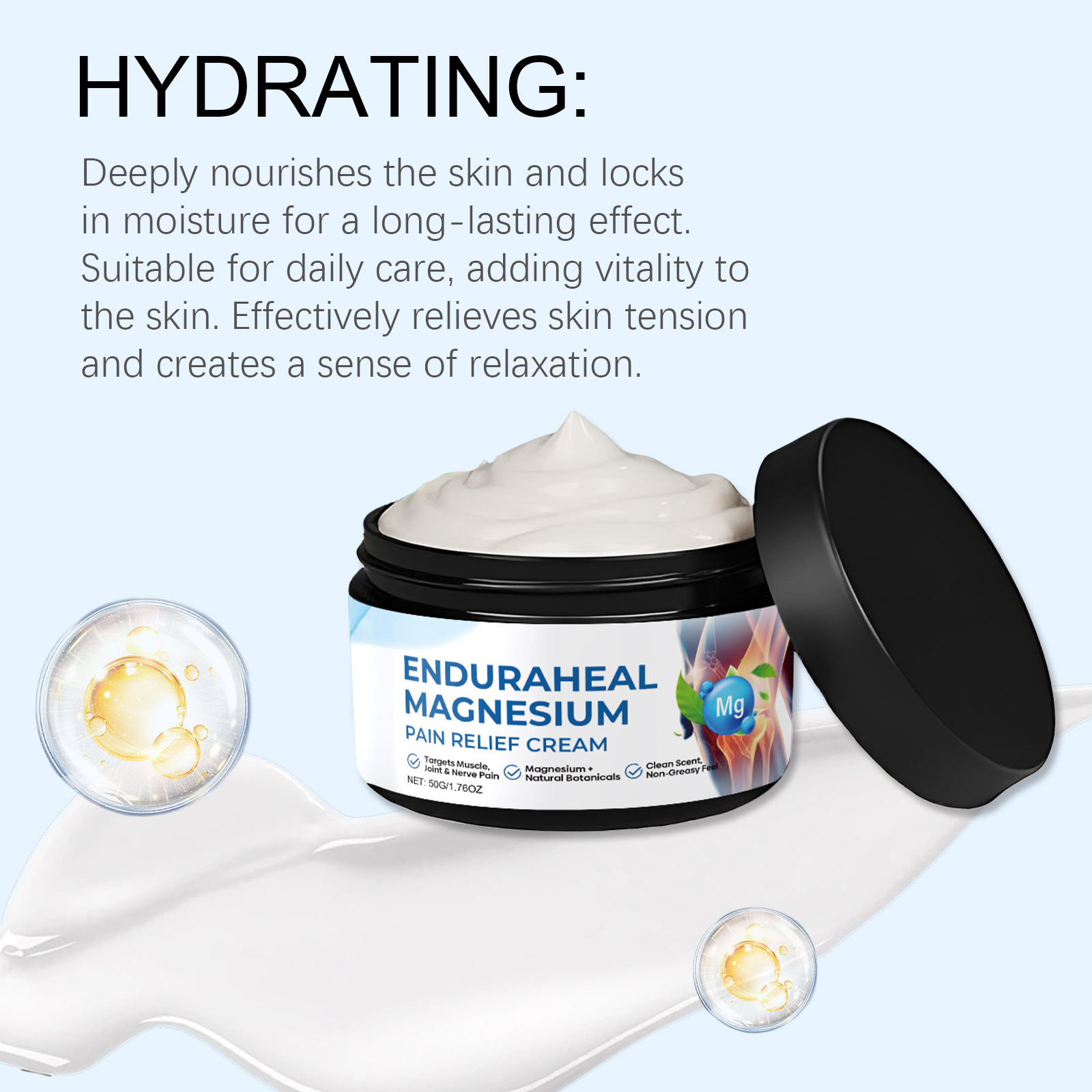 我们的关节护理镁霜,由甘油、矿油、甘油硬脂酸酯精心调配而成。专为改善血液流动,减少肿胀并提供温暖、放松的效果设计。使用方法极为便捷:清洁皮肤并干燥,取适量本品涂抹在疼痛患处并轻轻按摩促进吸收。并且它可以缓解神经疼痛和刺痛感,深层滋润肌肤,促进修复皮肤屏障。