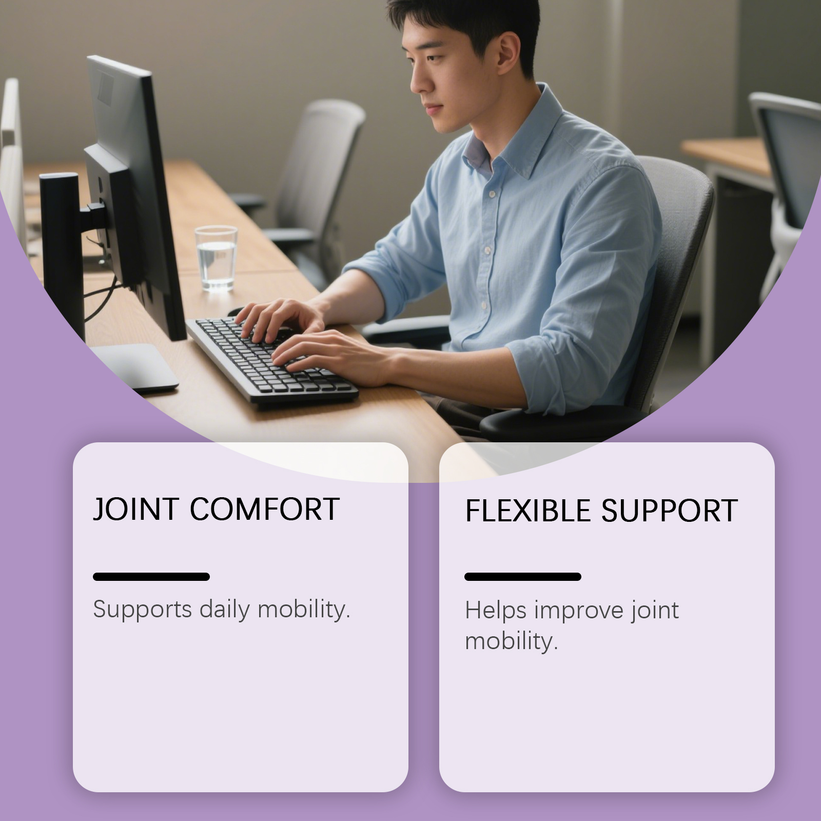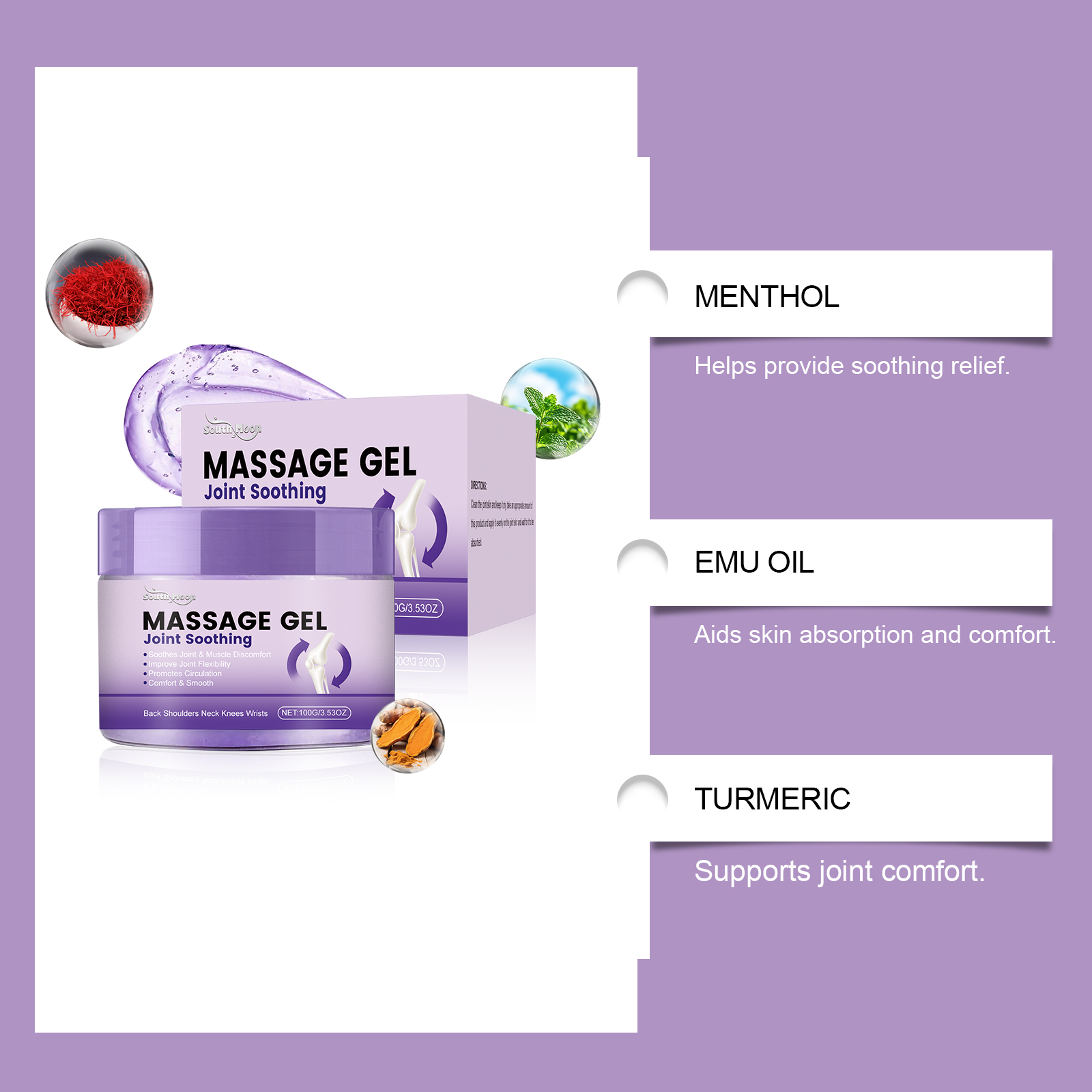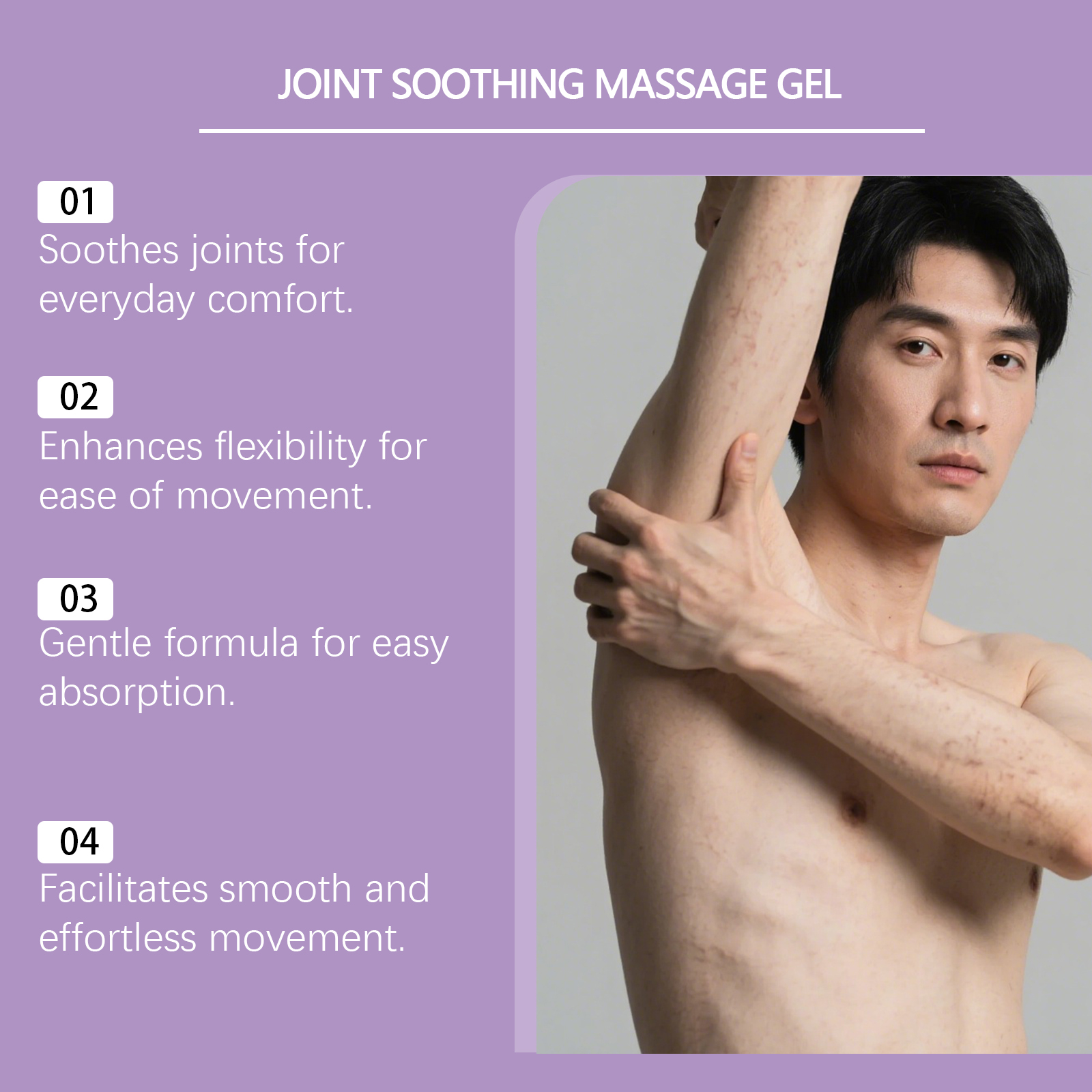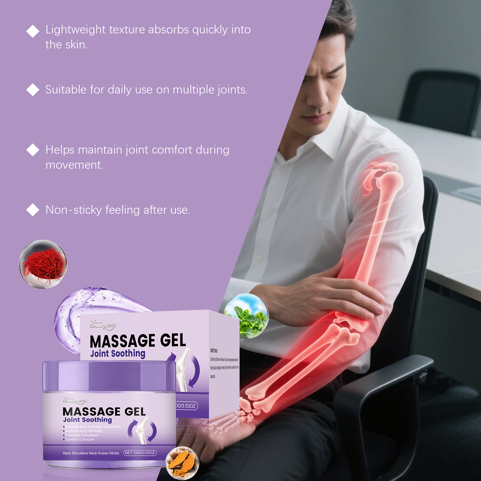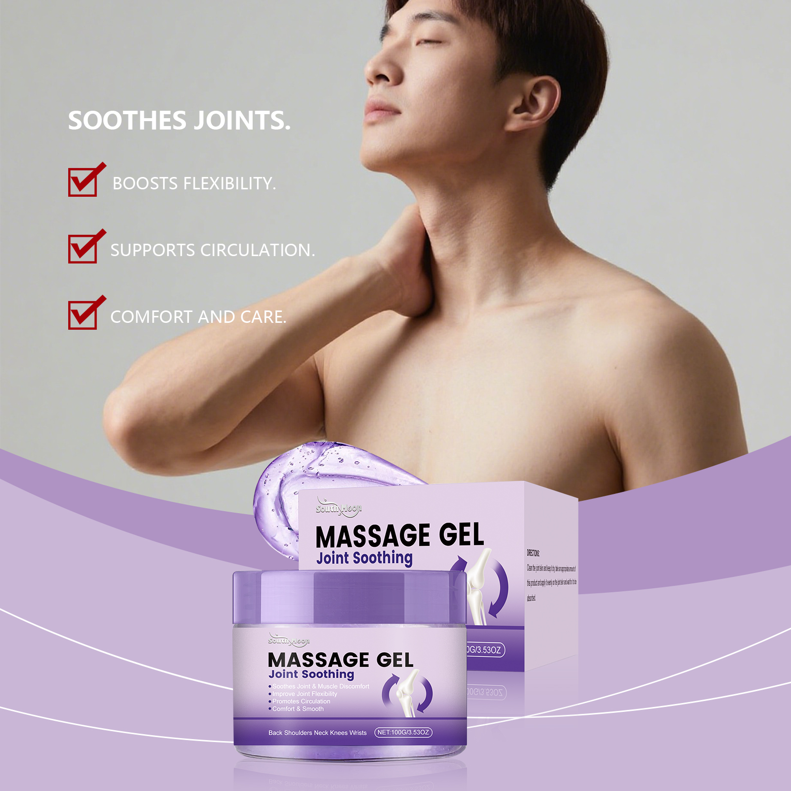 我们的关节护理按摩凝胶,由丙二醇、甘油精心调配而成。专为舒缓关节不适,助力促进关节周围循环,支持改善关节灵活性设计。使用方法极为便捷:清洁关节皮肤并保持干燥,取适量本产品均匀涂抹在关节皮肤上,并等待其被吸收。并且它可以助力促进循环,支持关节舒适运作,有助于日常活动中维持关节舒适状态。