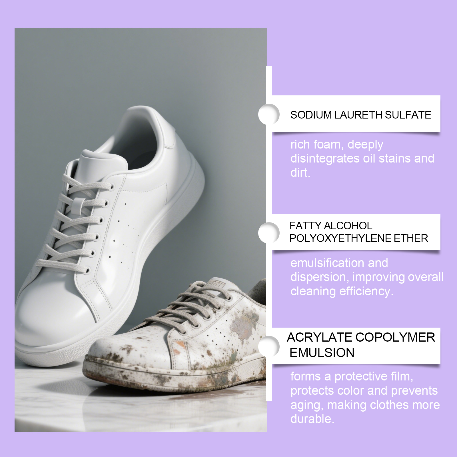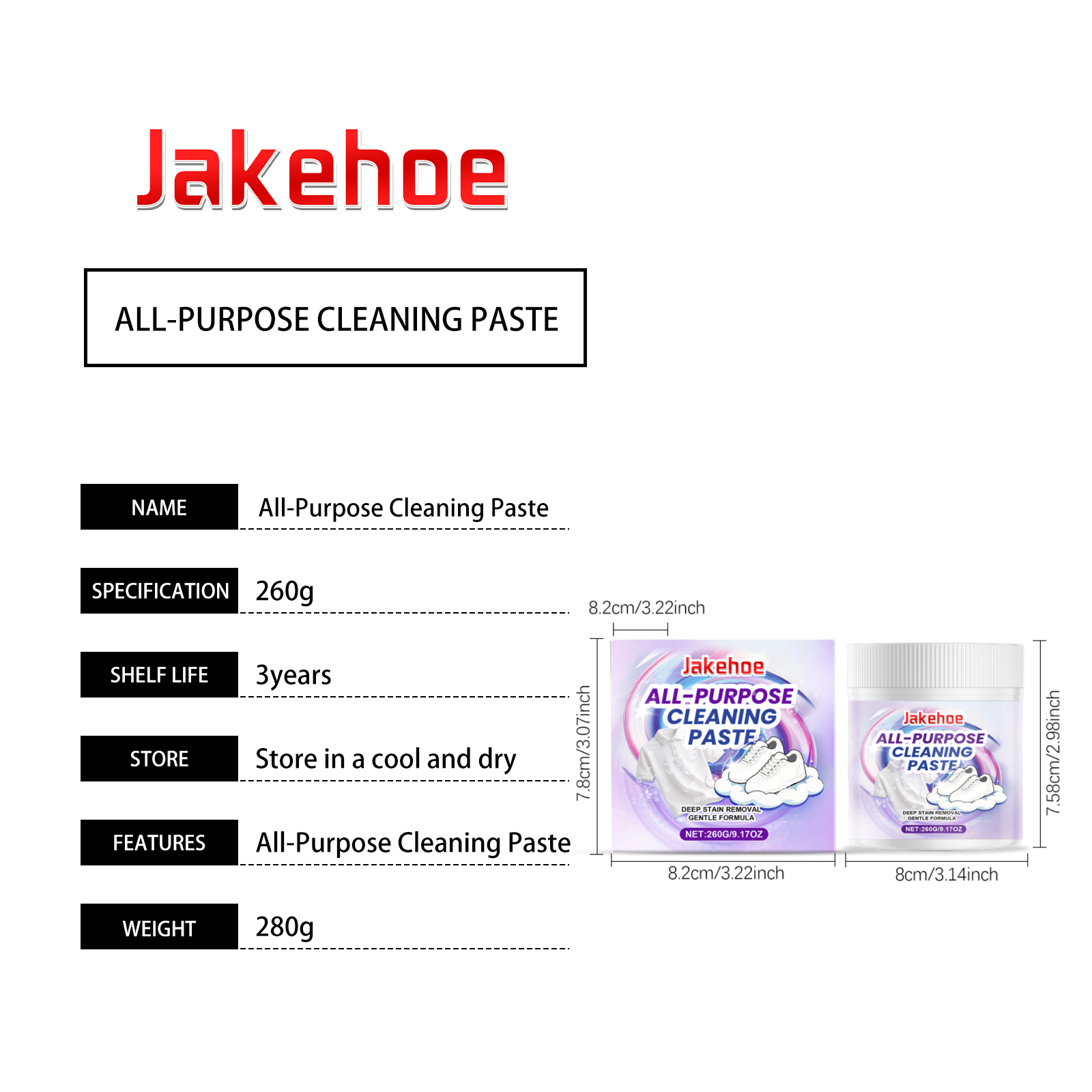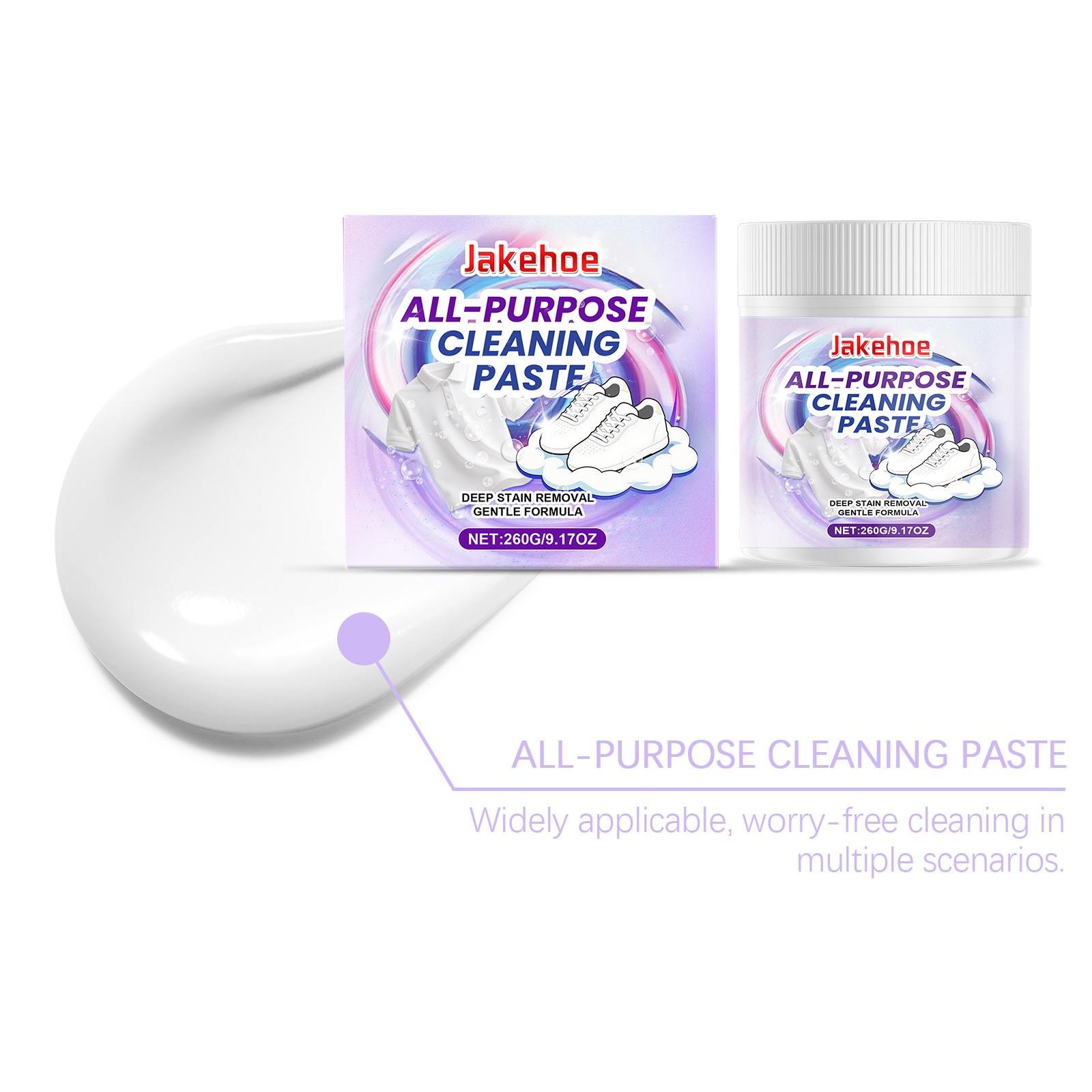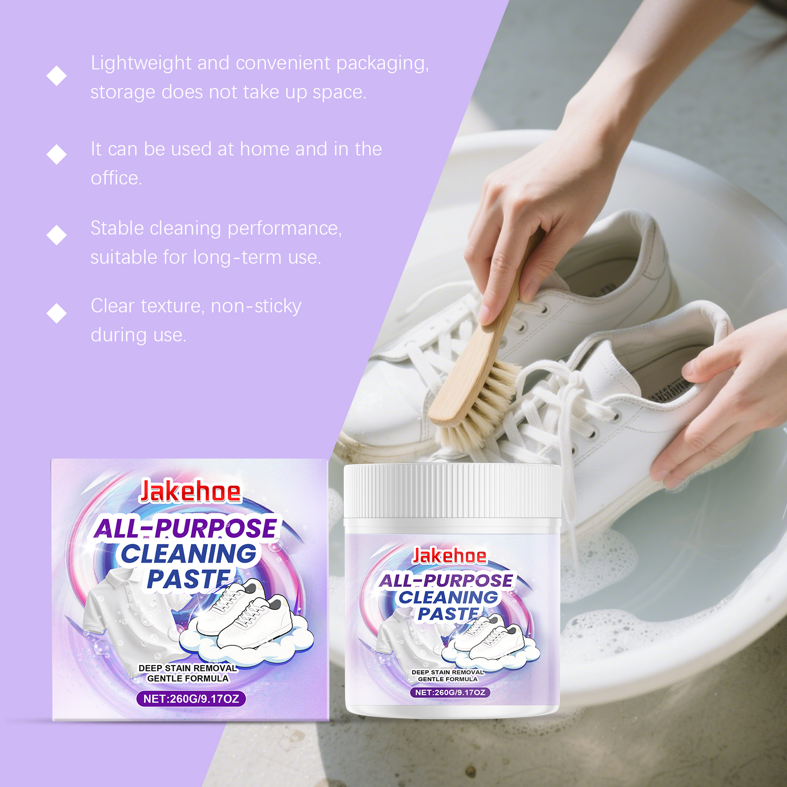 我们的多用途清洁膏,由盐、月桂醇聚醚硫酸酯钠精心调配而成。专为强力去污,顽固污渍快速瓦解设计。使用方法极为便捷:1.取少量清洁膏放在衣鞋上。2.借助少量水擦拭,如遇顽固污渍反复擦拭即可,如要清洁衣物取适量清洁膏倒入洗衣机即可(同洗衣液原理)。3.用清水冲洗干净即可。并且它适用广泛,多场景清洁无忧,高效清洁,油脂污垢一扫而光。