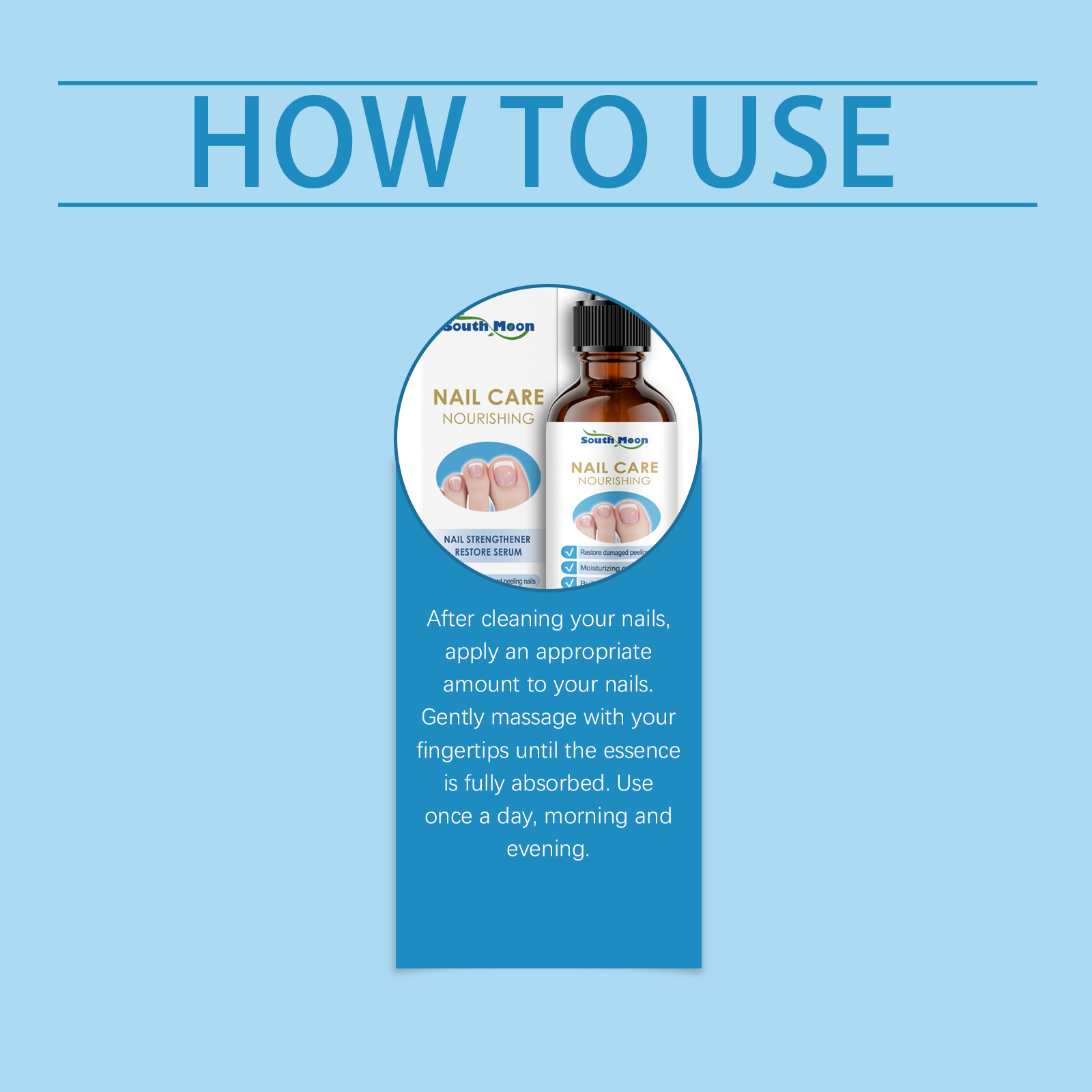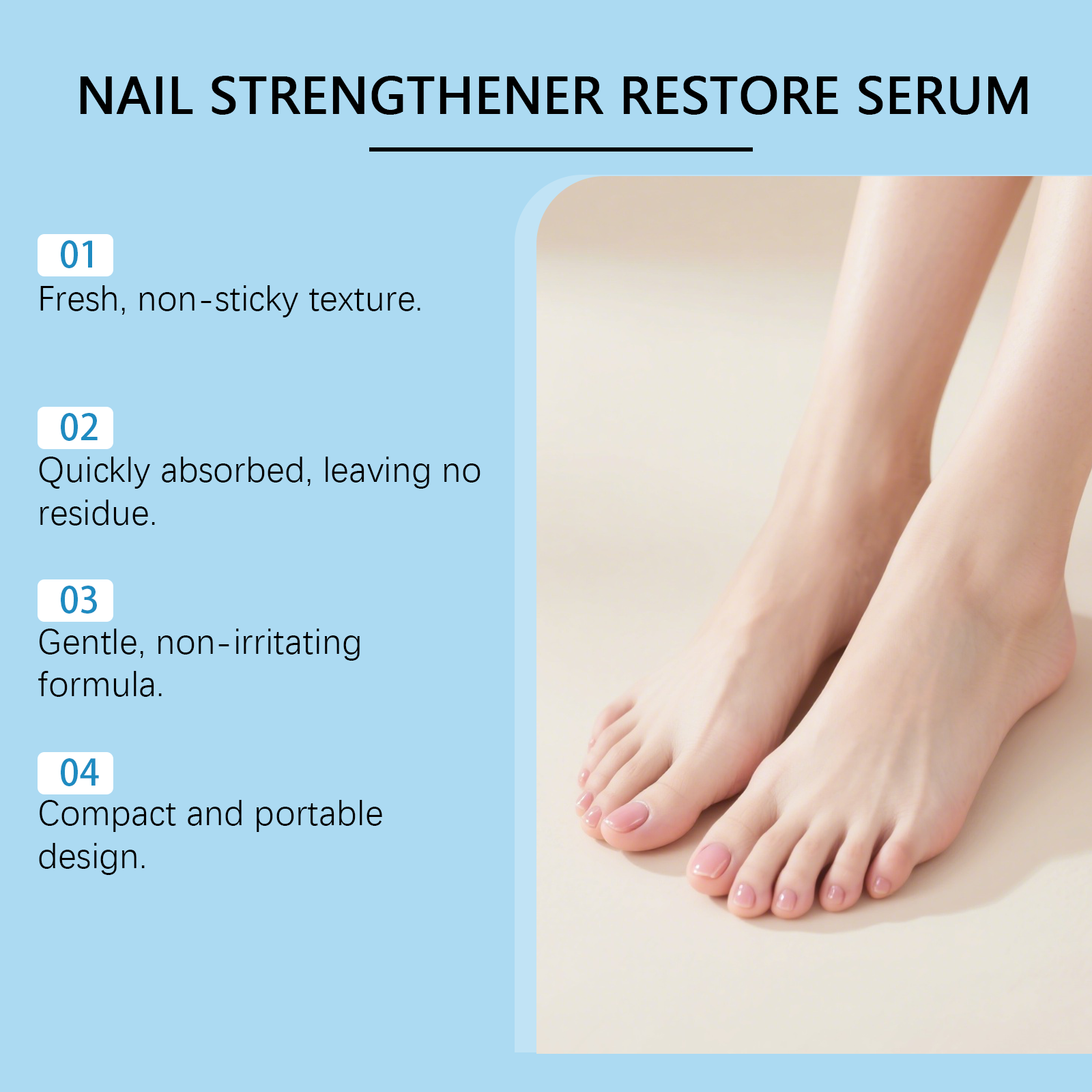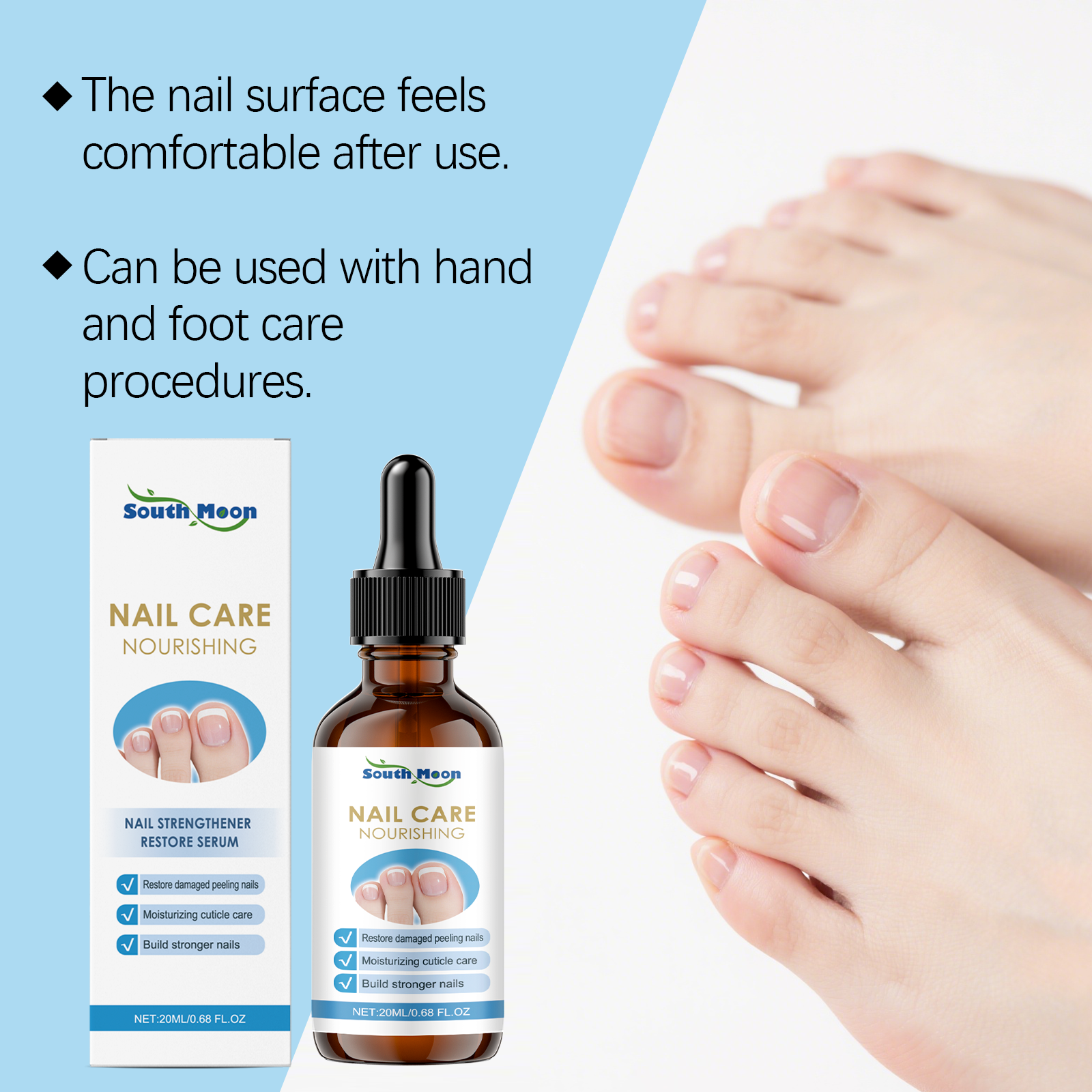 我们的甲部净护精华液,由甘油、尿囊素精心调配而成。专为保持指甲健康设计。使用方法极为便捷:清洁指甲后,适量涂抹于指甲上。用指尖轻轻按摩,直至精华完全吸收。每天使用一次,早晚均可。并且有助于增强指甲。