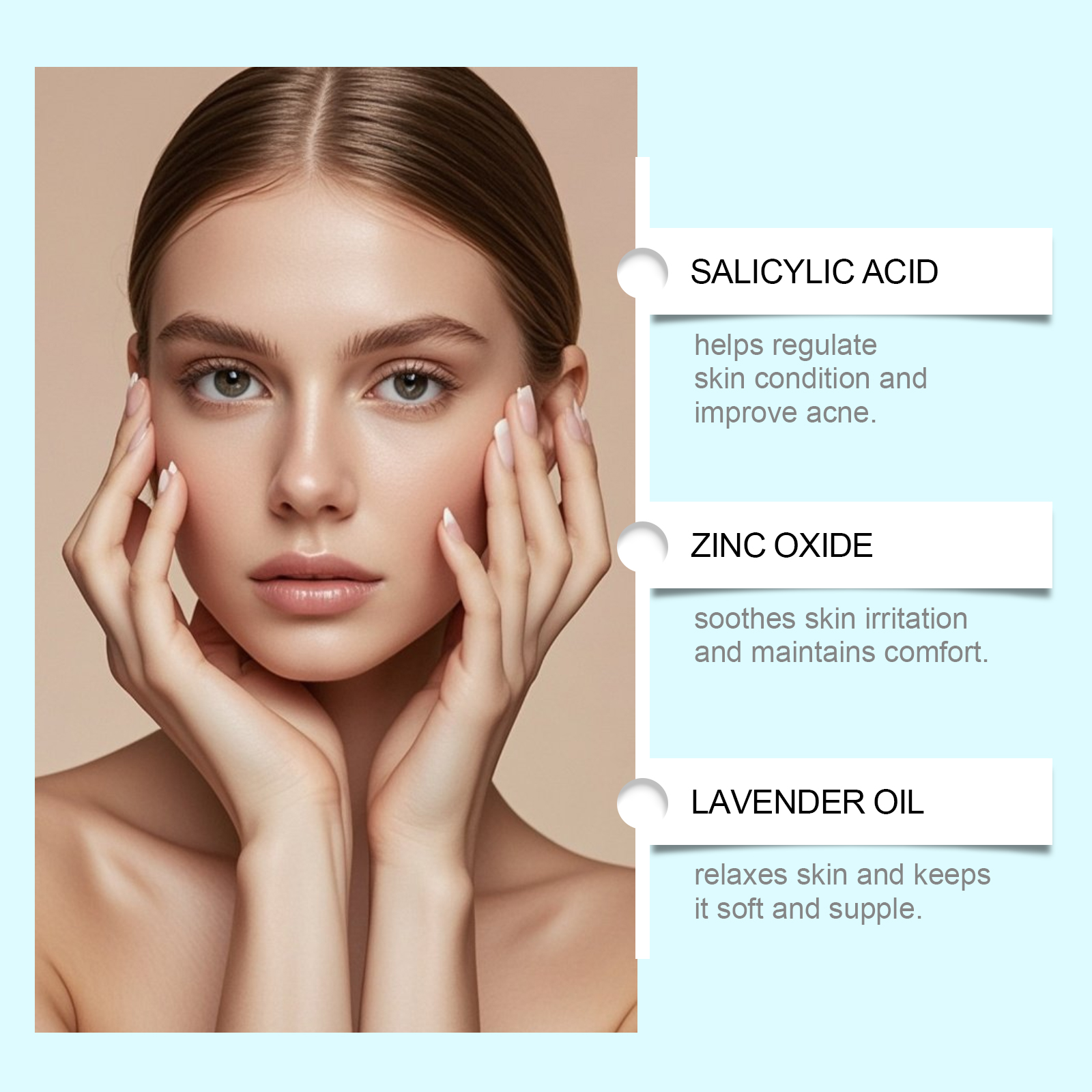 我们的痘痘护理霜,由甘油、矿油、甘油硬脂酸酯精心调配而成。专为淡化痘痘粉刺闭口改善痘肌设计。使用方法极为便捷:清洁并干燥肌肤,取适量本品均匀涂抹在肌肤上,轻轻按摩直至吸收。并且它可以维持肌肤水润平衡改善肌肤状态,形成透气保护屏障舒缓肌肤不适感。