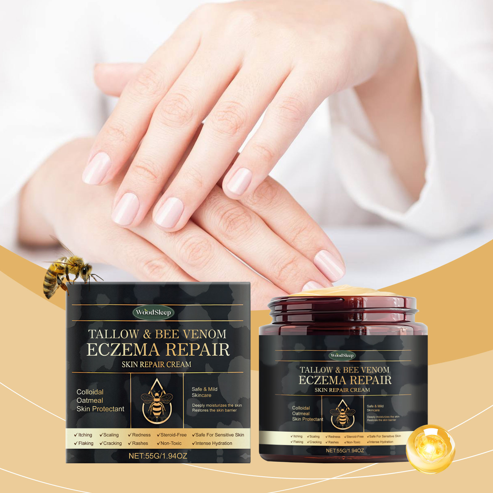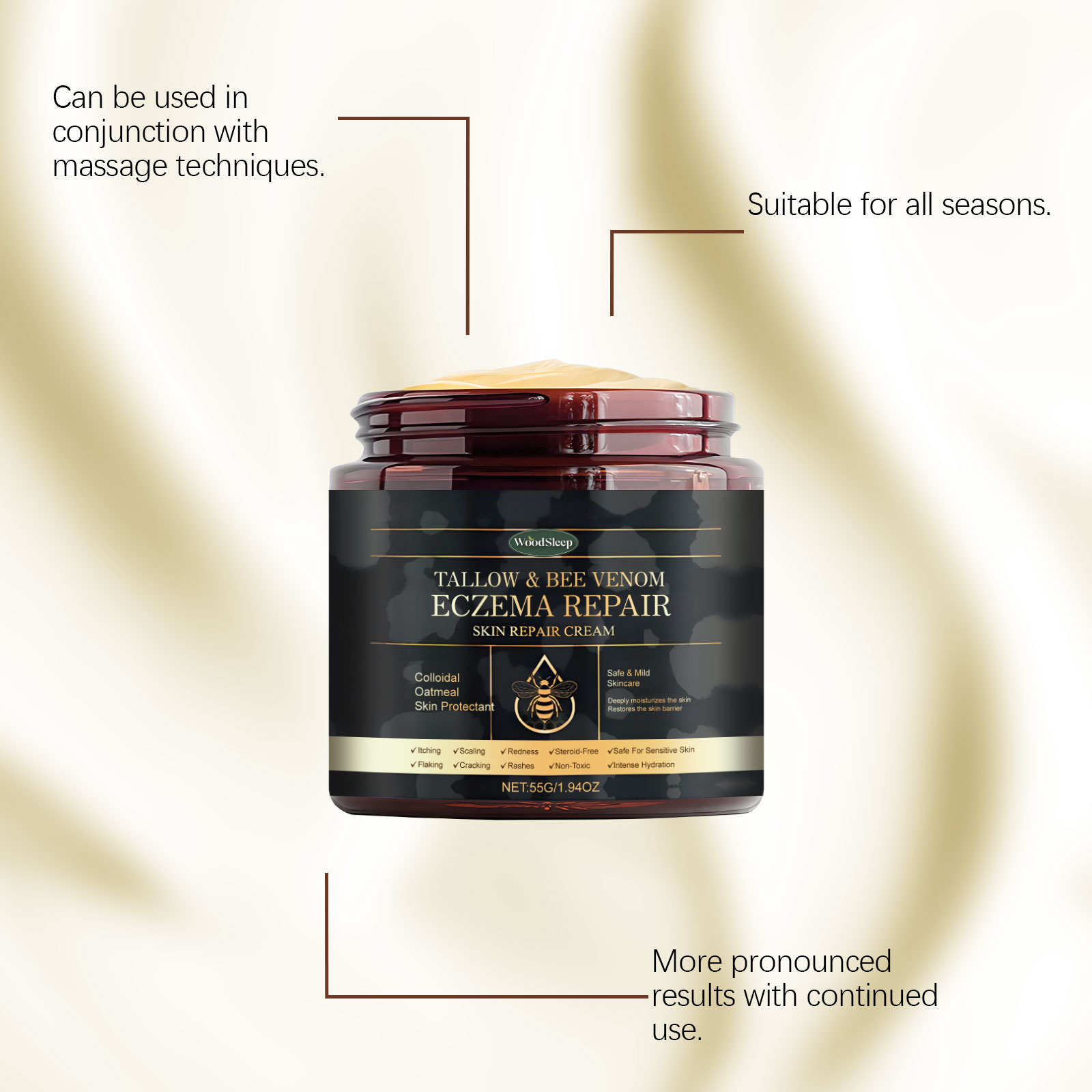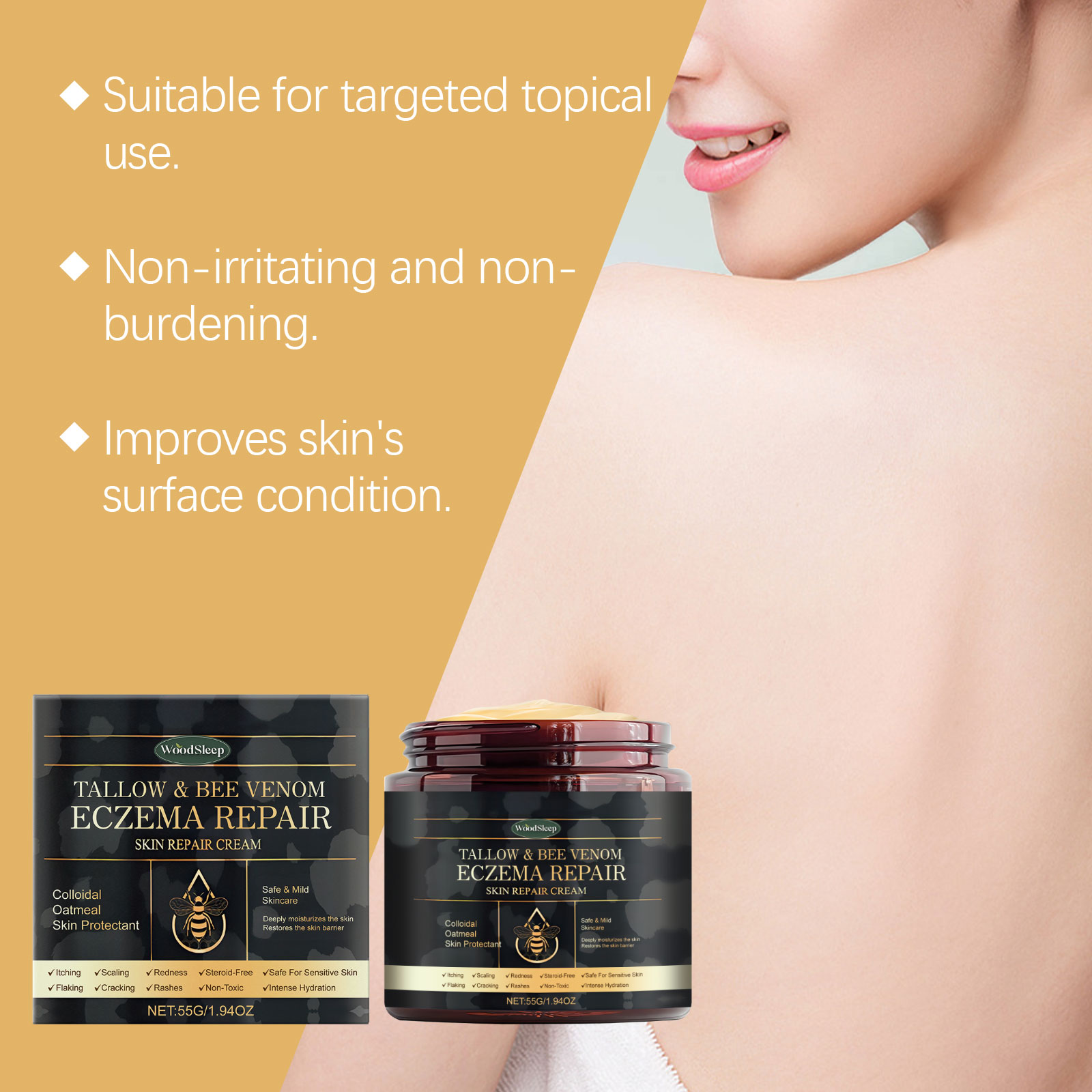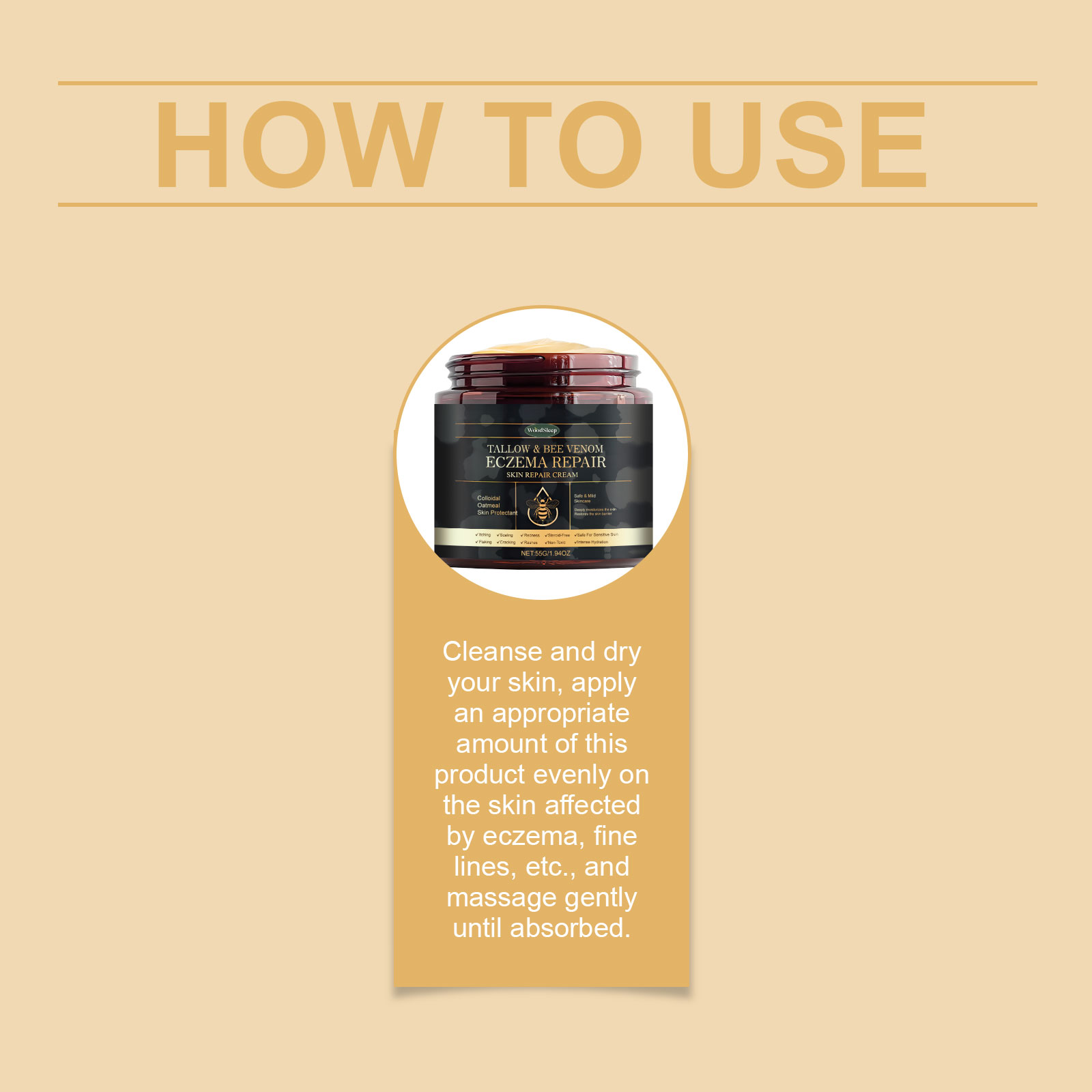 我们的皮肤护理霜,由牛脂、蜂毒精心调配而成。专为修复肌肤屏障设计。使用方法极为便捷:清洁肌肤并保持干燥,取适量本品均匀涂抹在有湿疹、细纹等受影响的肌肤上,轻柔按摩直至吸收。并且它可以缓解神经性皮炎、痤疮粉刺、皮炎、脂溢性皮炎、毛囊炎、热疹疤痕、顽固的黑斑、细纹、皮肤老化、疣、粉刺和、其他皮肤问题。