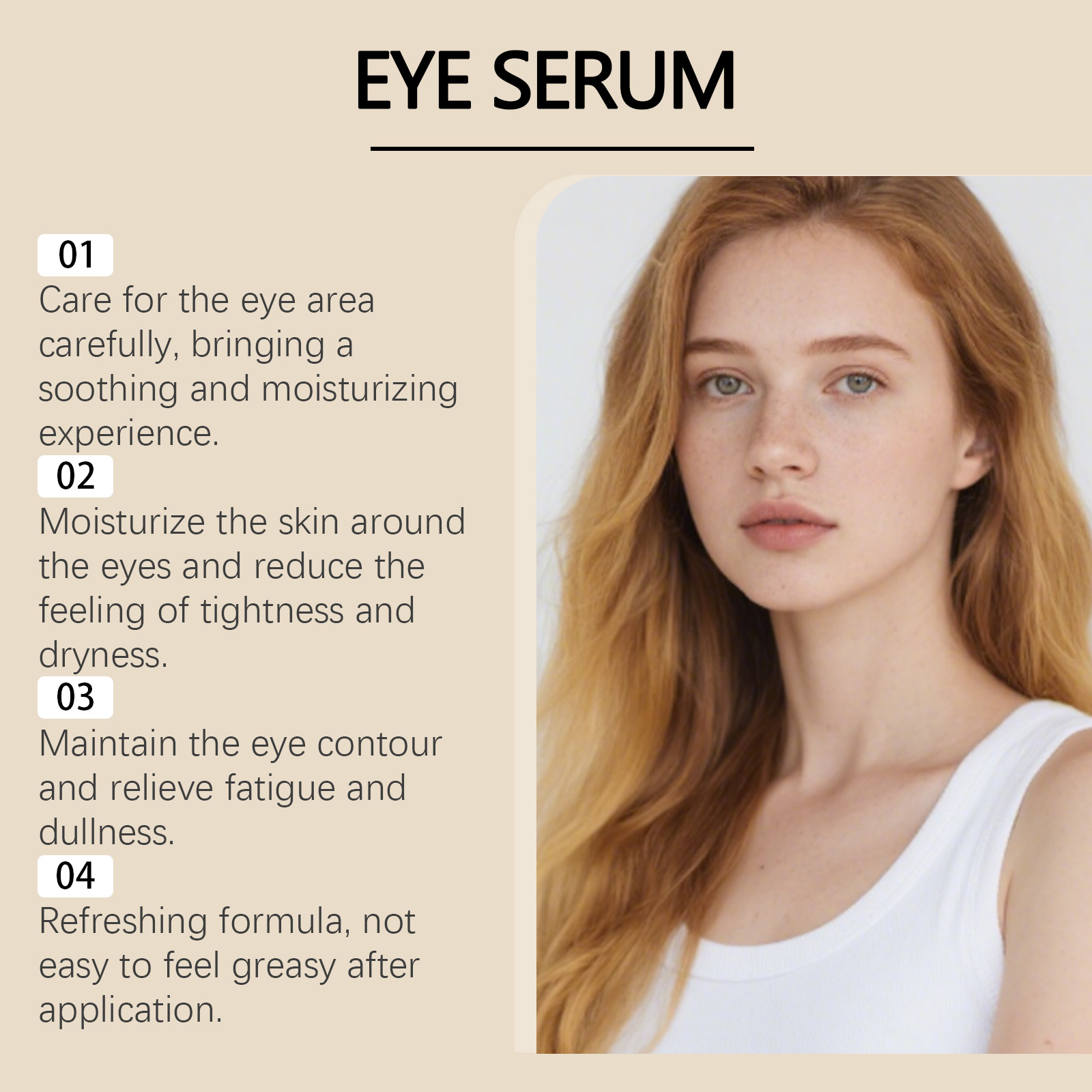 我们的眼部保湿精华,由甘油、1,2-己二醇精心调配而成。专为紧致您的眼周肌肤,提升弹性,改善松弛下垂问题,有助于淡化细纹干纹,令您的眼部肌肤平滑更显年轻设计。使用方法极为便捷:1.清洁眼周肌肤并保持干燥。2.取眼部精华绿豆大小的用量于指腹搓热,再均匀涂抹于眼周,由外向内轻柔打圈按摩至吸收,切勿拉扯肌肤。并且它可以深层滋养修护,柔嫩滋润脆弱眼周肌肤,有助于舒缓眼部不适,减轻干燥、疲劳与紧绷感。