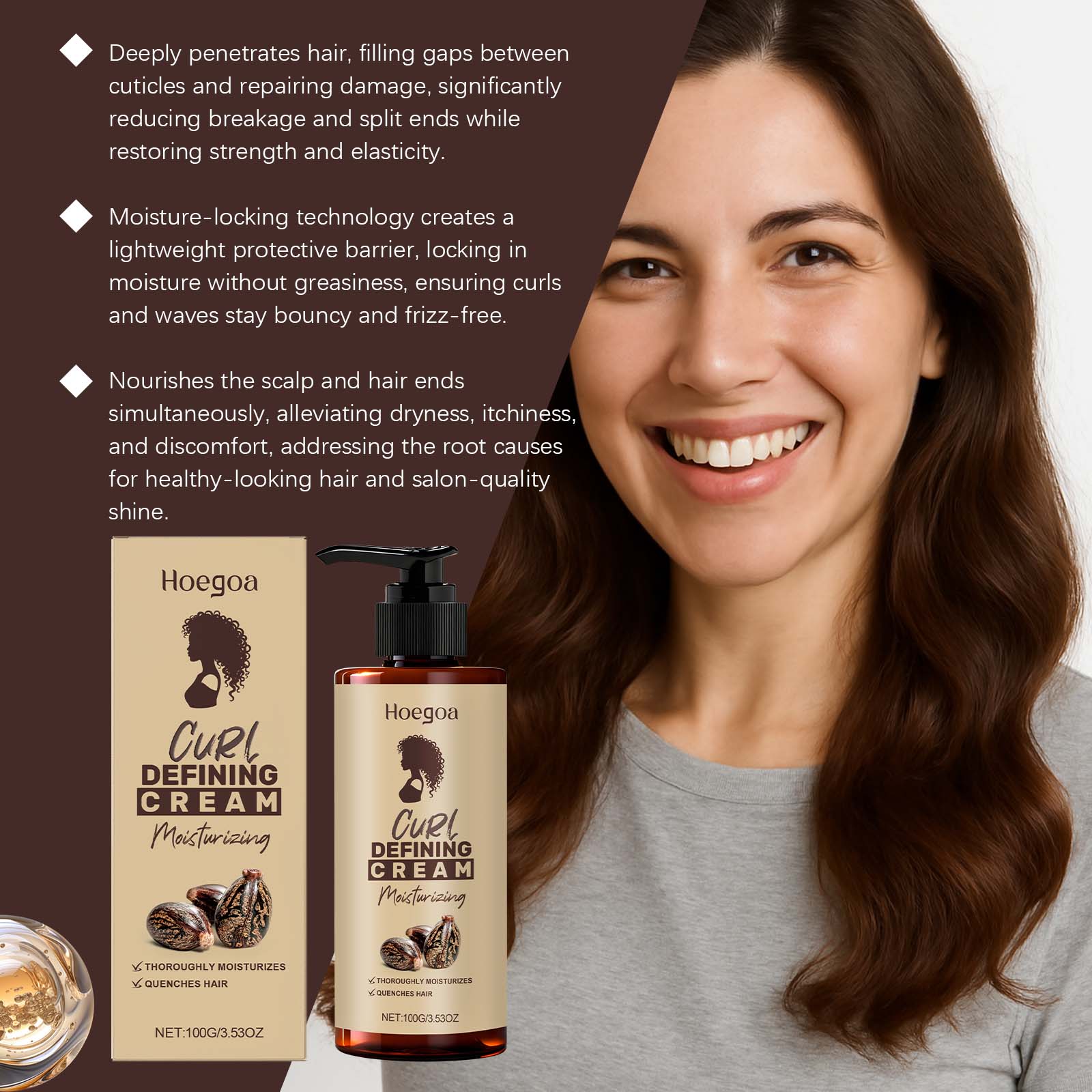 我们的卷发定型霜,由南瓜籽油、霍霍巴籽油精心调配而成。专为填充受损的发质角质层并修复脆弱易断的头发设计。使用方法极为便捷:取适量本产品均匀涂抹在头发上。用手指或梳子将头发塑造成所需的发型。并且增强卷发并帮助保持造型。